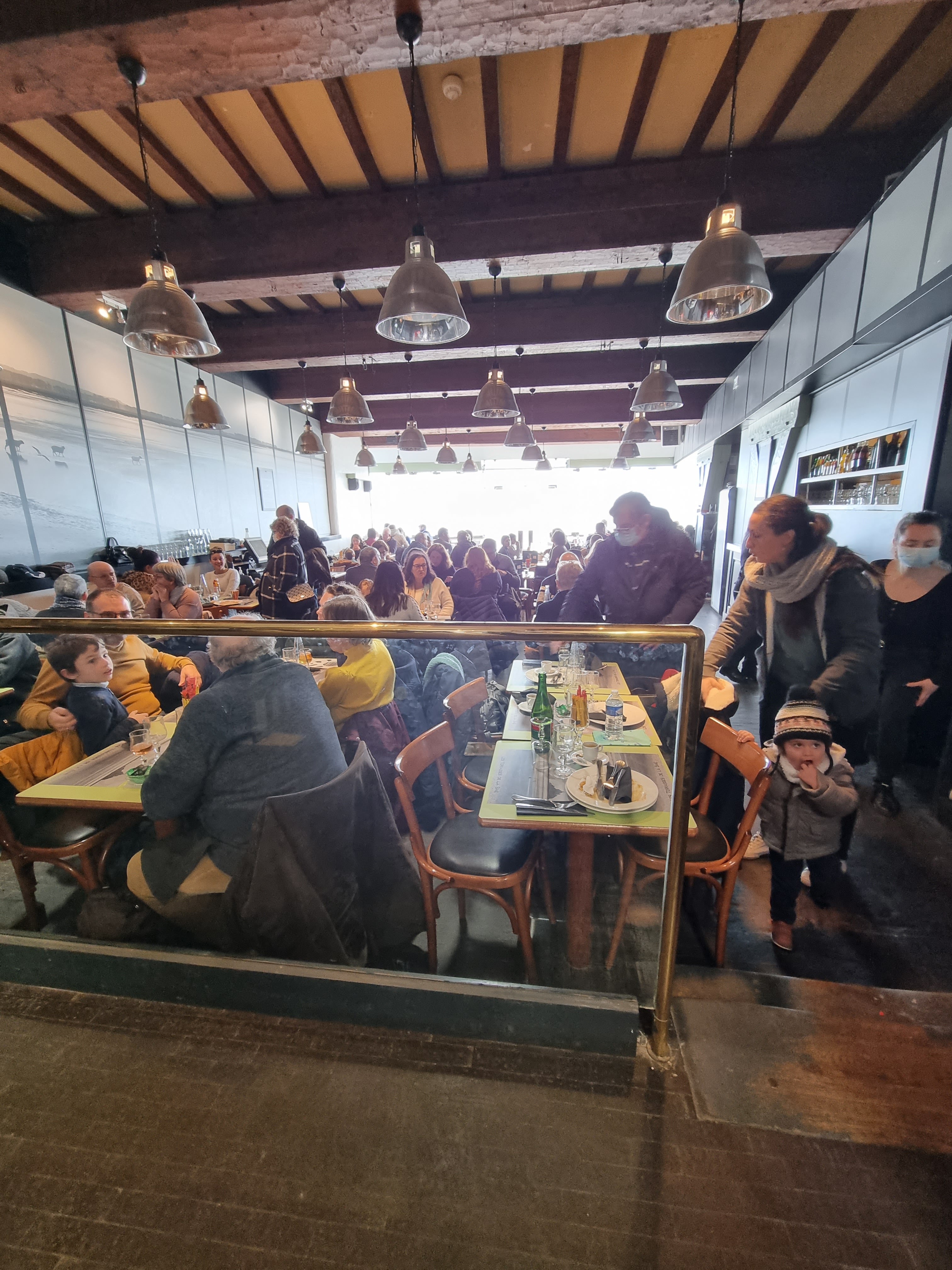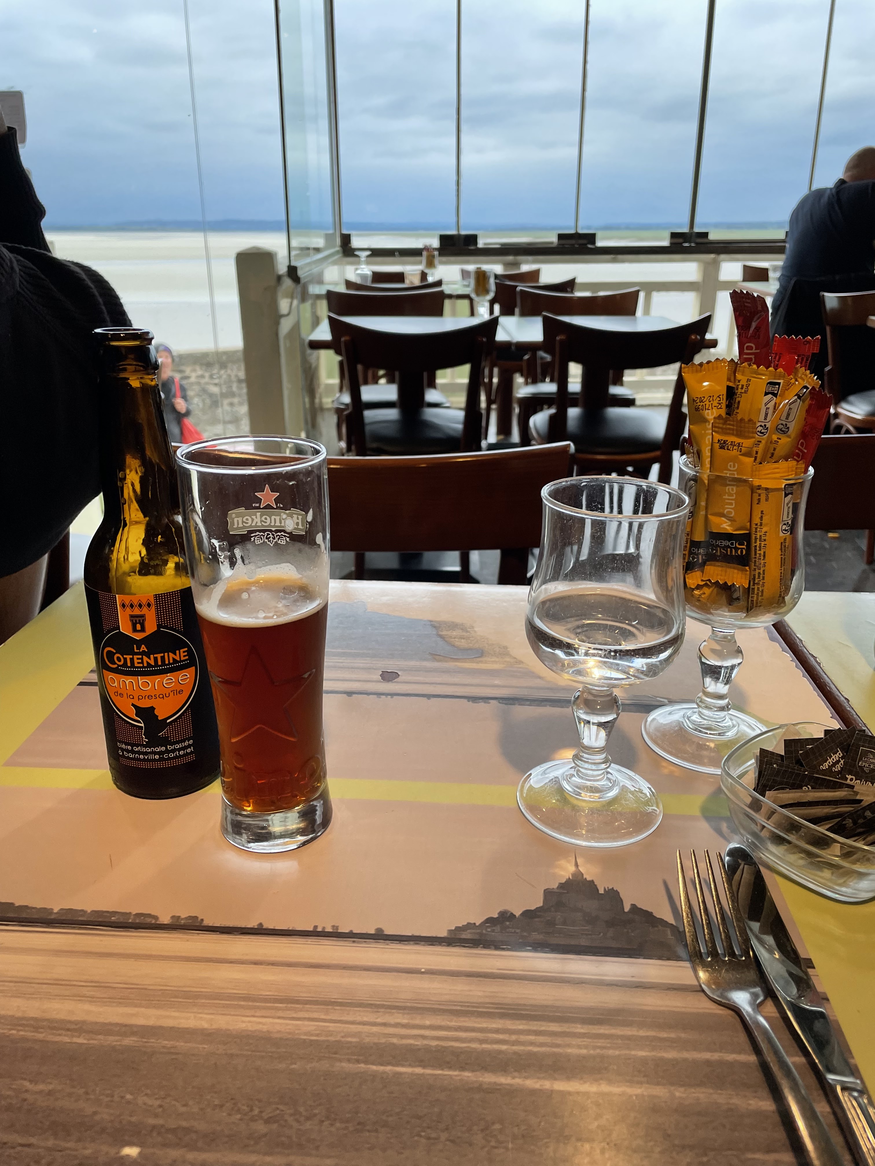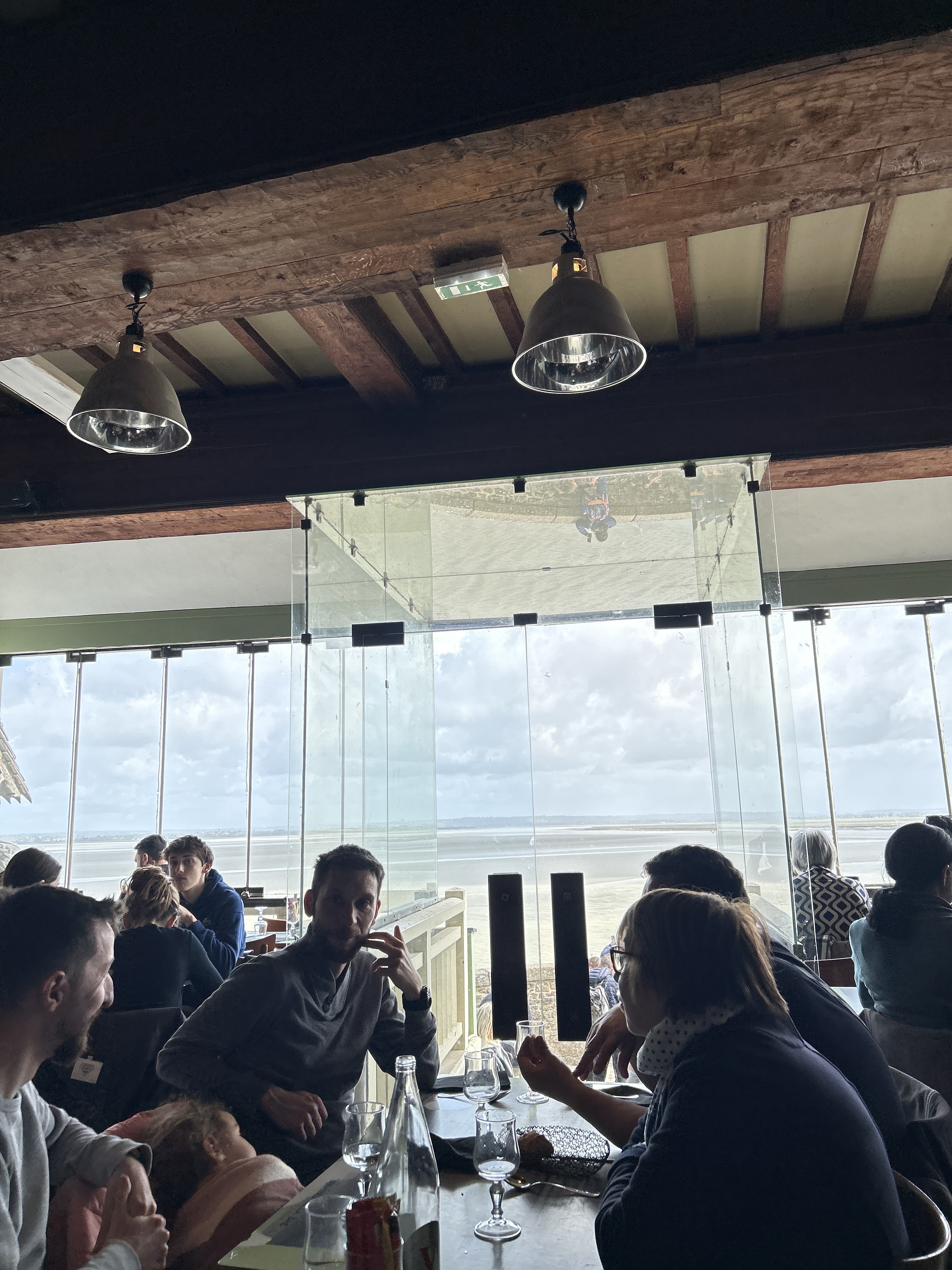 Nous avons déjeuné dans une grande salle très lumineuse avec de grandes baies vitrées face à la mer, avec vue sur la baie du Mont Saint Michel. Par chance très bien placés près de la vitre. La cuisine et les prix sont corrects pour ce lieu très touristique, le service est aimable et rapide. La salle est un peu bruyante mais même au mois de Mars il y a affluence.