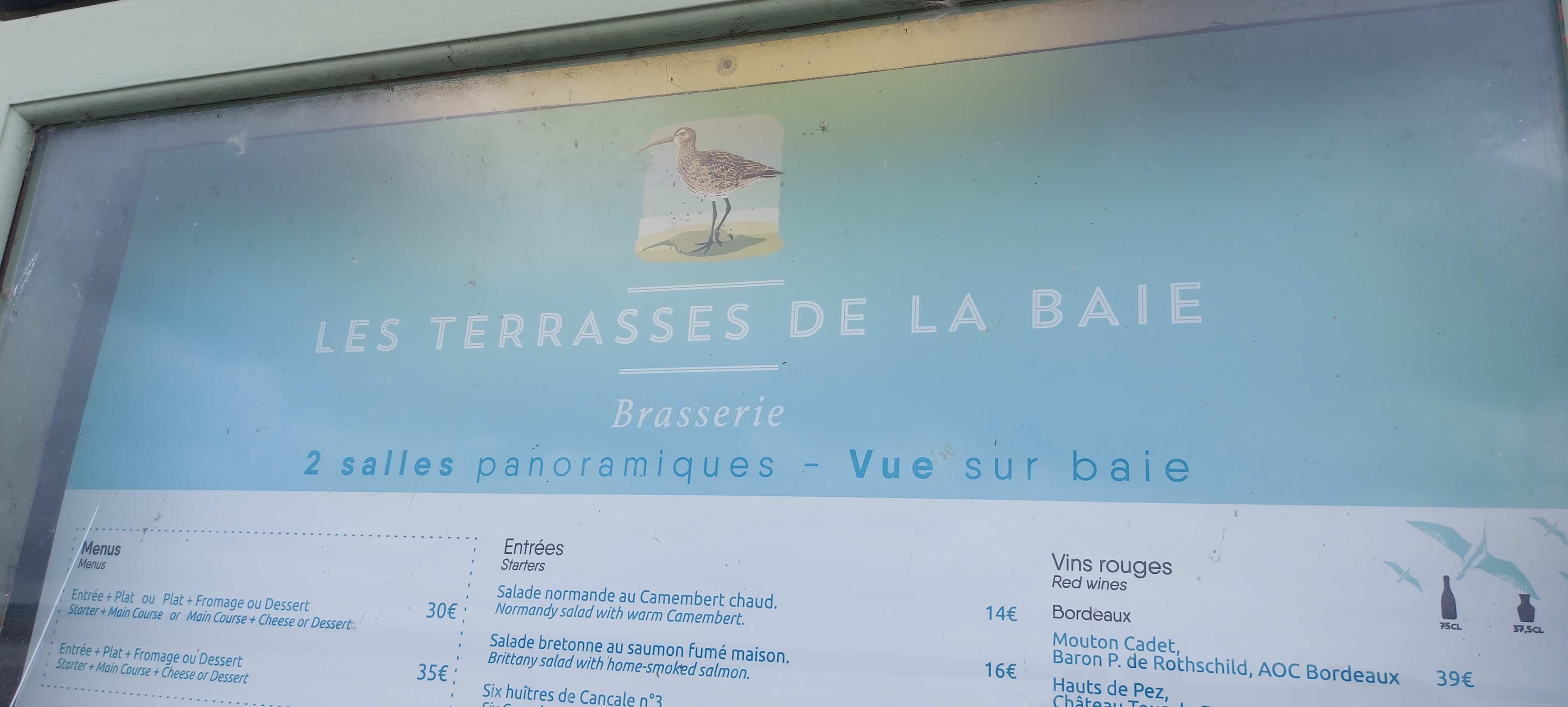 On choisit ce restaurant car la vue sur la baie est magnifique mais c’est uniquement pour ça qu’on le choisit. On y mange pas très bien … vu la rapidité des plats et surtout leur goût, on sent qu’on mange du surgelé. On a pris des moules et elles étaient très petites, mon mari a pris une mousse en dessert et moi une tarte normande et on sentait que c’était du surgelé. le restaurant n’est pas très propre (les WC sentent la pisse et au niveau des vitres qui donnent sur la vue, on voit des toiles d’araignées, des fourchettes et papiers sur les rebords des fenêtres). Bref on ne refera pas ce restaurant. On est content d’avoir pris un plat pas très cher du coup.
