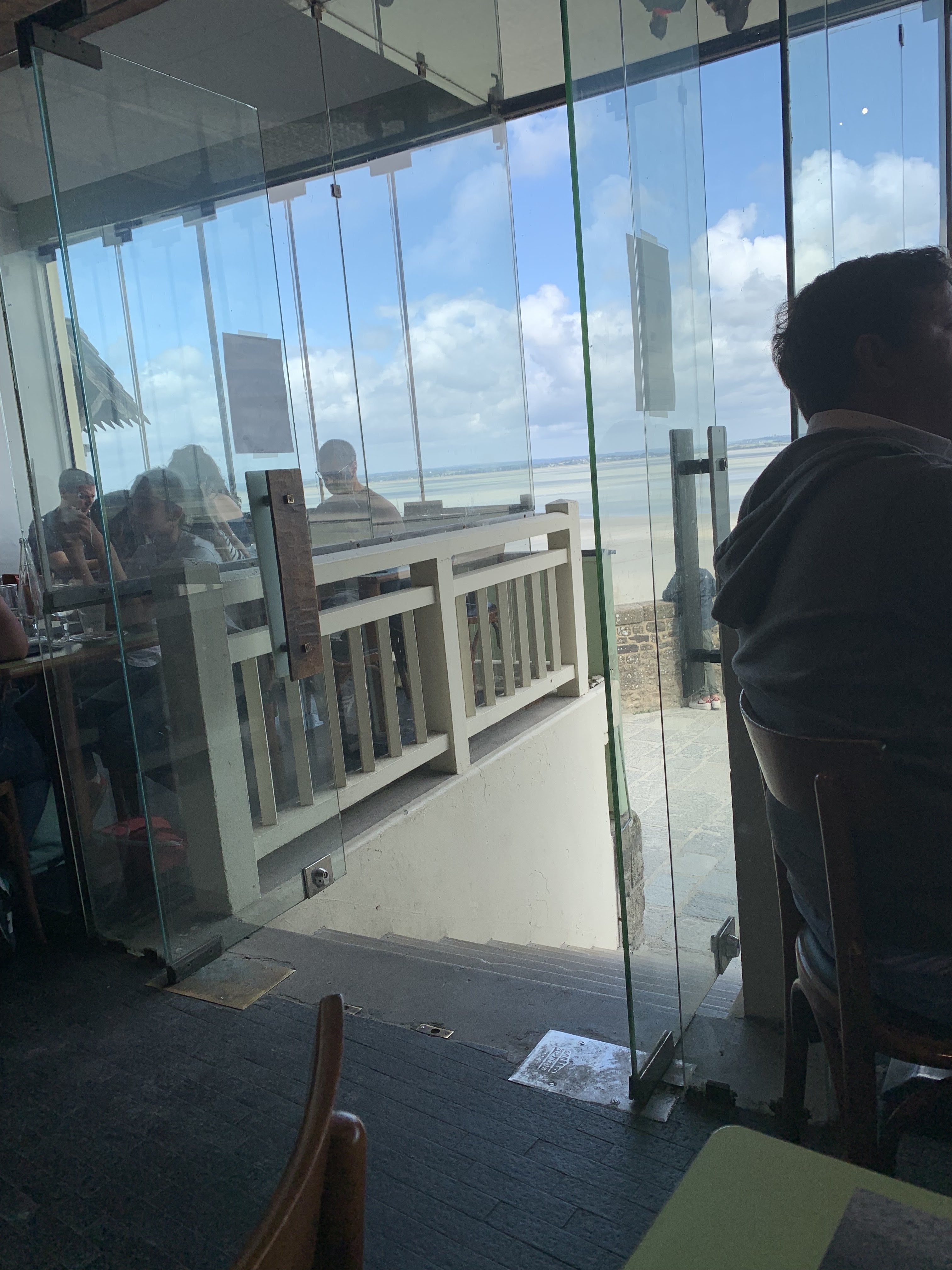 Tellement déçue pour un restaurant au Mont saint Michel.. La vue est certes très jolie sur la baie. Mais le service est bien trop rapide, a peine finit déjà débarrassé.. Les serveurs viennent sans cesse voir si vous avez finis, trop de stress. Mais le pire est la saleté de la salle et des toilettes... Des vitres d'une saleté incroyable ! Des toiles d'araignées et un sol pas nettoyés depuis au moins une semaine.. Le carpaccio de tomates en entrée n'en ai pas un, c'est juste des tomates en rondelles... Lorsque nous reviendrons au Mont, nous aurons manger ailleurs, dommage..