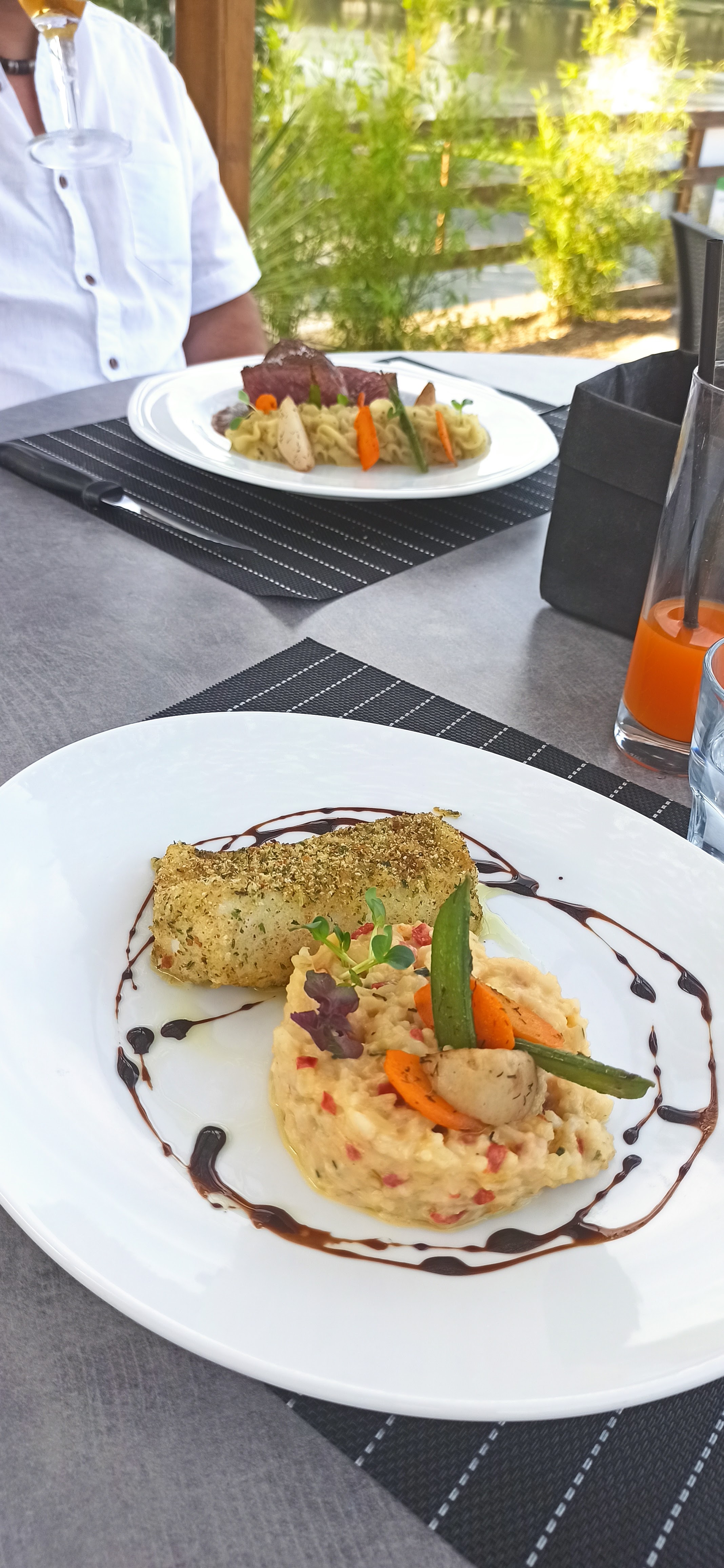 Très bon repas en terrasse avec de belles assiettes