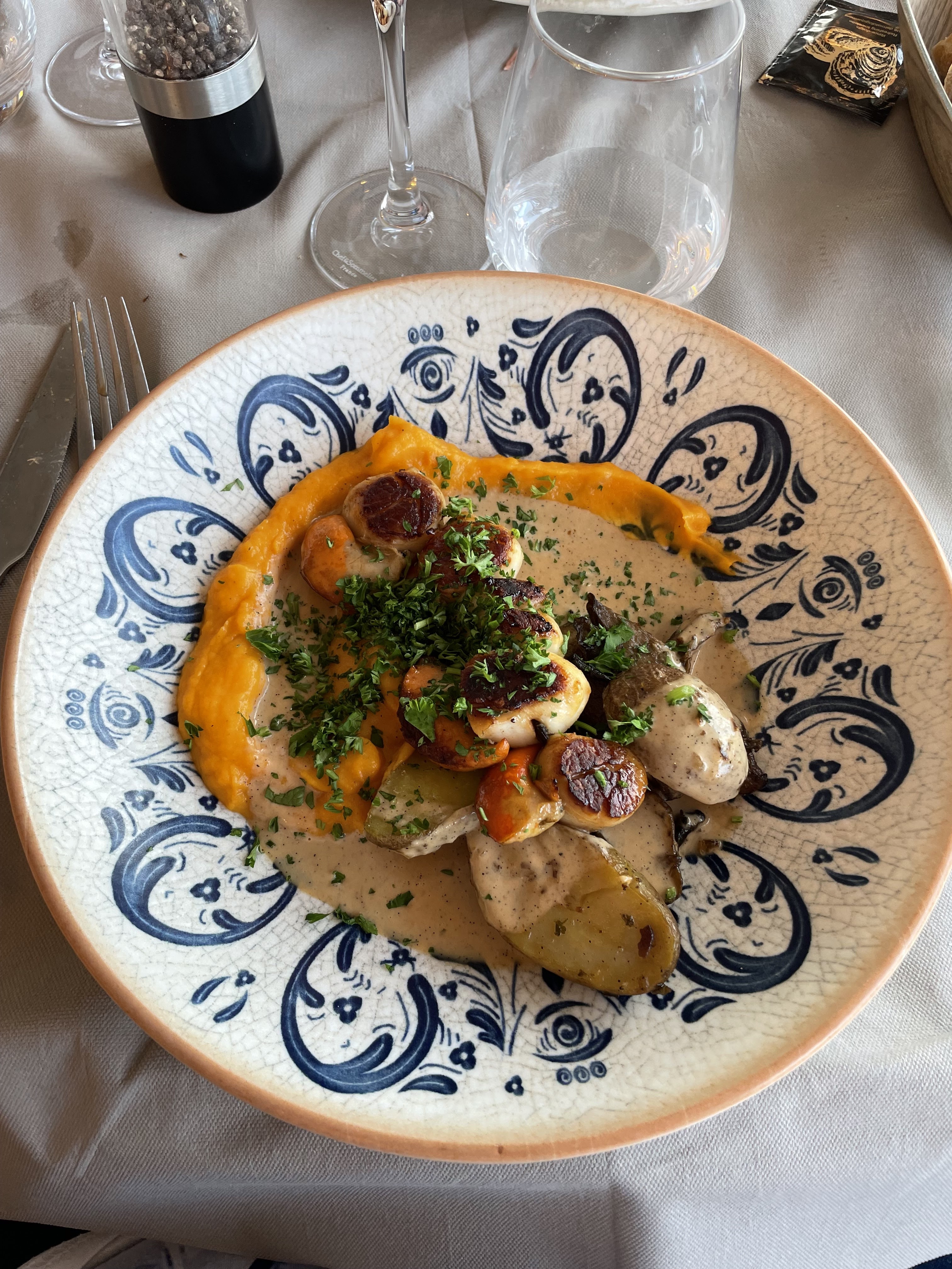Un restaurant vraiment très sympa. Malheureusement, nous avons été déçus par nos plats. Mon conjoint a eu un plat réchauffé, ce qui est dommage pour des Saint-Jacques. Quant à moi, j'ai pris des moules avec beaucoup de sable, ce qui est également dommage. Cependant, le personnel est au top et la vue est magnifique.
