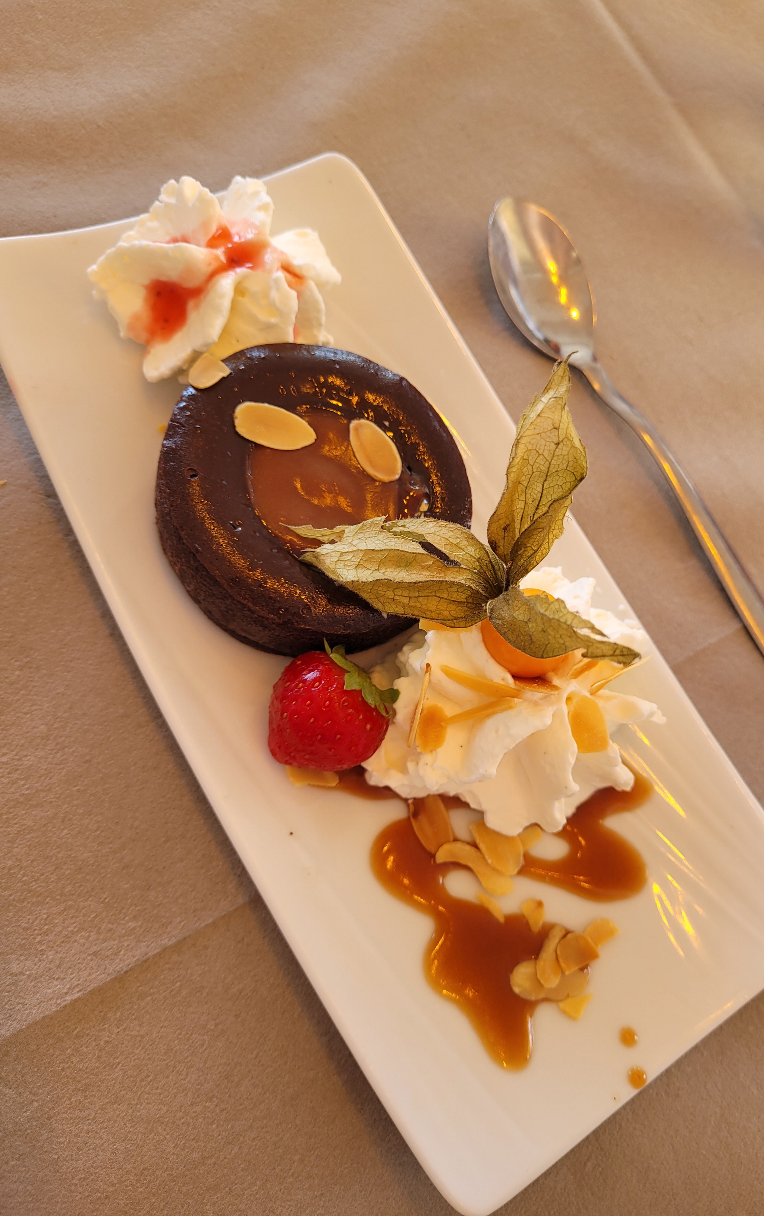 Lieu agréable belle vue sur la mer, chaleur présente Services super Serveuse gentille Plat de qualité Petit bémol sur le fondant au caramel non fondant et trop de jus avec le macaron Mais allez y