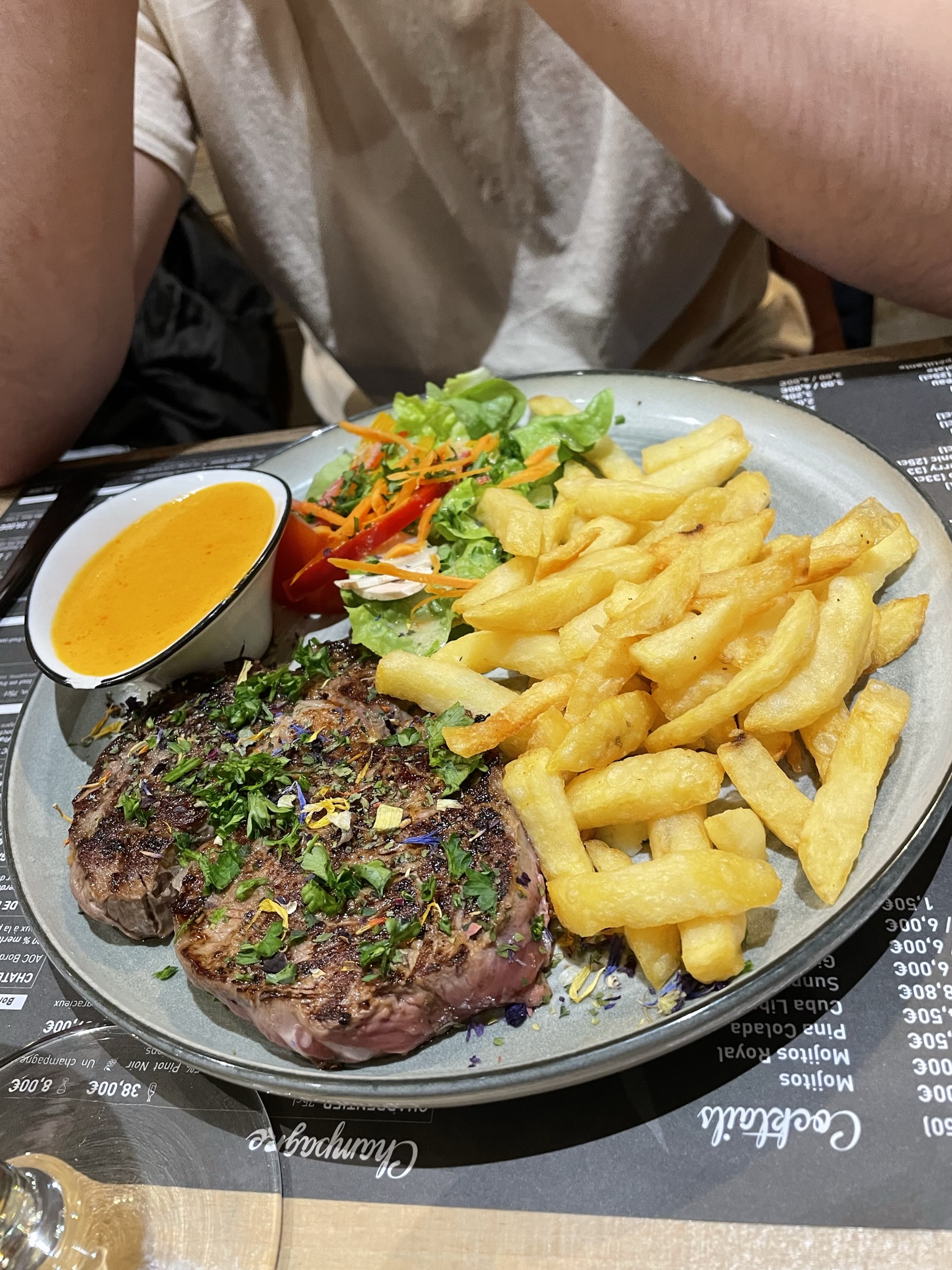 Repas en terrasse et même s’il ne faisait pas très beau nous n’avons pas eu froid. Repas excellent de l’entrée au dessert. Nous reviendrons avec plaisir et conseillons cette adresse à tout le monde.