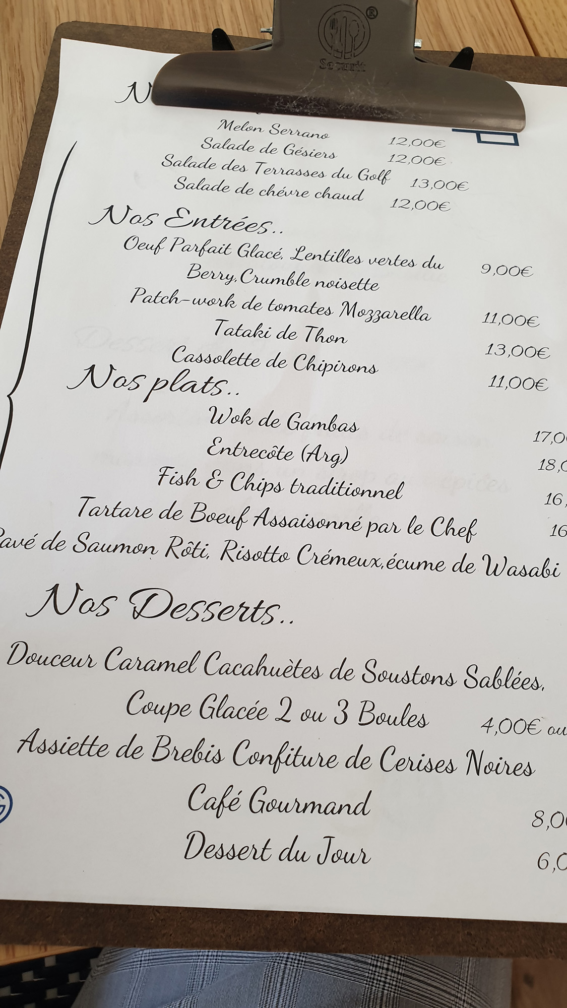 Une soirée juste parfaite avec un menu 3 plats au prix plus que raisonnable. De l’entrée au dessert en passant par les plats et les vins, la créativité et la passion du chef (sympa, en plus !) se déclinent magnifiquement dans les assiettes. Avec une vue sur le golf … et la chance de pouvoir en profiter en soirée ! On va y retourner, c’est sûr! 😉