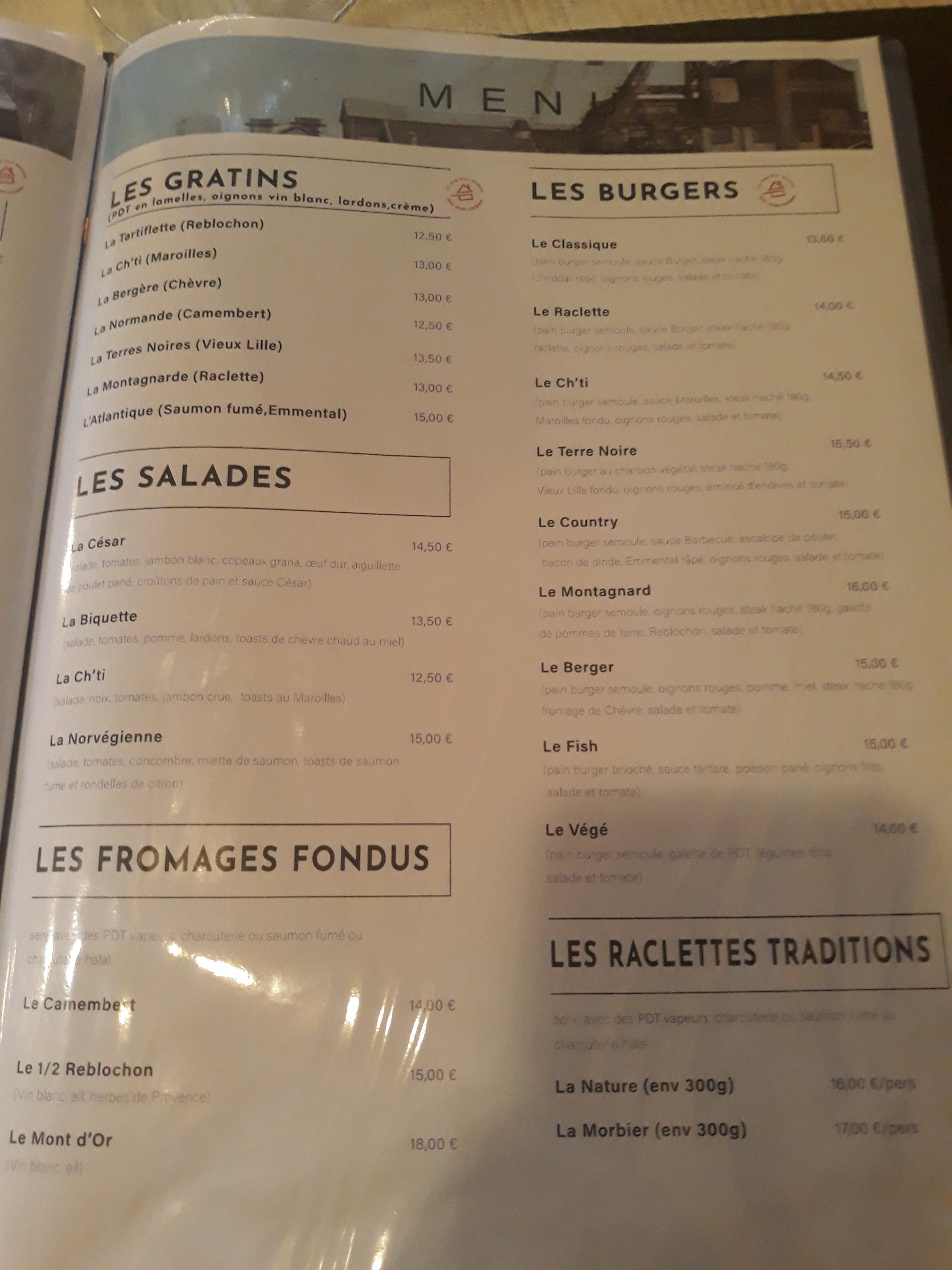 Visite un samedi soir : Cadre et accueil sympa. Proposition du soir raclette pas très chti ! Nous commandons un apéro et une planche mixte très bien. Pour ma part je prends un potche car la serveuse me dit qu il est fait sur place sauf qu il n a rien d un potche maison. Ma femme prend un plancha volaille : viande en quantité mais trop épaisse 4 rondelles de courgettes pas de champignons ni de poivrons comme indiqué sur la carte. Nous prenons une bouteille de vin blanc pas d ice bag ou de seau ! Pour ma part le concept n est pas clair entre chti et montagne. Le personnel est gentil mais manque de formation. La carte est trop grande pour assurer une garantie de fait maison. C est plus un resto type grande chaîne qui n apporté rien de nouveau. Le resto du midi entre collègues ou avec des enfants. Dessert très bon !