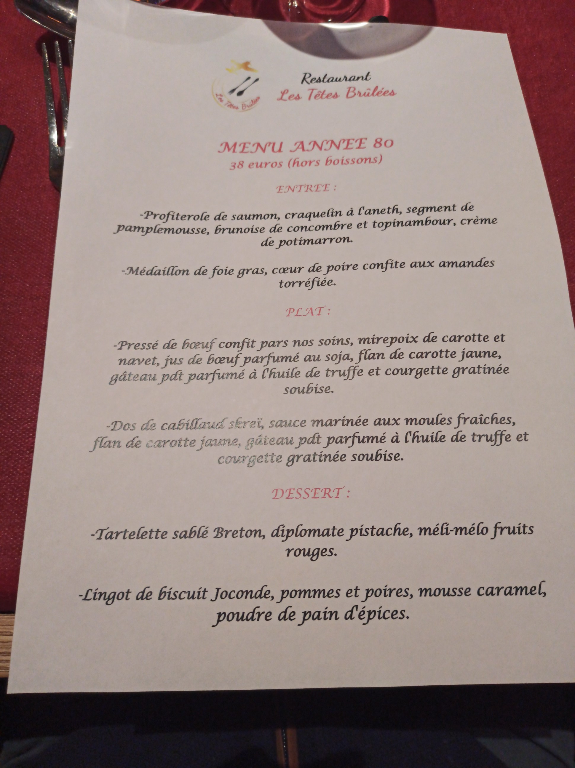 Soirée année 80, repas delicieux belle présentation accueil chaleureux avec le sourire, service au top! Bon déroulement de la soirée et bien organisé, danse entre chaque plat. Bonne ambiance, nous reviendrons! Je recommande vivement !