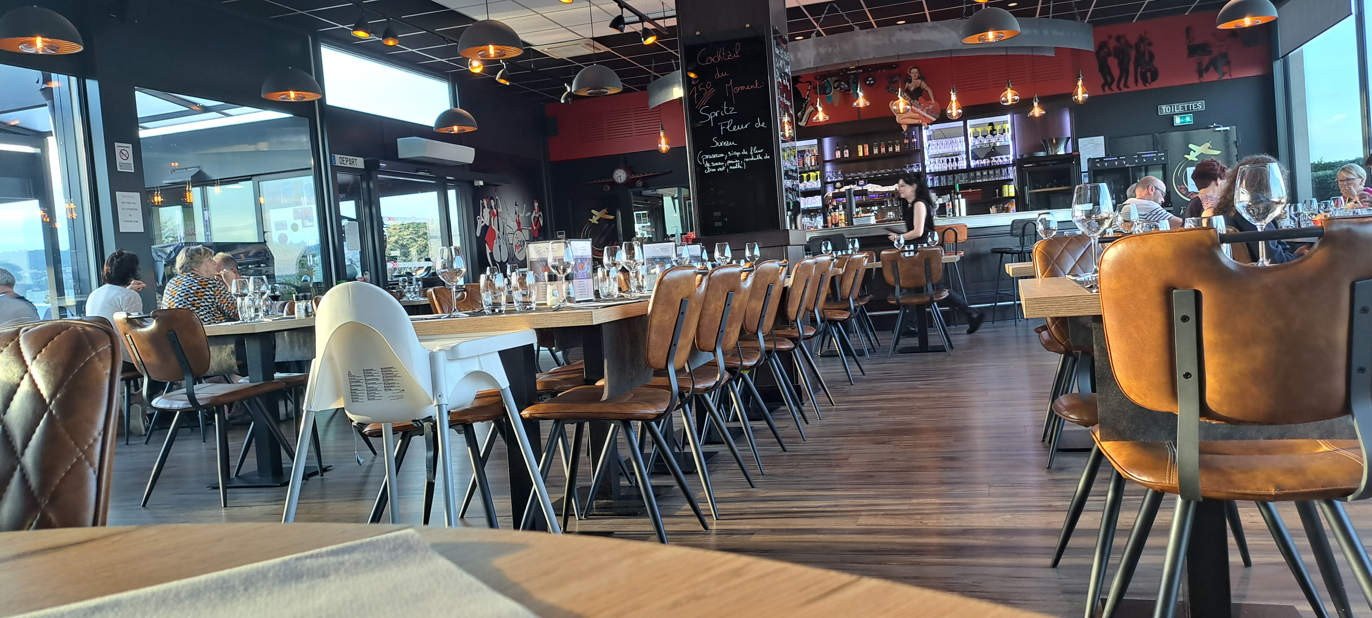 Accueil au top, service rapide, deco sympa sur le thème de l'aviation (le restaurant est en bord de piste avec de sgrandes baies vitrées pour observer les avions). Mais c'est surtout la nourriture qui vaut le detout, avec une carte bistrot haut de gamme qui surprendra vos papilles, et surtout des desserts à tomber. Esperons que le futur cuisinier qui prendra bientot la releve de l'actuel sera a la hauteur.