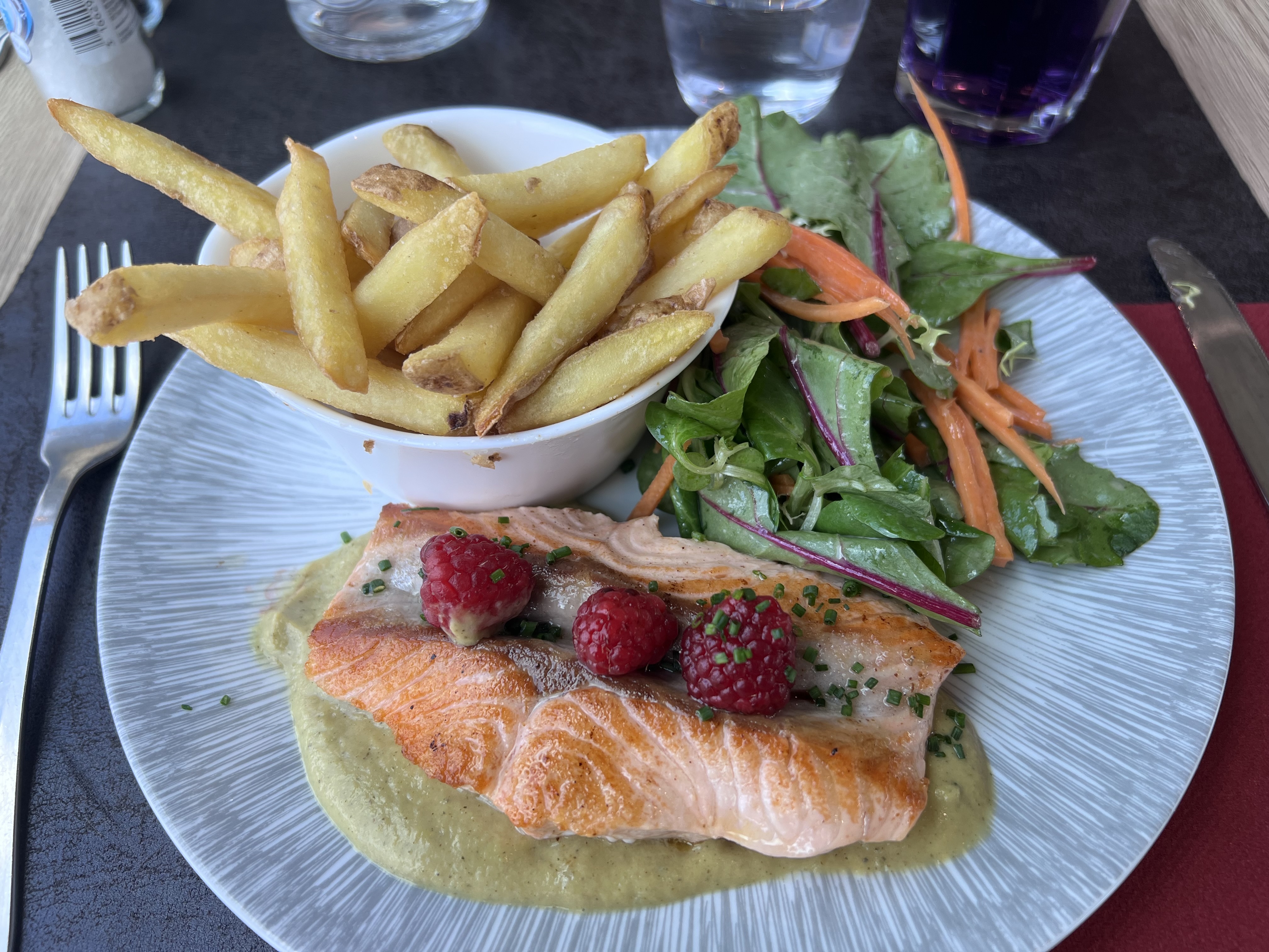 Jolie découverte ! Des plats originaux avec de bons produits, de la couleur, des saveurs. Si on le précise, on peut avoir une table juste face à la piste et voir le manège des avions et parfois des parachutistes. Le personnel est au petit soin et encore plus avec les enfants.