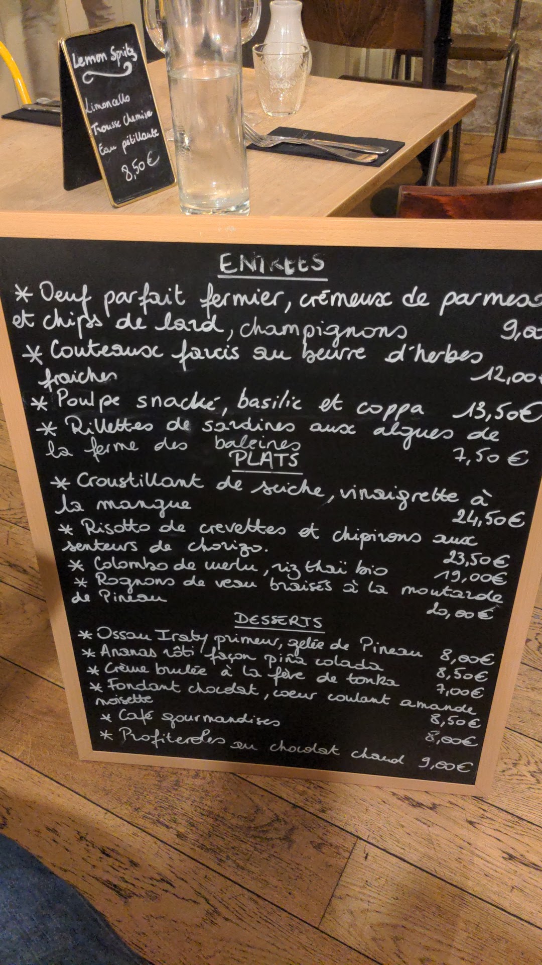 Nous avons dîné à 7 pour l'anniversaire de mon fils dans ce restaurant très sympathique dont les propriétaires ont eu la gentillesse de poser une bougie sur le dessert. Bel accueil, belle ambiance. Le rapport qualité/prix est parfait. Les plats sont goûteux, (le risotto de crevettes et chipirons, les couteaux farcis, le pain perdu), le choix varié, bien qu'avec une carte courte. Belle déco, cosy.
