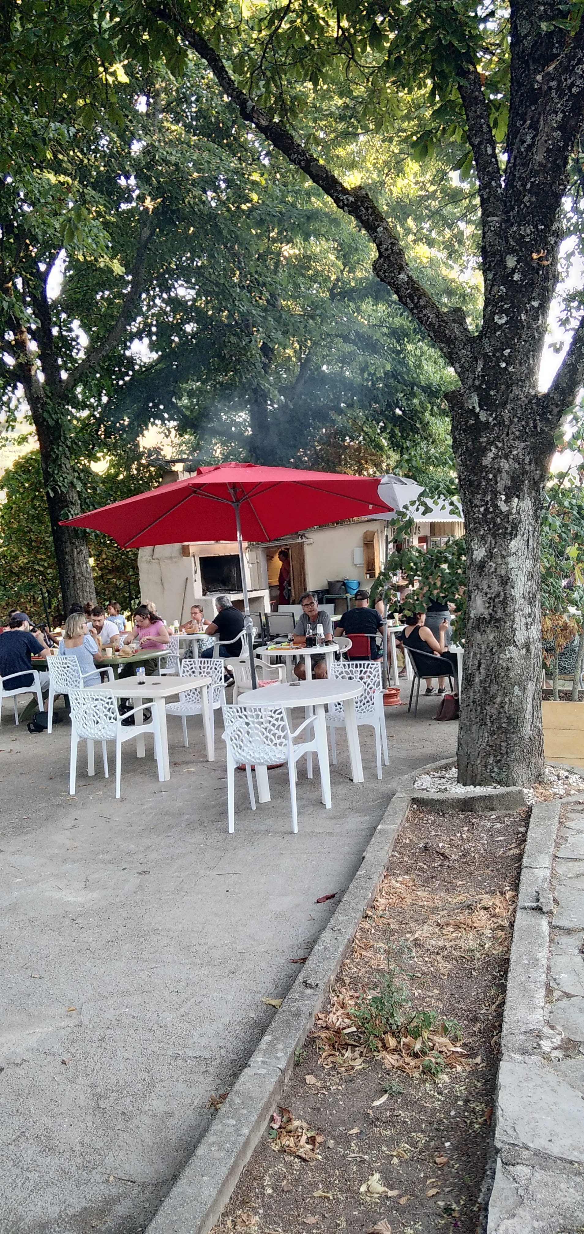Arrêt inopiné sur la route des vacances, accueil sympathique. Plat du jour parfait saucisse cuite au feu de bois devant nous. Et une terrasse ombragée dans un petit village au calme