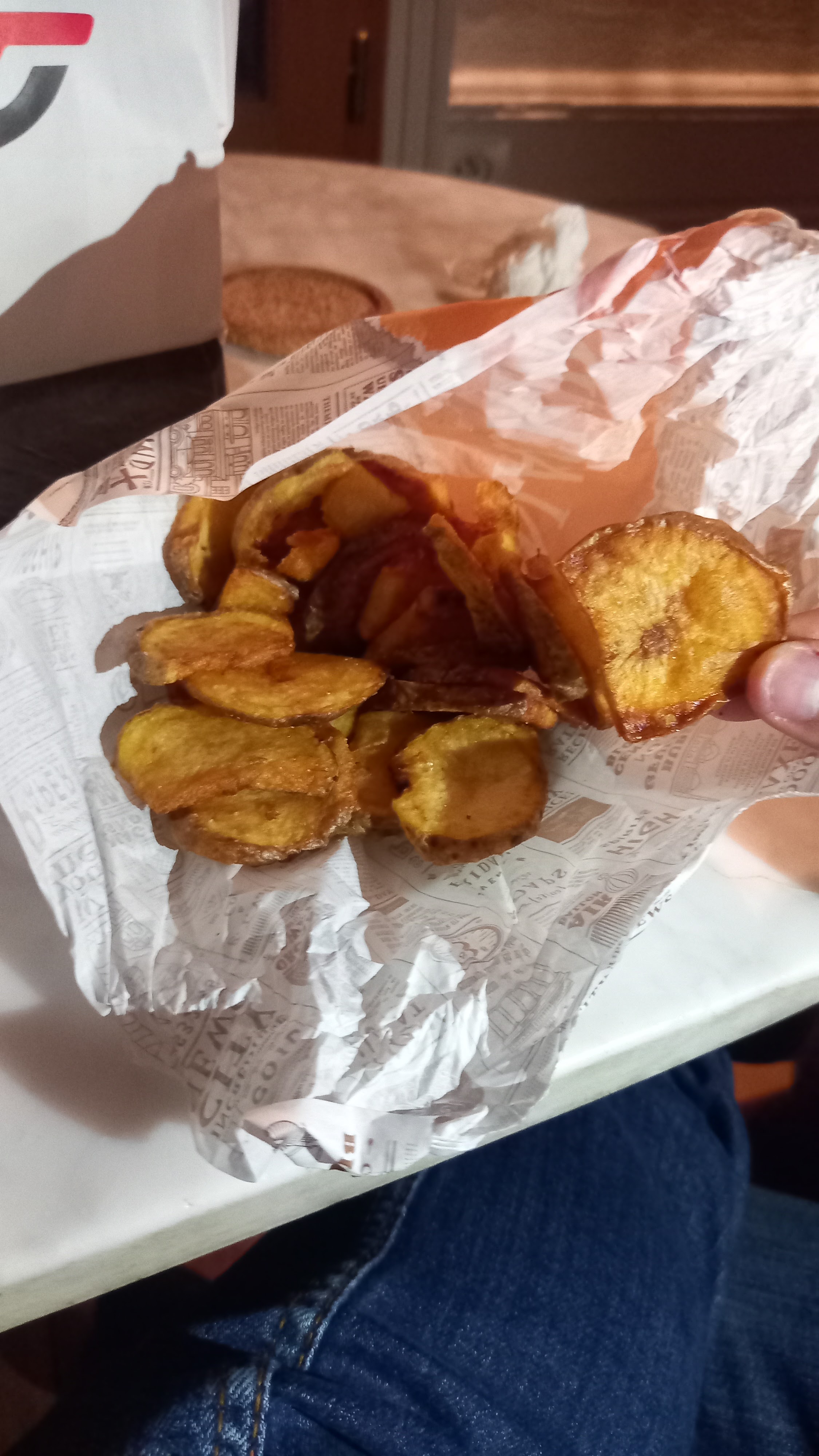 Porte du restaurant ouverte et donc nous avons remis nos manteaux pour déjeuner. Les frites sont des rondelles de pommes de terre sûrement précuites et le pain burger est très moyen. Franchement déçu, juste un endroit pour un en-cas, sans plus !