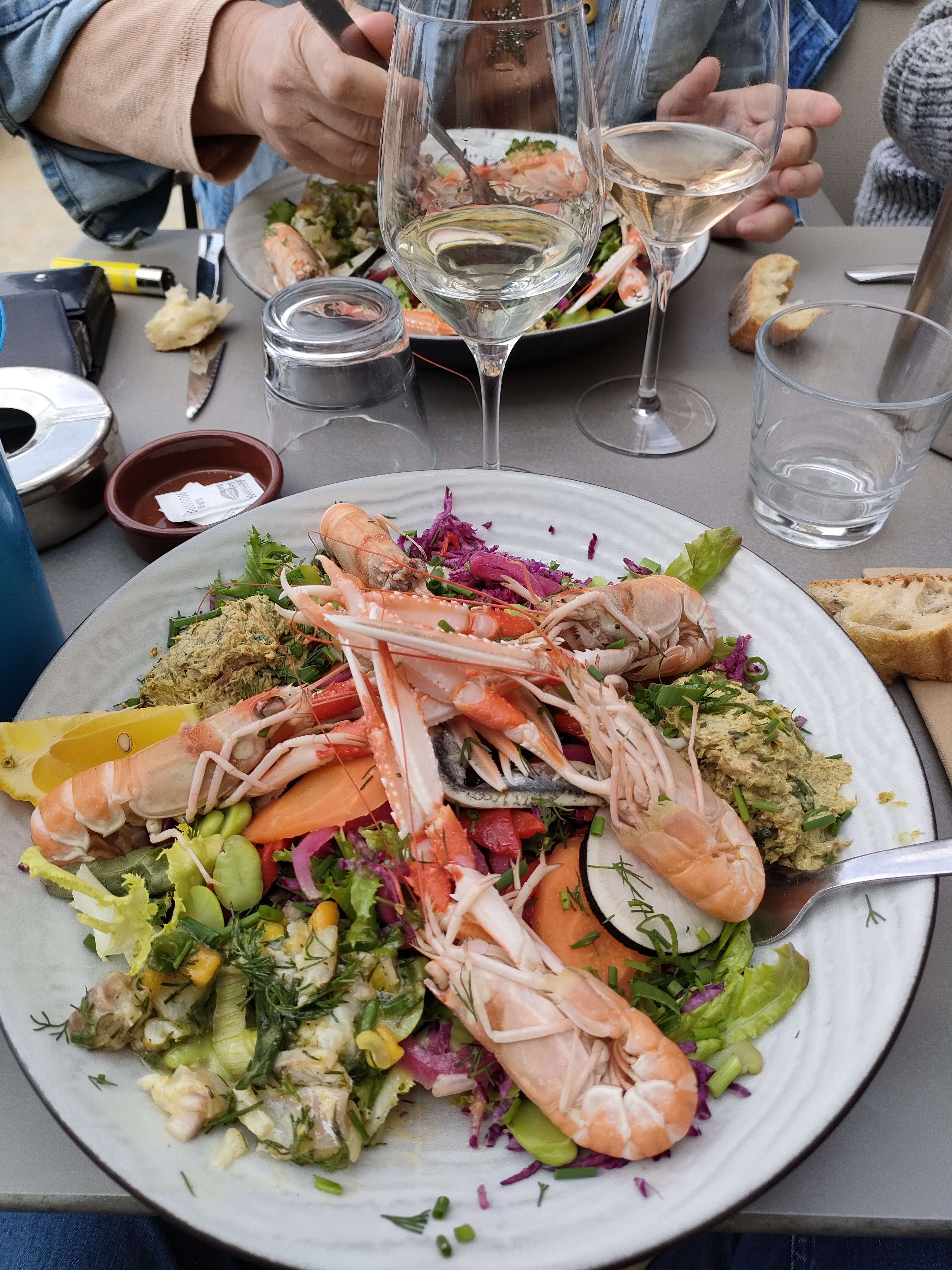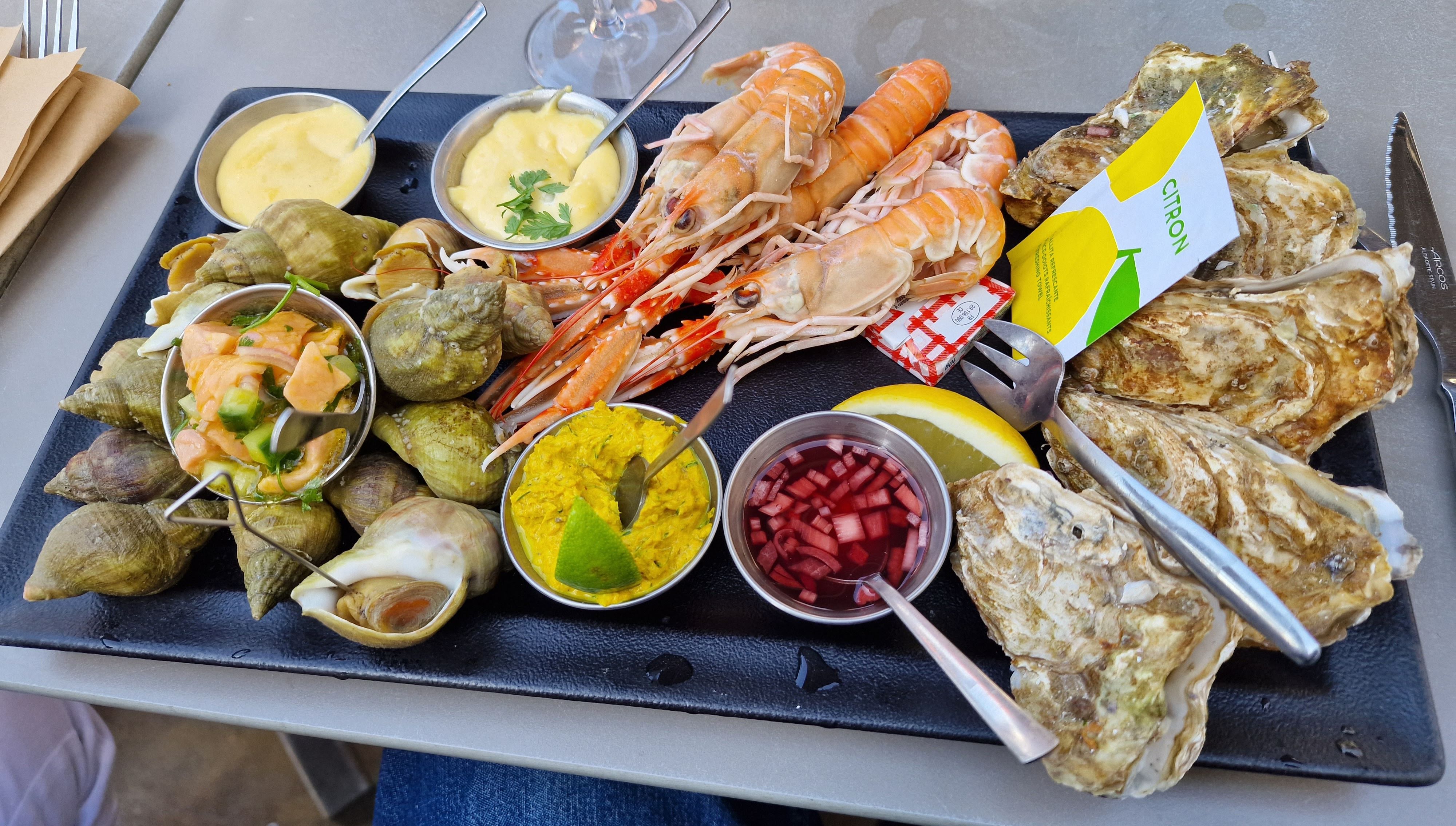 Petites huîtres face à un coucher de soleil, quelle merveille. Grande salade aux mille couleurs et saveurs, quel bonheur. Enfin, un café gourmand très surprenant. Petit plus pour le serveur rouquin , j’en ferai bien mon copain !