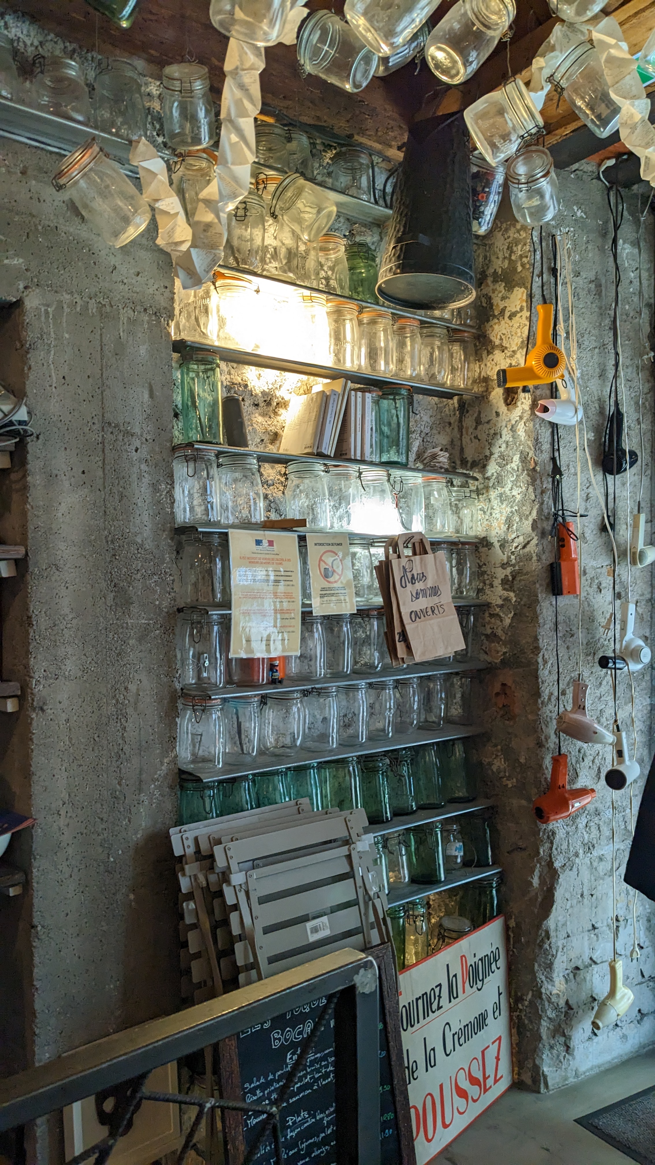 Endroit atypique , sympathique er décevant Assez cher finalement car presque 10 euros un petit bocal comme plat principal et peu copieux. Le jus de pomme non bio servi en bouteille et meme pas du coin !!! Dommage