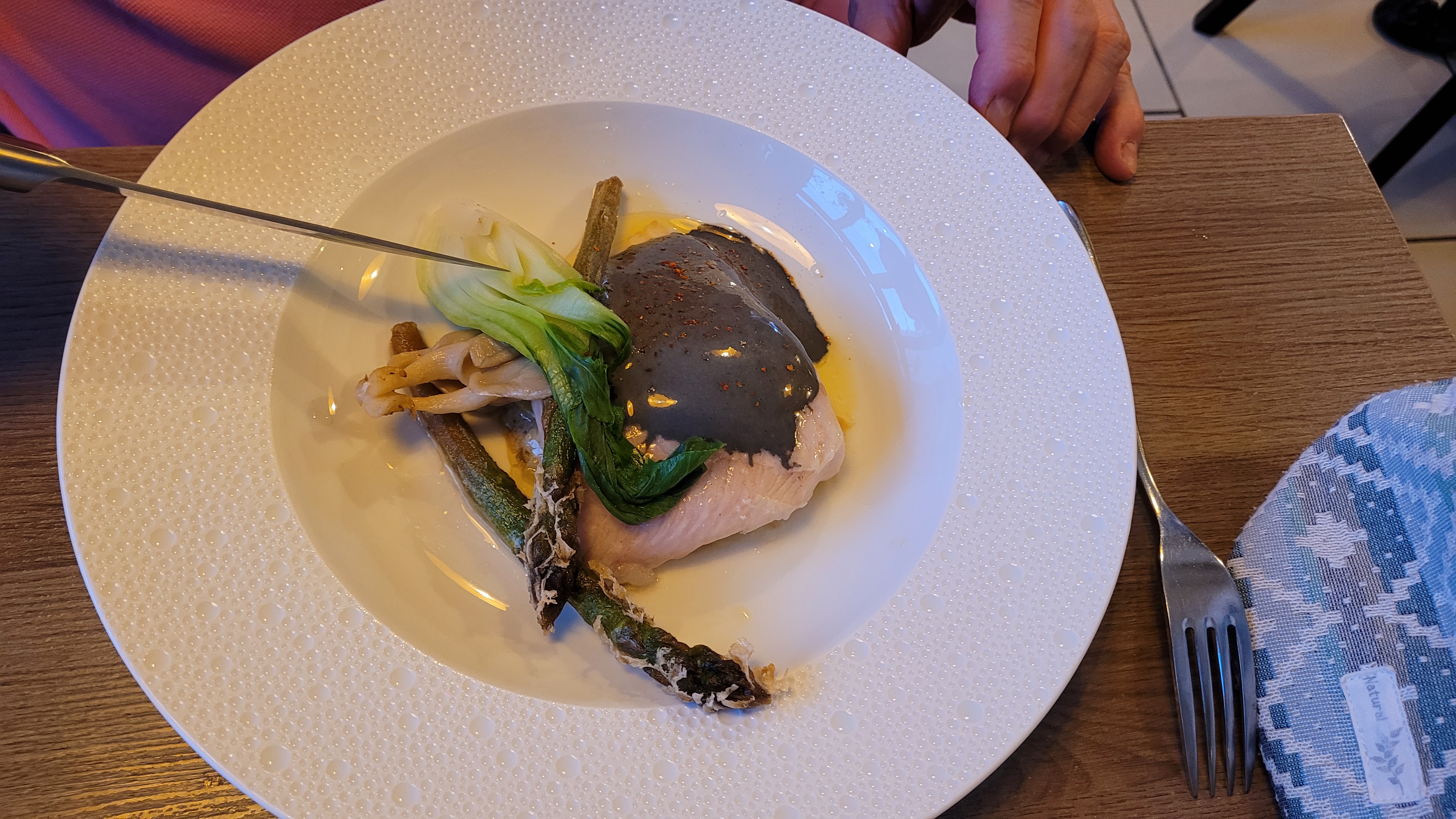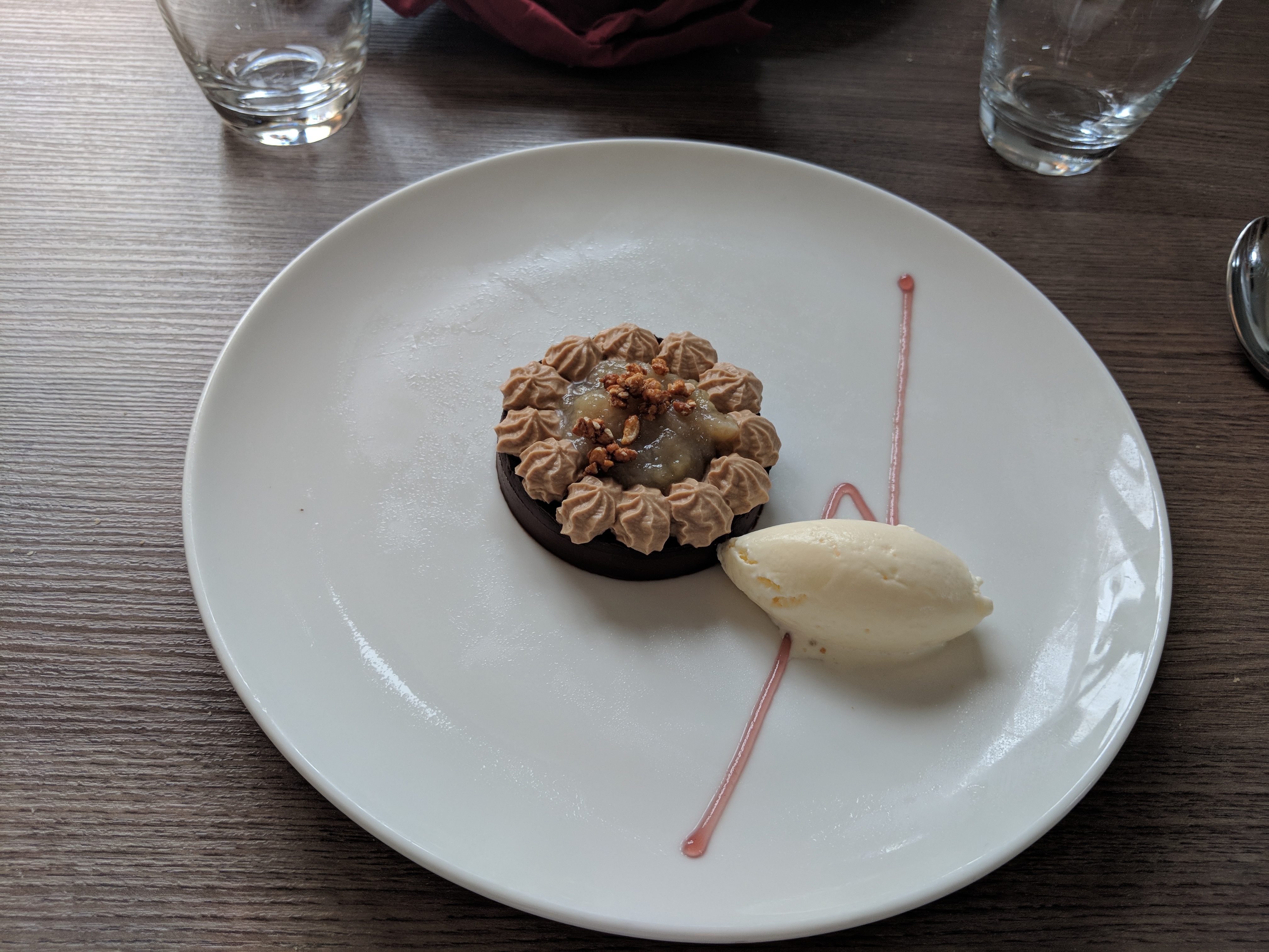 Nous avons pris le déjeuner à 3 plats qui était vraiment délicieux. Ce restaurant est géré par le chef seul, il y a donc un peu de retard dans le service des plats, mais sinon, vous obtenez une cuisine vraiment délicieuse à un bon rapport qualité-prix. Le restaurant est idéalement situé juste à côté de la rue principale. L'apéritif aux escargots était un petit complément, mais ça valait vraiment le coup, car il était servi avec une délicieuse sauce au beurre aux herbes et sur une petite tasse à pâtisserie. Nos préférés étaient les plats principaux, le bœuf bourguignon et le porc grillé que nous avions commandé étaient délicieux. Le dessert était joliment présenté avec différentes textures. Nous recommandons vivement le restaurant, le prix par personne avec le vin est d'environ 35€.