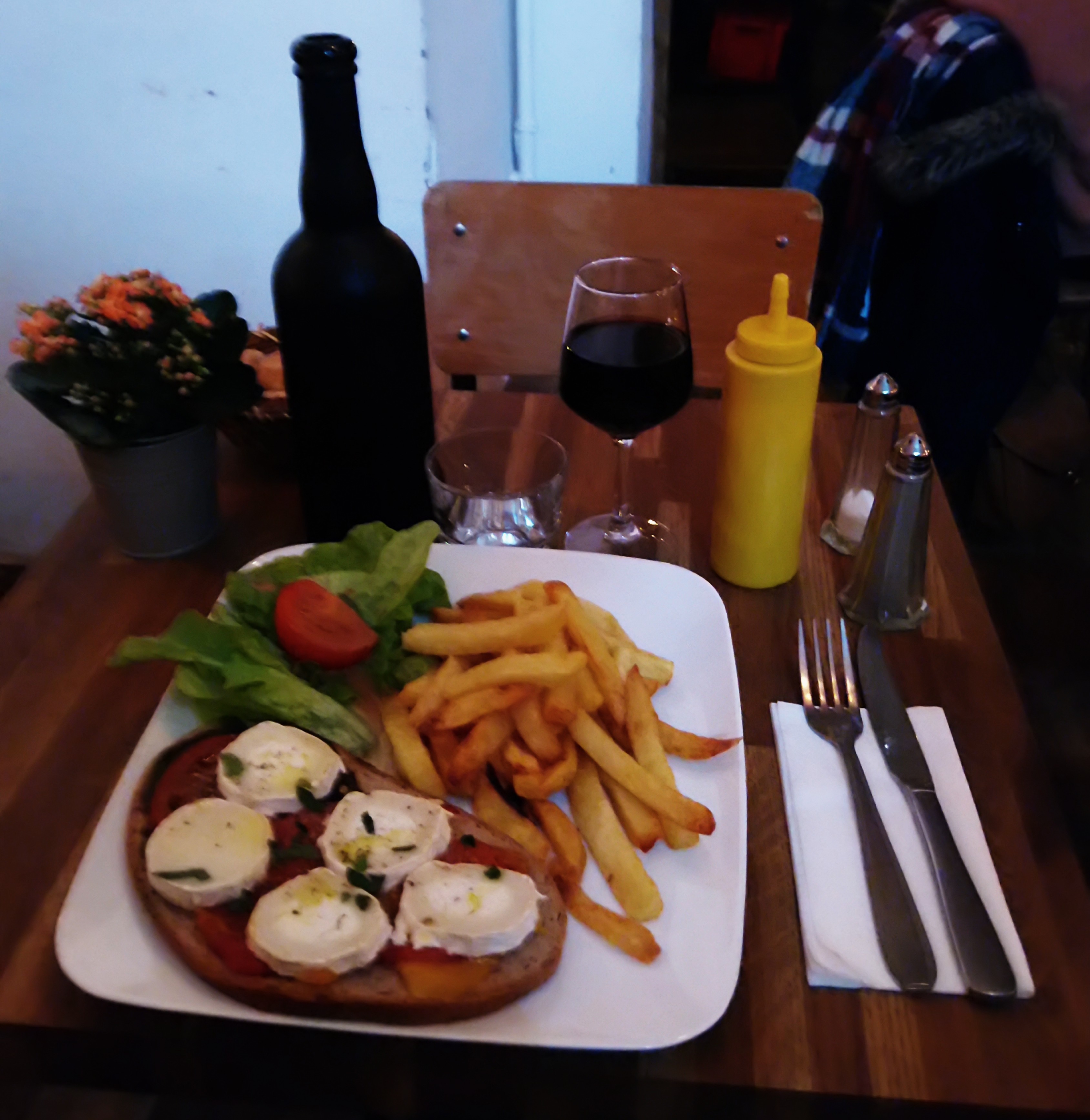J'avais une petite faim 😋 Le cadre est branché, super déco. Prix abordable. J'ai mangé une bruschetta végétarienne au pain de campagne cf photo = un peu déçue par le pain de campagne qui était plus industriel que campagnard mais agréablement surprise par la salade (vraie, pas sortie du sac 👌) et les frites, trop bonnes 🍟 L'atout de cet endroit est le cadre, sa déco mais surtout et indéniablement les 2 serveuses 1 blonde, mignonne aux cheveux magnifiques très frisés et une jeune femme de couleur, avec petit chignon, plantureuse = 2 personnes qui ont le sens de l'accueil, du service 👏👏👏👏👏👏👏👏👏👏👍👍