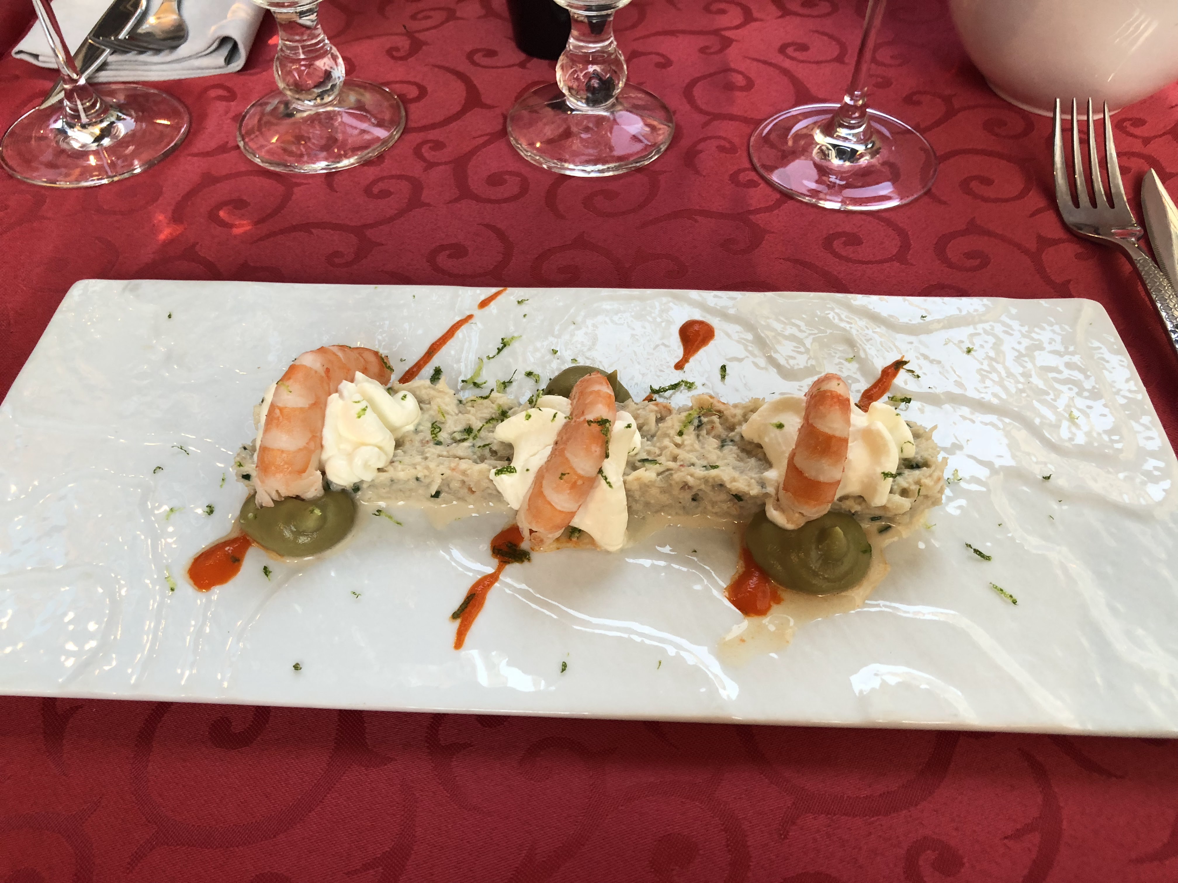 Quelle déception ! Alors le personnel est très sympa mais franchement , j ai mangé à la carte et j ai été très déçue : foie gras qui n a rien d exceptionnel, le plat à base de gambas et de torti s est transformé en pâtes à la sauce tomate avec 5 boit de gambas sans aucune originalité . Pour finir le tiramisu à l abricot avait un vrai goût de rance. Voilà pour moi , désolée