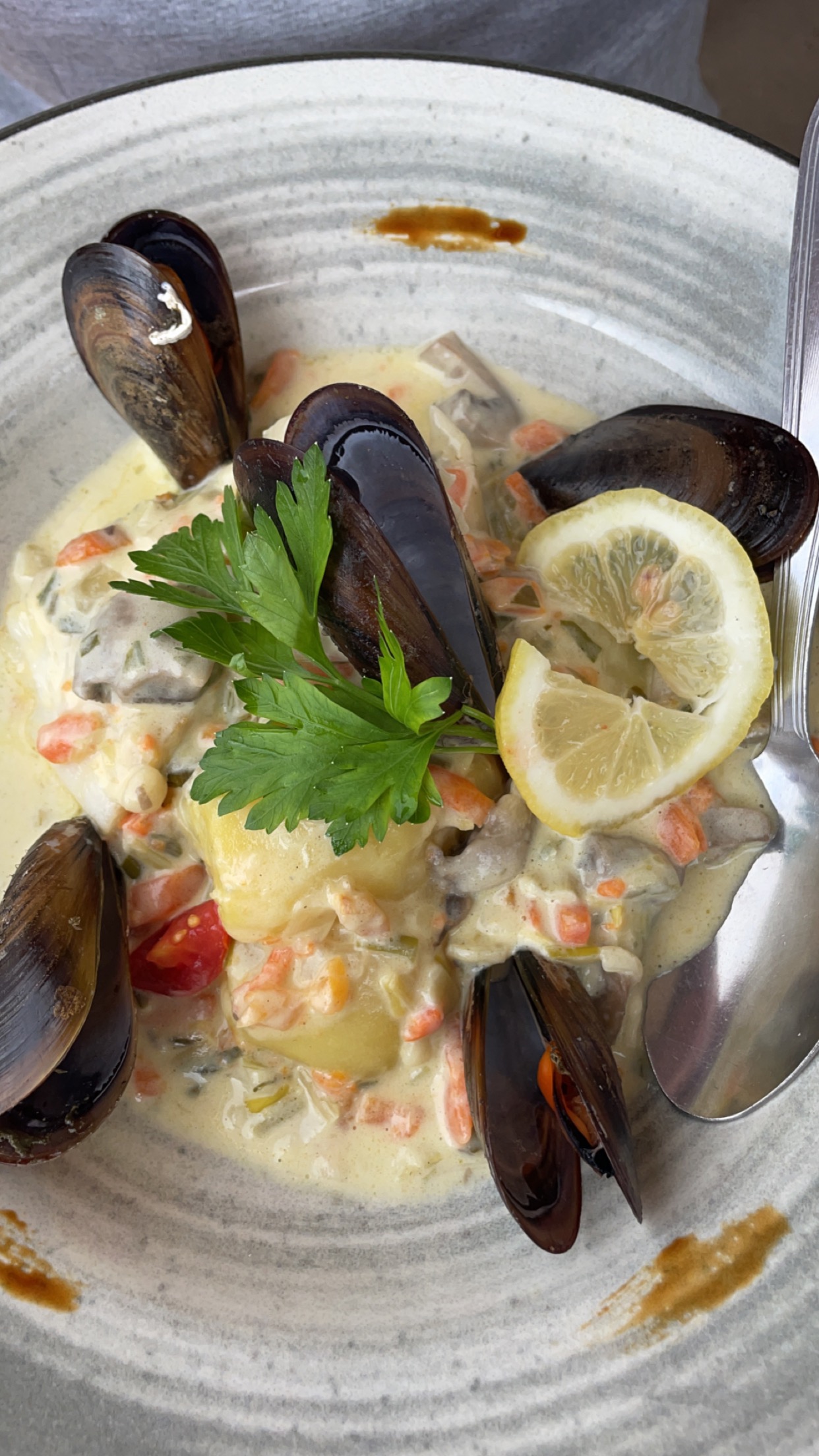 Excellentes moules au roquefort,lasagne au saumon très bonne, bien que bcp trop de saumon a la fin du plat (mauvaise répartition peut être) huître fraîche et oeuf de poisson excellent accueil agréable, service ok, propre