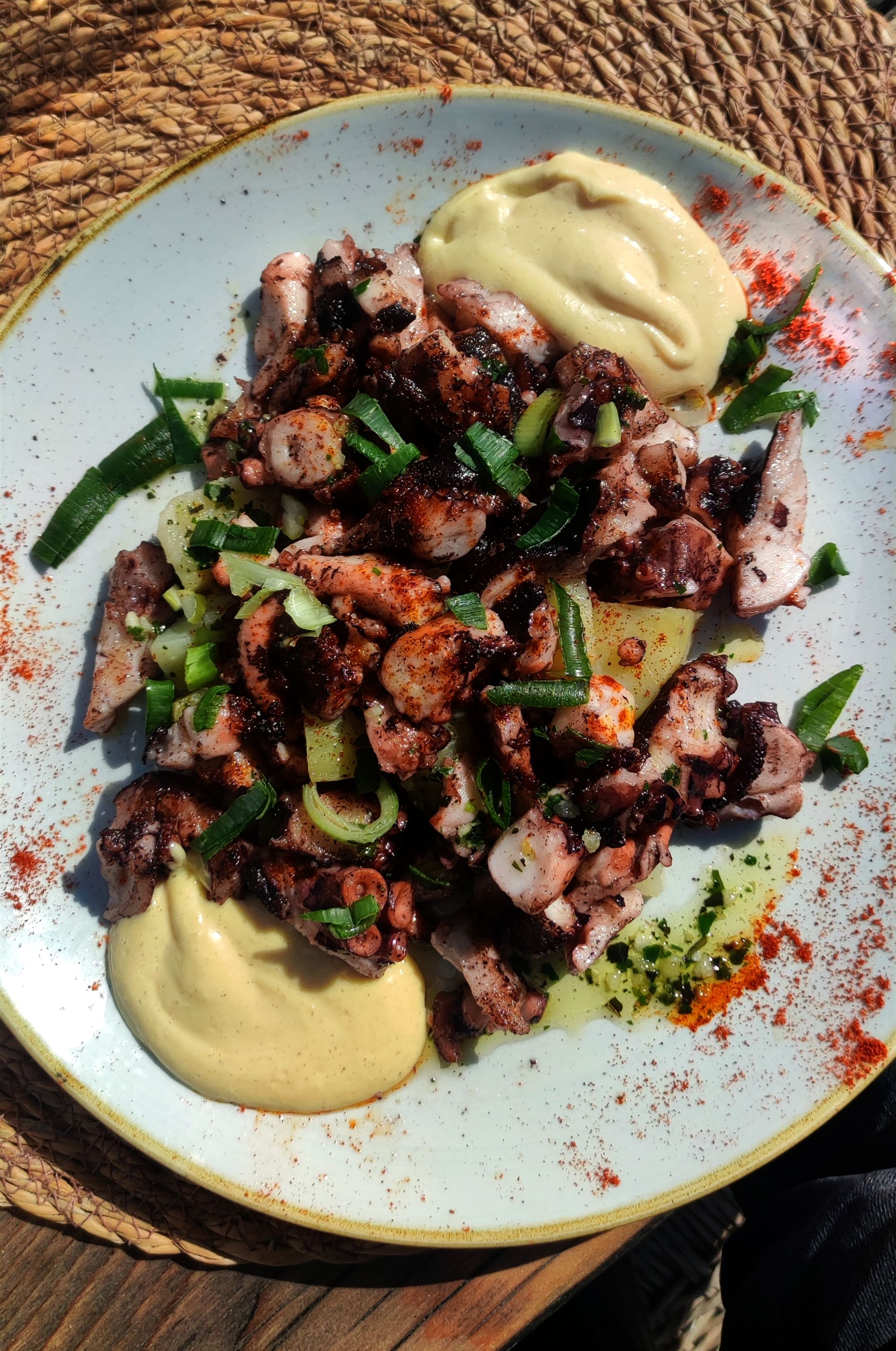 Repas en terrasse excellent,le poulpe à l'aïoli grillé délicieux ainsi que les seiches à la plancha
