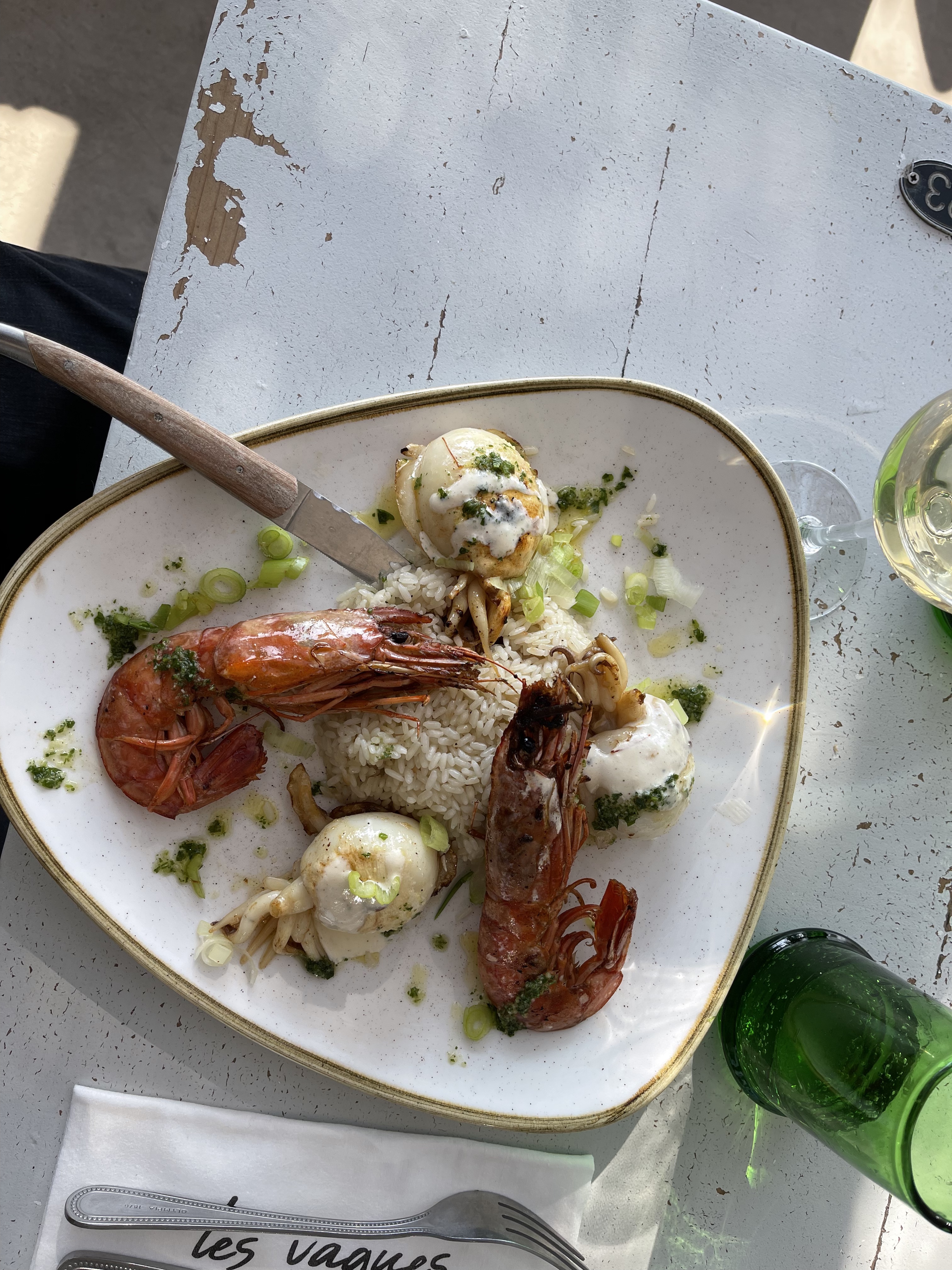 Nous avons mangé au restaurant. Le service était vraiment top de la part de chacun des serveurs, tous très attentionnés.. Les plats étaient excellents ! Nous avons prit les gambas, les sèches et poulets panés pour la petite et c'était parfait. La terrasse est trop belle, avec des végétaux vraiment trop beau, en face du port... Pour faire suite aux commentaires précédents, oui l'eau est payante mais au moins elle n'a pas l'odeur du chlore..... Merci pour ce repas.