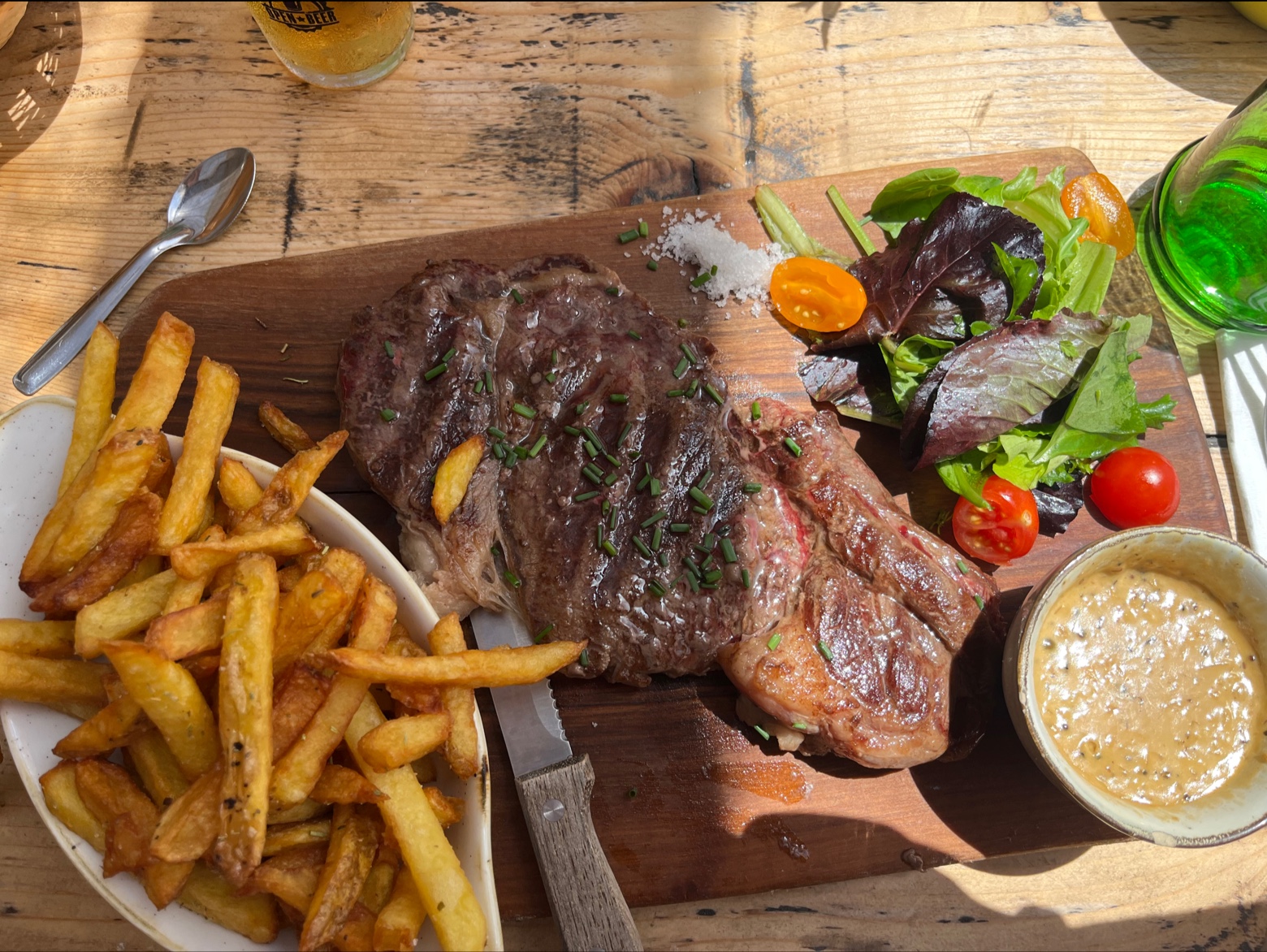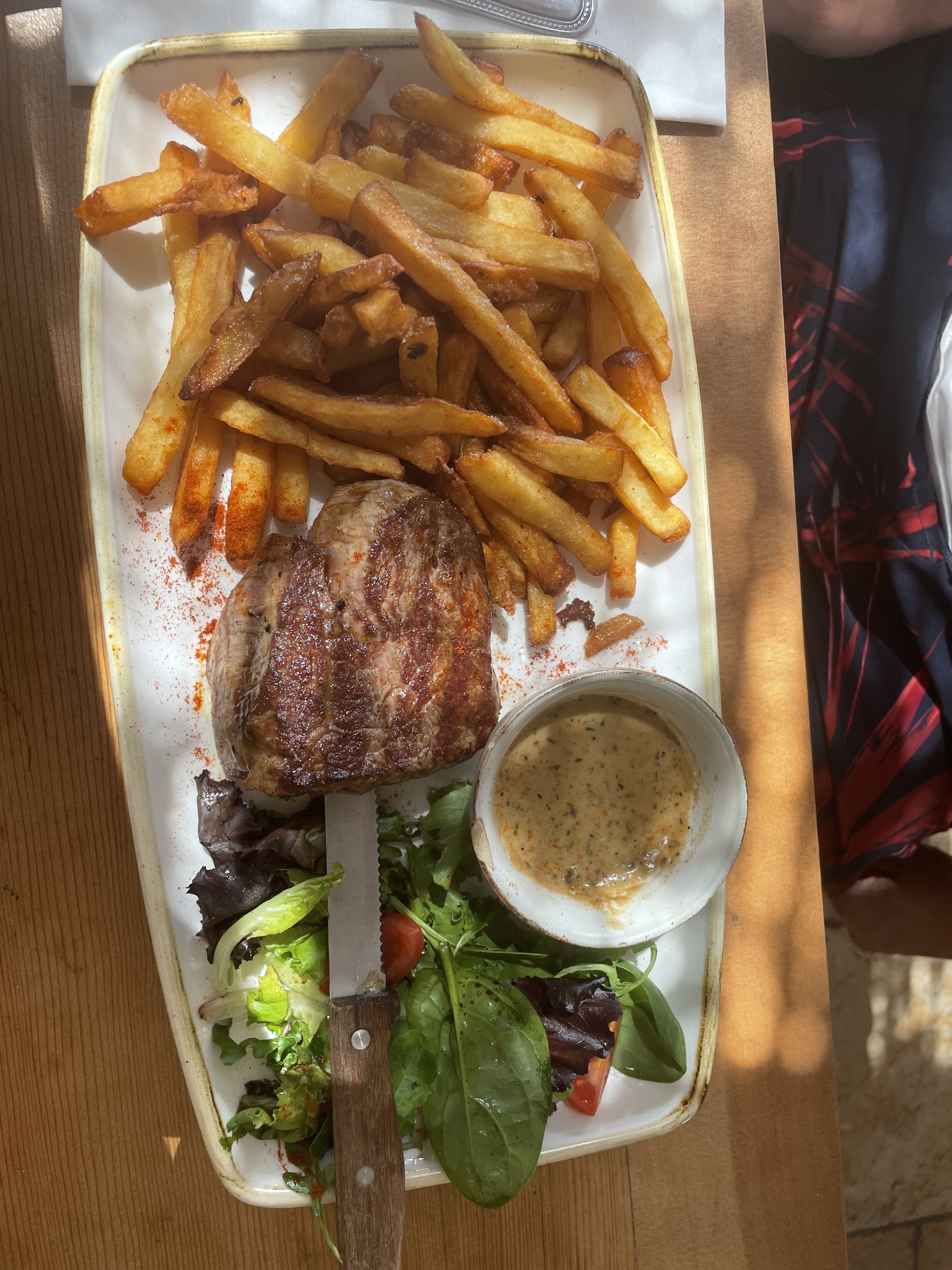 Le restaurant est magnifique, super bien positionner en terrasse, embiance cool est chaleureuse ! Le serveur est adorable il s'appeler Frank, la viande d'une tendresse sans égal ! Ce filet de bœuf était si goûteux ! Une merveille ! Les pommes sautés était croustillante ! Un accompagnement d'une sauce moutarde poivre super bonne, repas complet et chargé parfait pour passer de bon moment en famille ! C'est un délice ! Grandement recommandé !