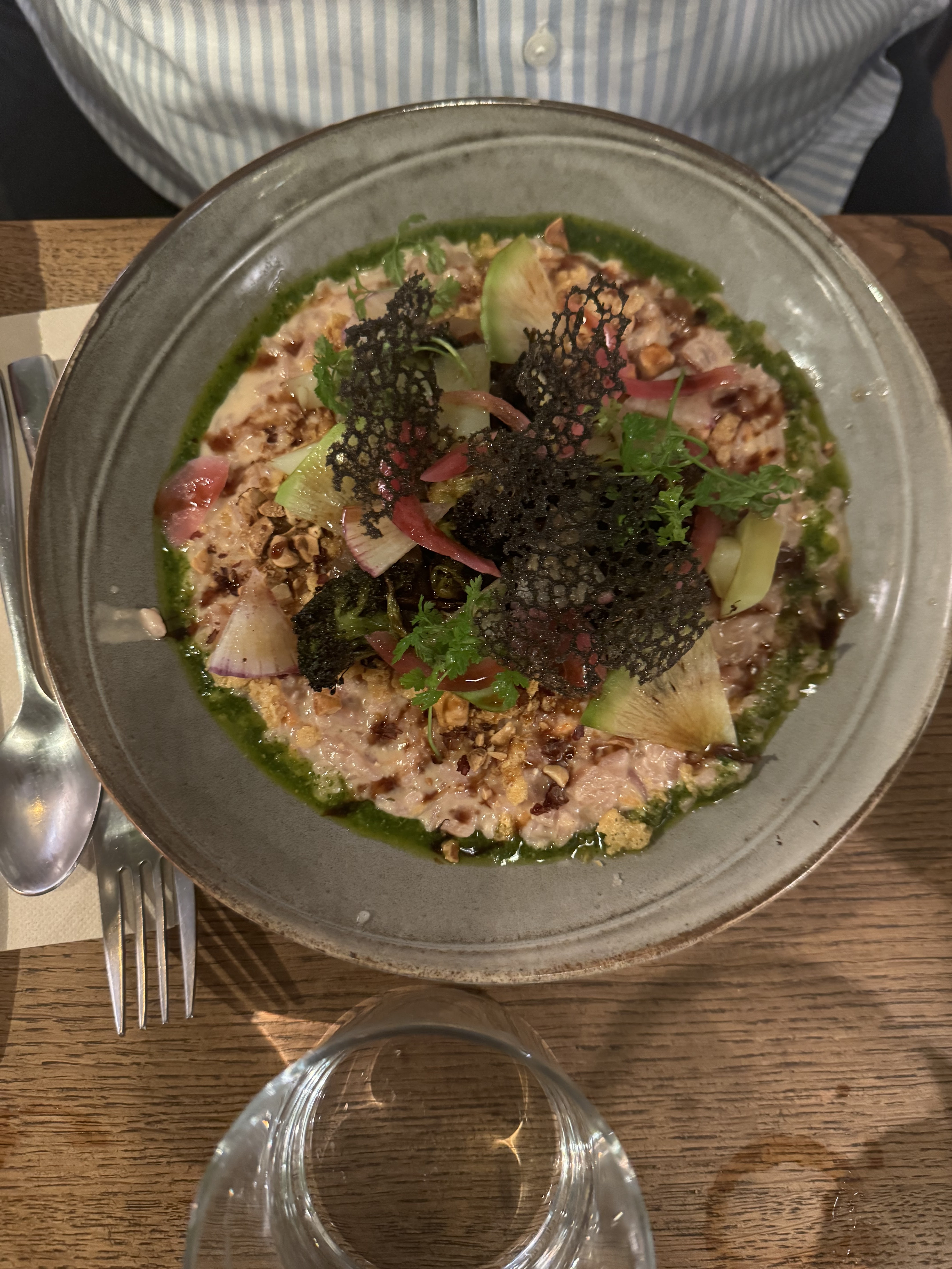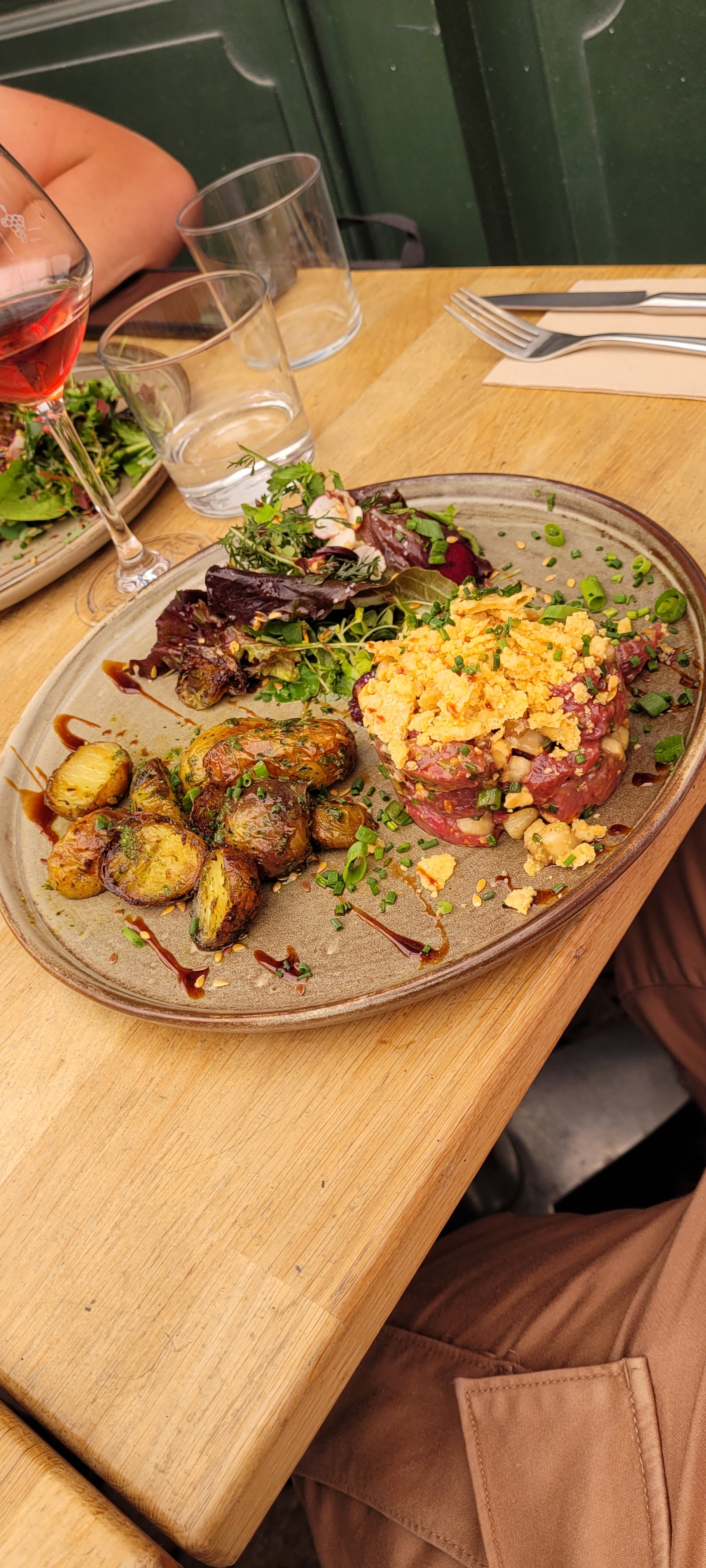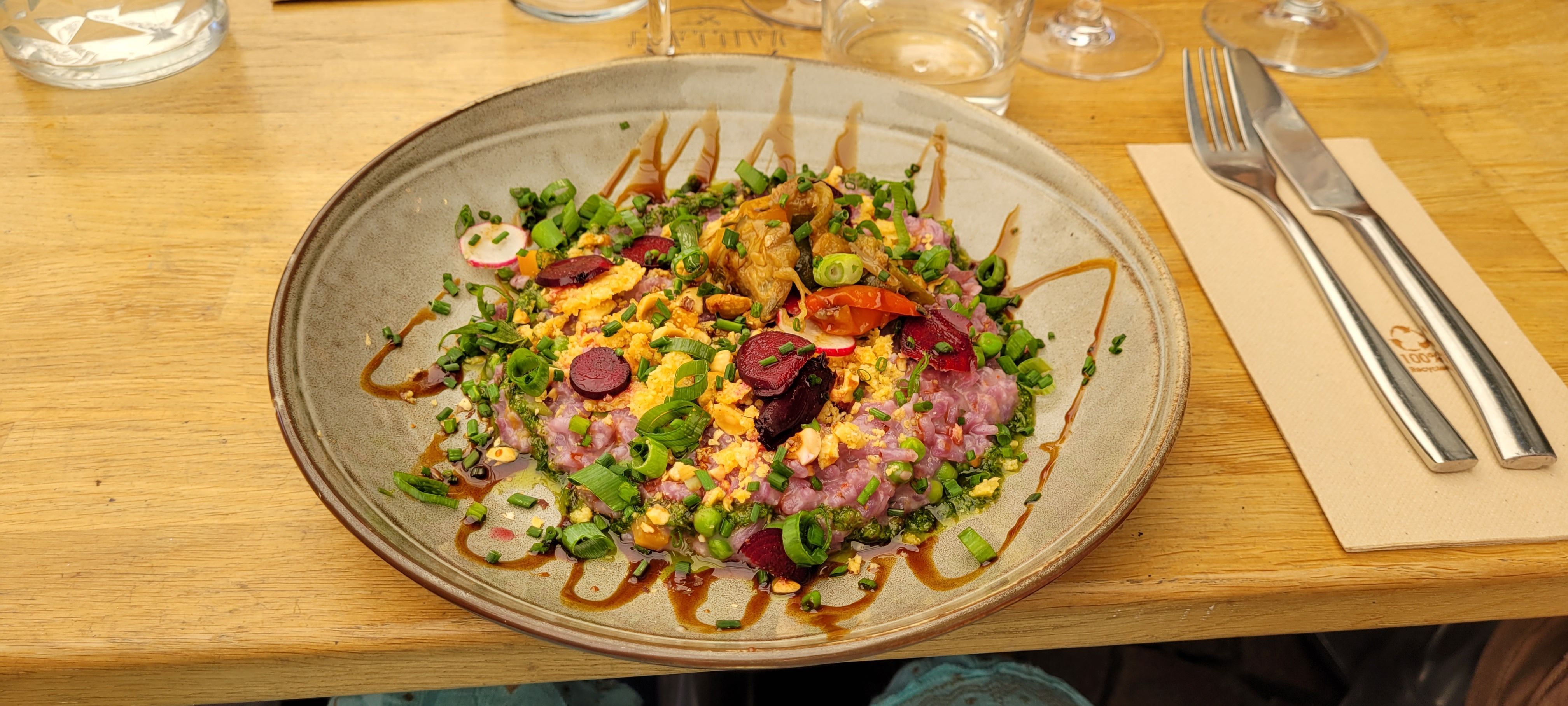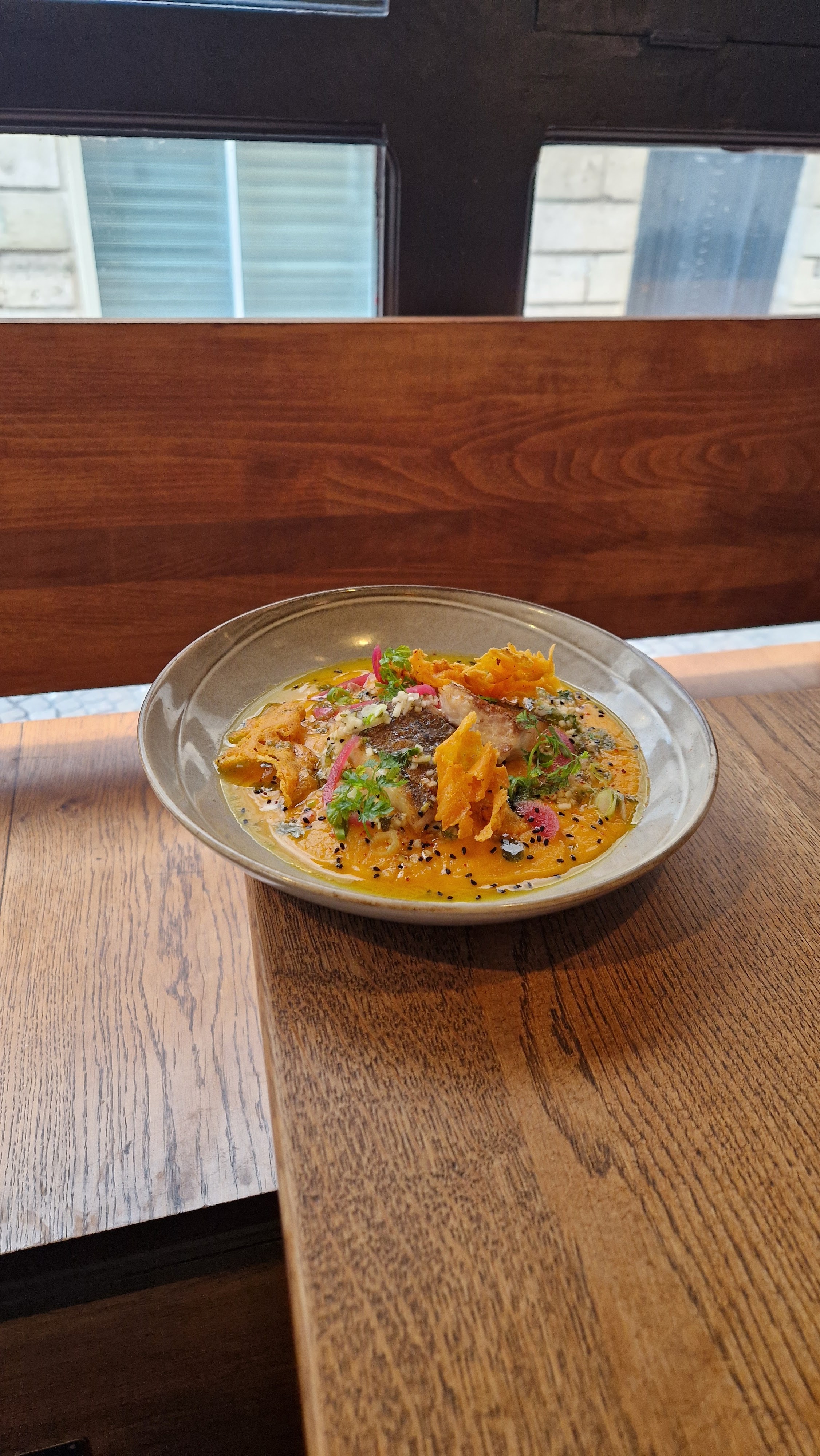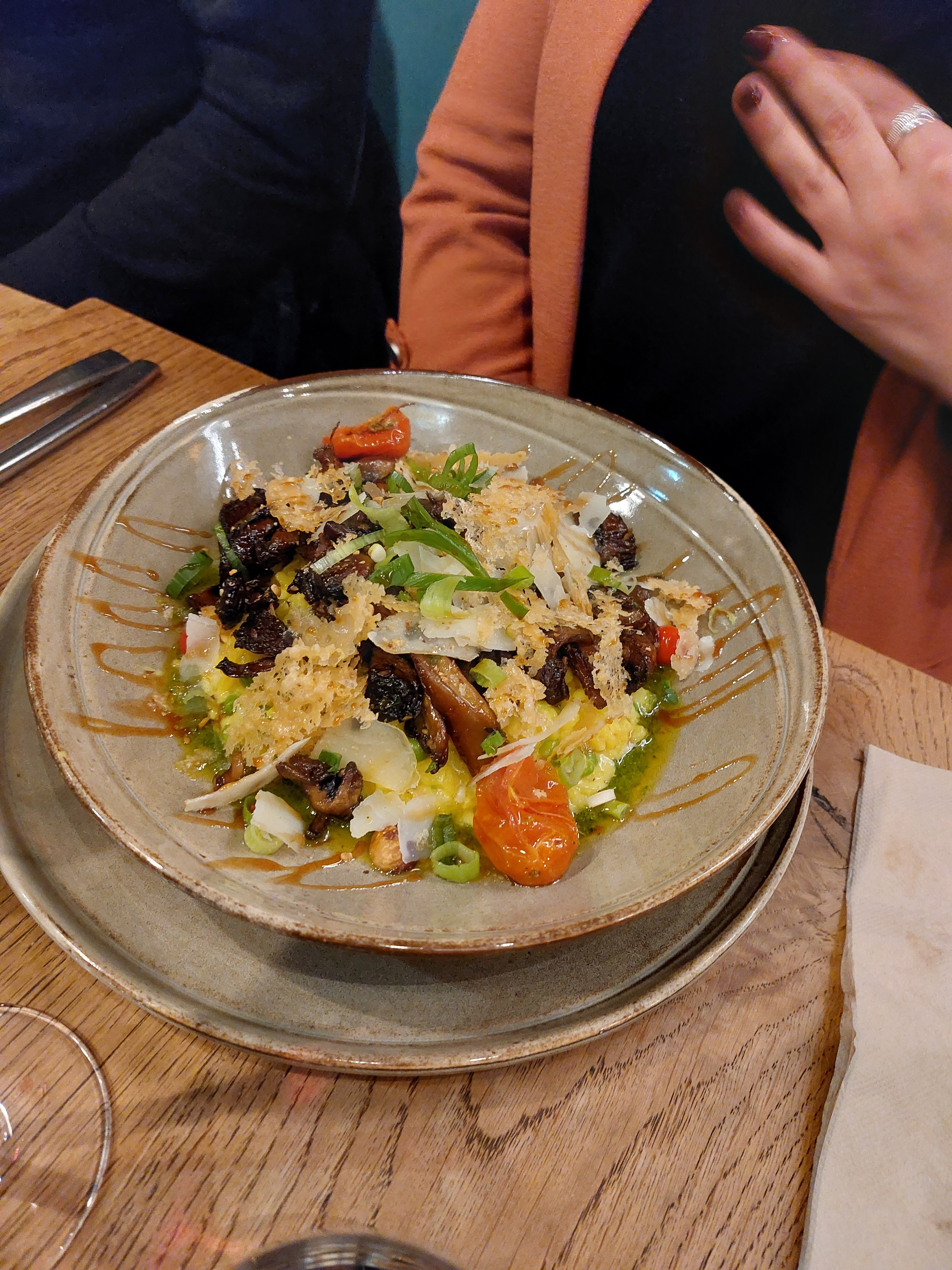 Un délicieux dîner (végan pour ma part) avec un service très agréable et une terrasse pourtant comble, à un très bon rythme et des plats plein de saveurs. Une superbe soirée !