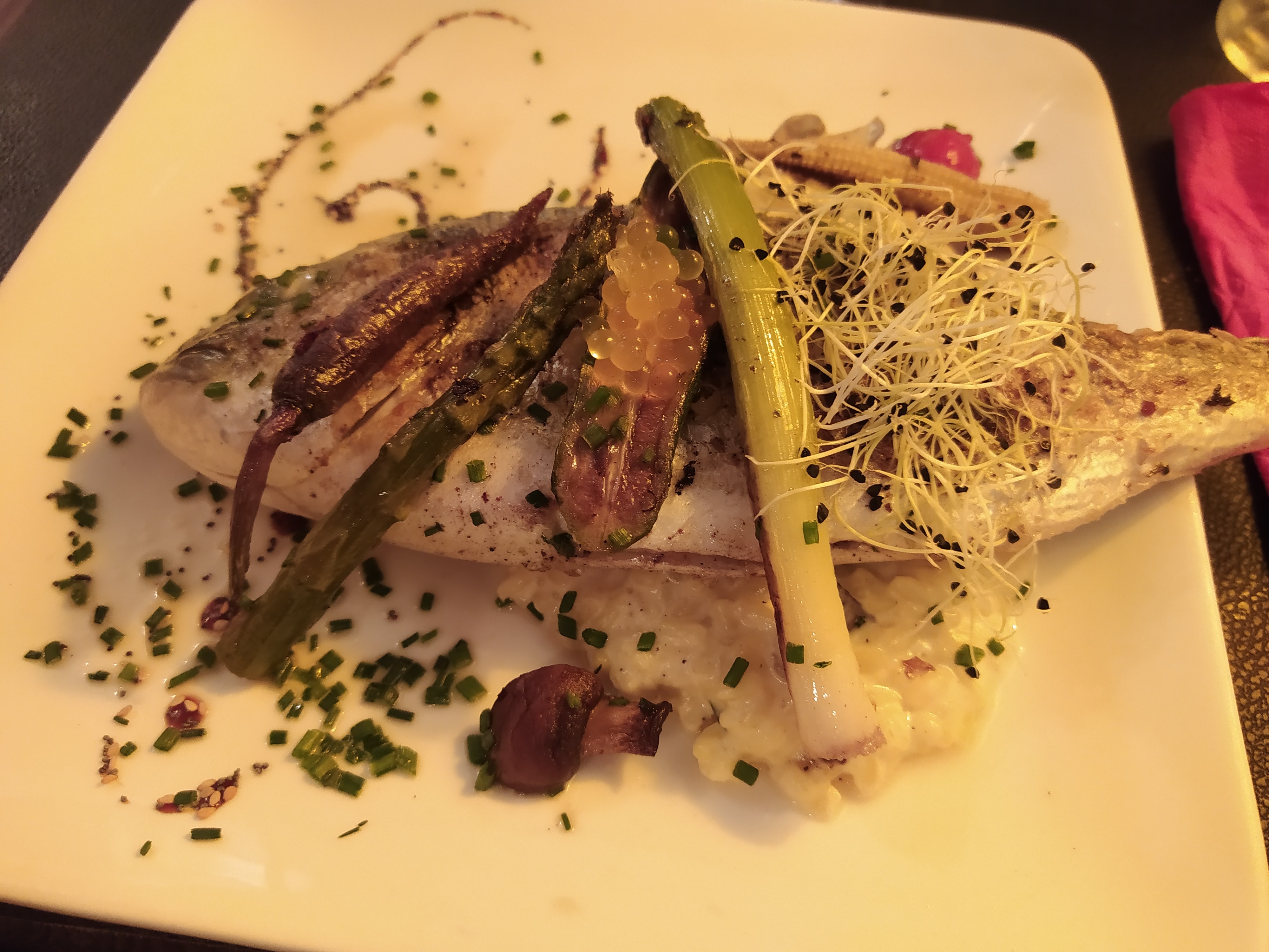 Une daurade avec un risotto...... A tomber parterre. Toujours agréablement surpris produits frais et un accueil au top. Très agréable soirée.