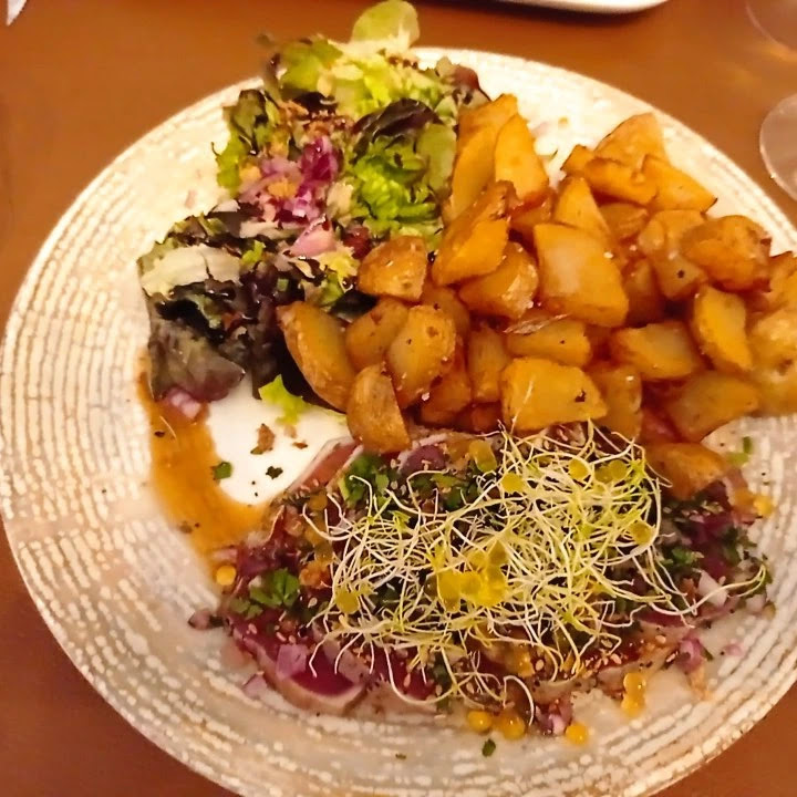 Belle salle et offre centrée sur les produits de la mer. Notamment une proposition d'un thon snacké avec une variété de legumes sucrés & salés.