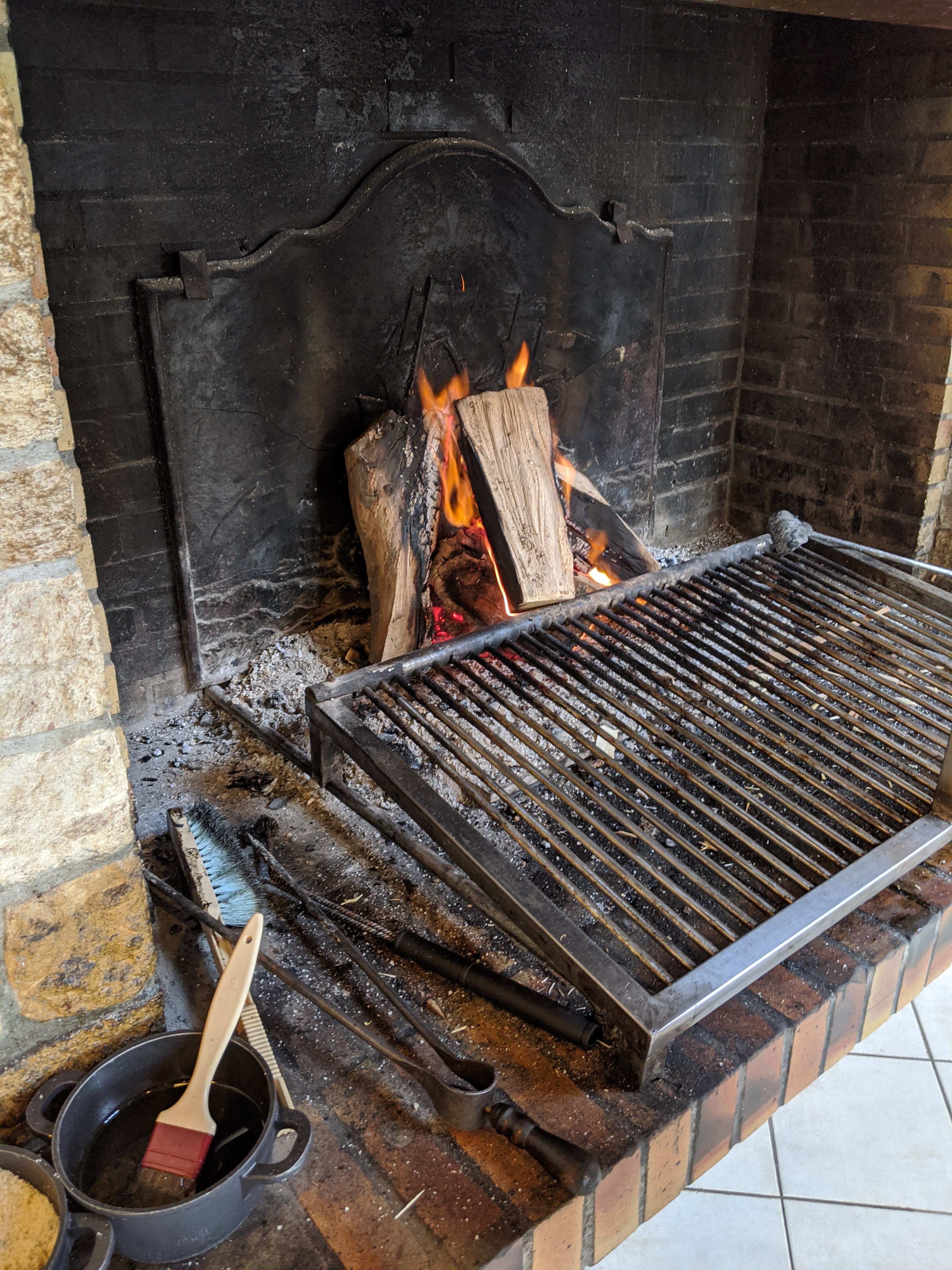 Endroit sympa personnel jeune et sympathique souriant avons bien manger viande cuite au feu de bois sous vos yeux