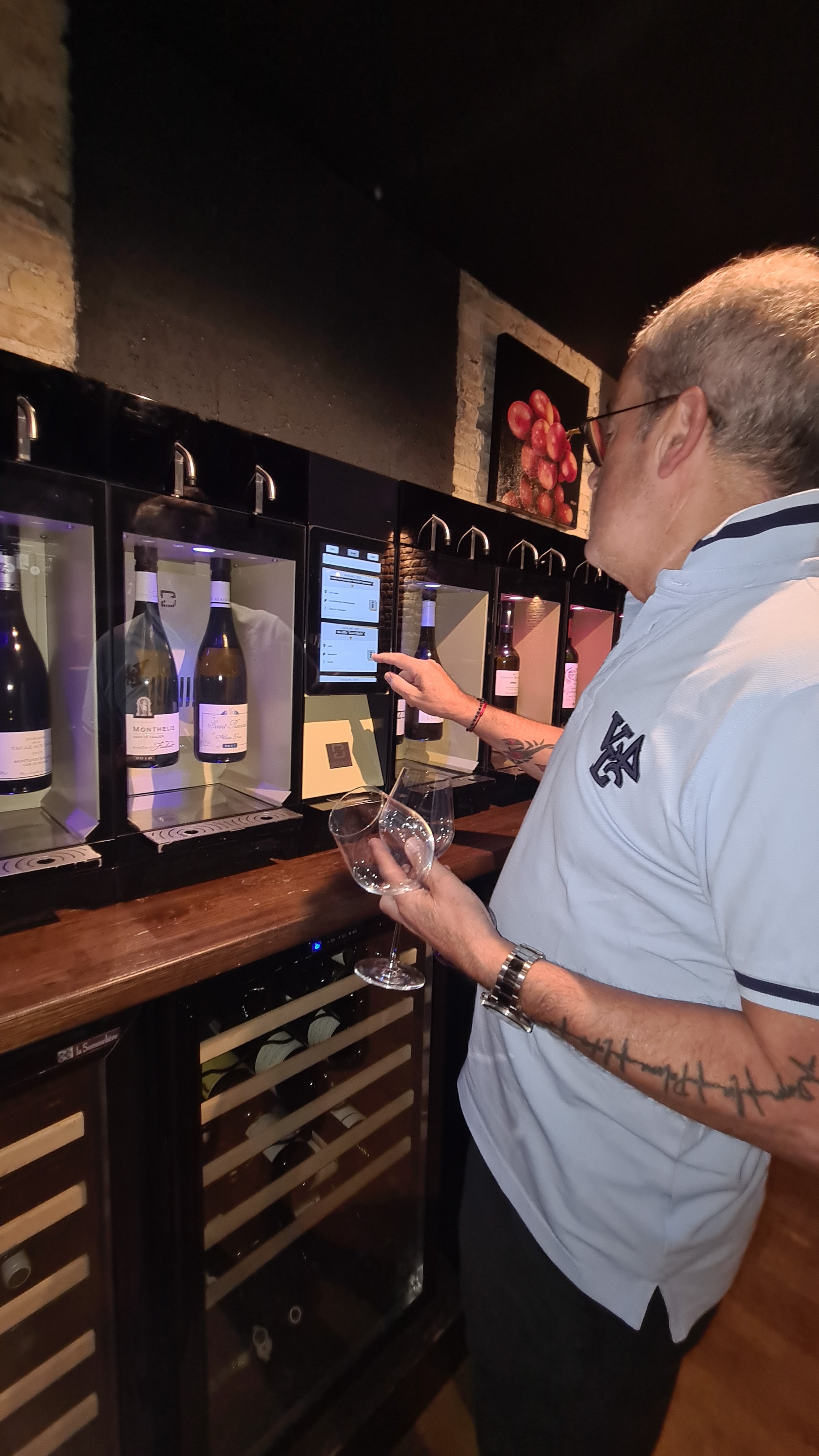 Très bel endroit pour les amateurs de vins ! Le système de vins au verre automatique permet de pouvoir goûter à divers crus, cépages, vignobles et régions selon nos goûts, envies, plats etc.... Du blanc, du rosé ou du rouge il y en a pour tout les goûts... Un système de carte magnétique permet la liberté de ce faire plaisir sans avoir à tenir les comptes , c'est imple et sans surprise, les prix sont affichés sur l'écran et le total consommé aussi ... Comté 1€ du centilitre en moyenne pour les rouges et un peu moins pour les blancs....avec trois possibilité pour chaque bouteille (3,6 ou 12Cl)... Côté restauration, une carte renouvelée souvent apparemment, et des grands classiques permanent comme les planches (très variées entre diverses charcuteries, divers fromages ou divers produits de la mer et bien sûr des mixtes). Compté 20€ la planche pour 1 personne et 37€ pour deux mais elles sont très bien garnies ! Quand au plats un choix entres 5 ou 6 possibilités , tout autant pour les entrées et les desserts... Produits frais, raffiné, exécuté dans la cuisine ouverte en pleine salle de restauration c'est génial. Comté entre 17 et 25€ en moyenne pour un plat, originale authentique savoureux... Très bonne adresse, mais pas à la portée de toutes les bourses soyons honnêtes... Le cadre est superbe félicitations pour votre aménagement, entre la brique apparente, les voûtes, les tables en bois, les diverses chaises de styles différentes, vous avez su garder le charme d'une l'ancienne cave en l'alliant à la modernisation du mobilier...bravo belle réussite, bel établissement, nous reviendrons avec plaisir.... Noël