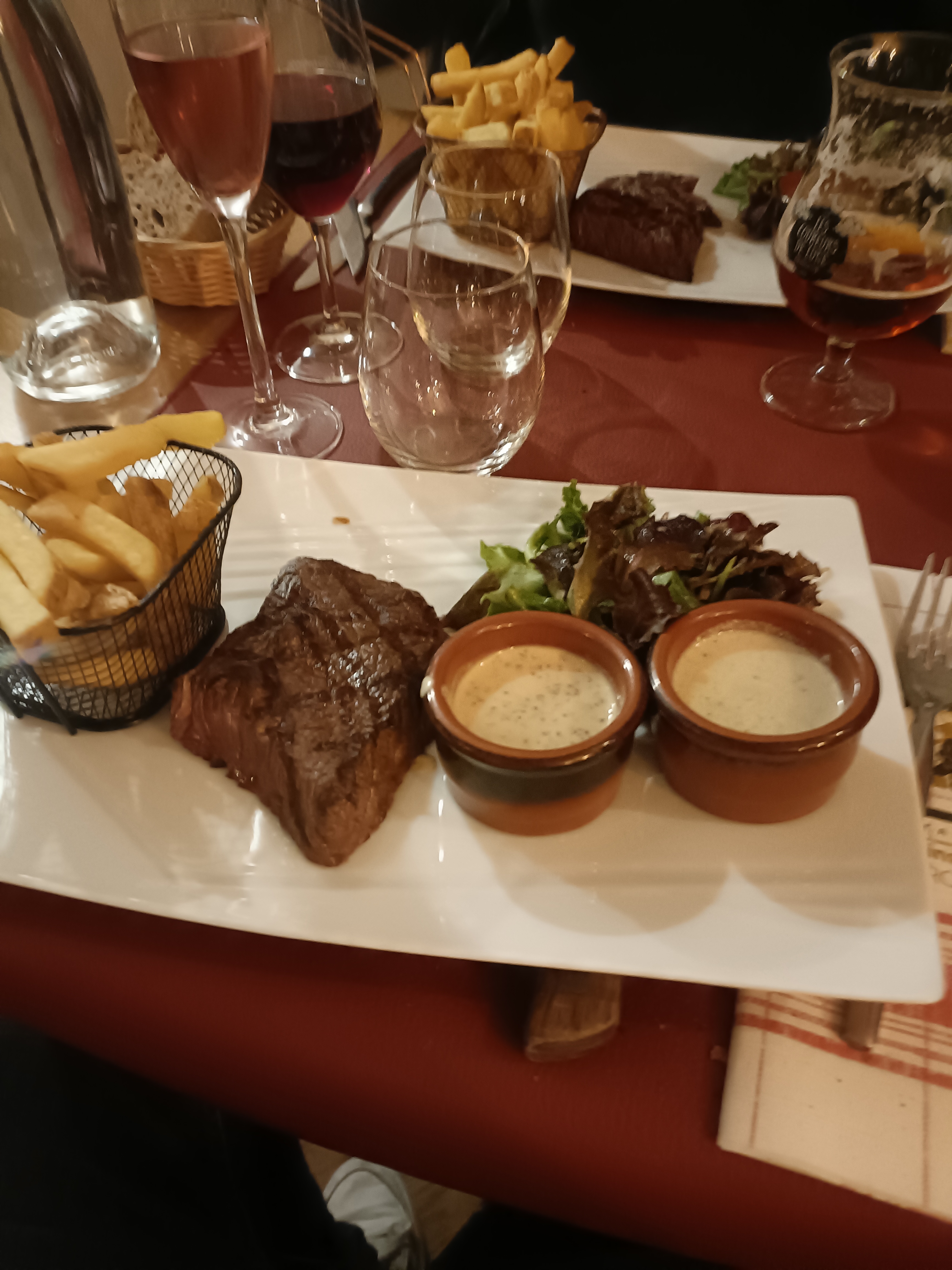 Entrecôte de mauvaise qualité. Nous avons demandé du médium, nous l'avons obtenu cru. purée de pommes de terre trop lourde et trop grasse. Le service était sympathique. Après notre plainte (à la fin) il n'y a eu aucune excuse ni aucun geste (café ou boissons offerts par la maison). Facture payée en totalité.