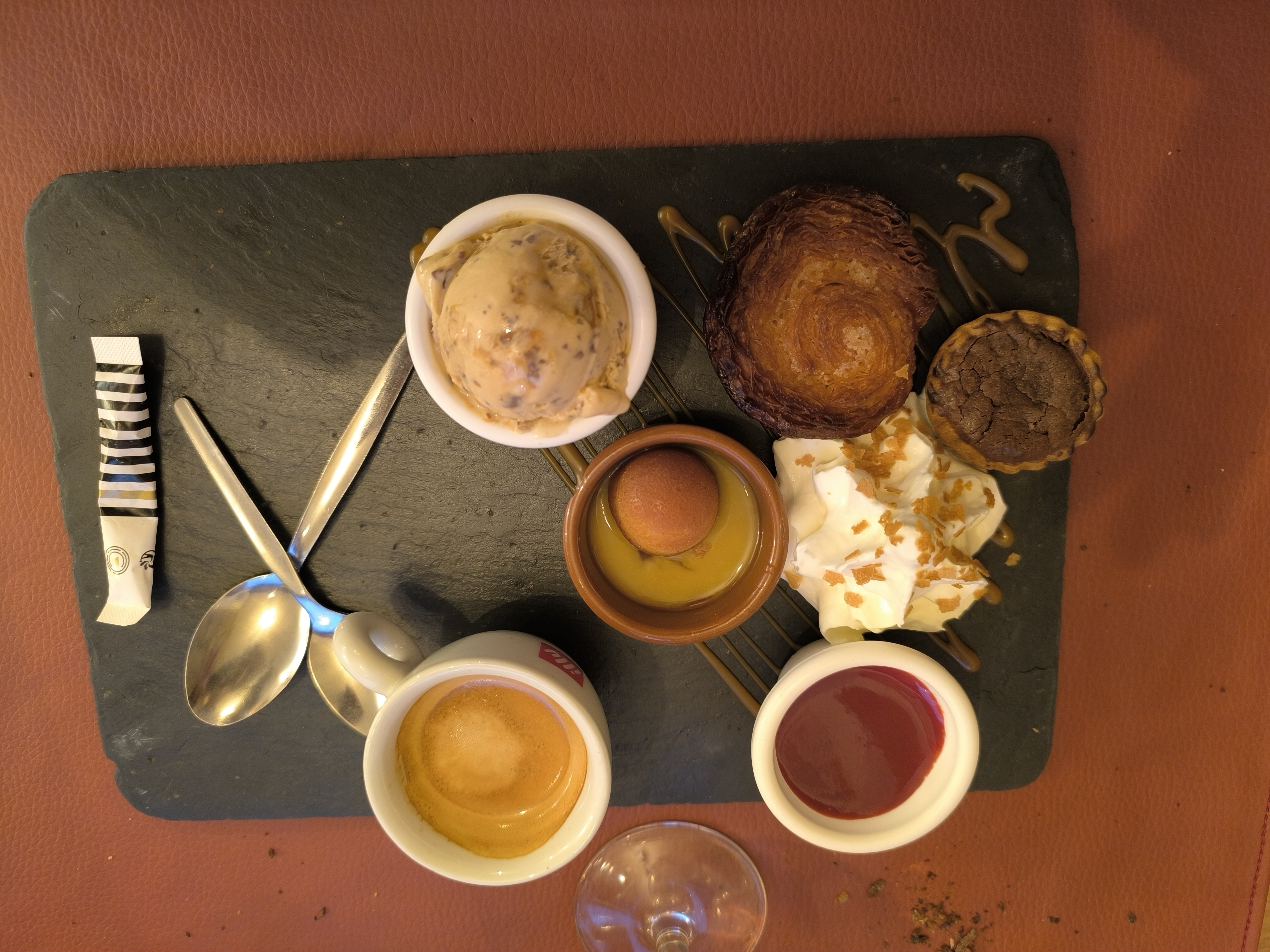 Le foie gras excellent avec son vin blanc parfait . Tres bon mariage entre le Bordeaux de 2015 et mon énorme rumsteack dont la cuisson était parfaite 🤩 La suggestion du dessert , un délice. Merci au patron et staff .