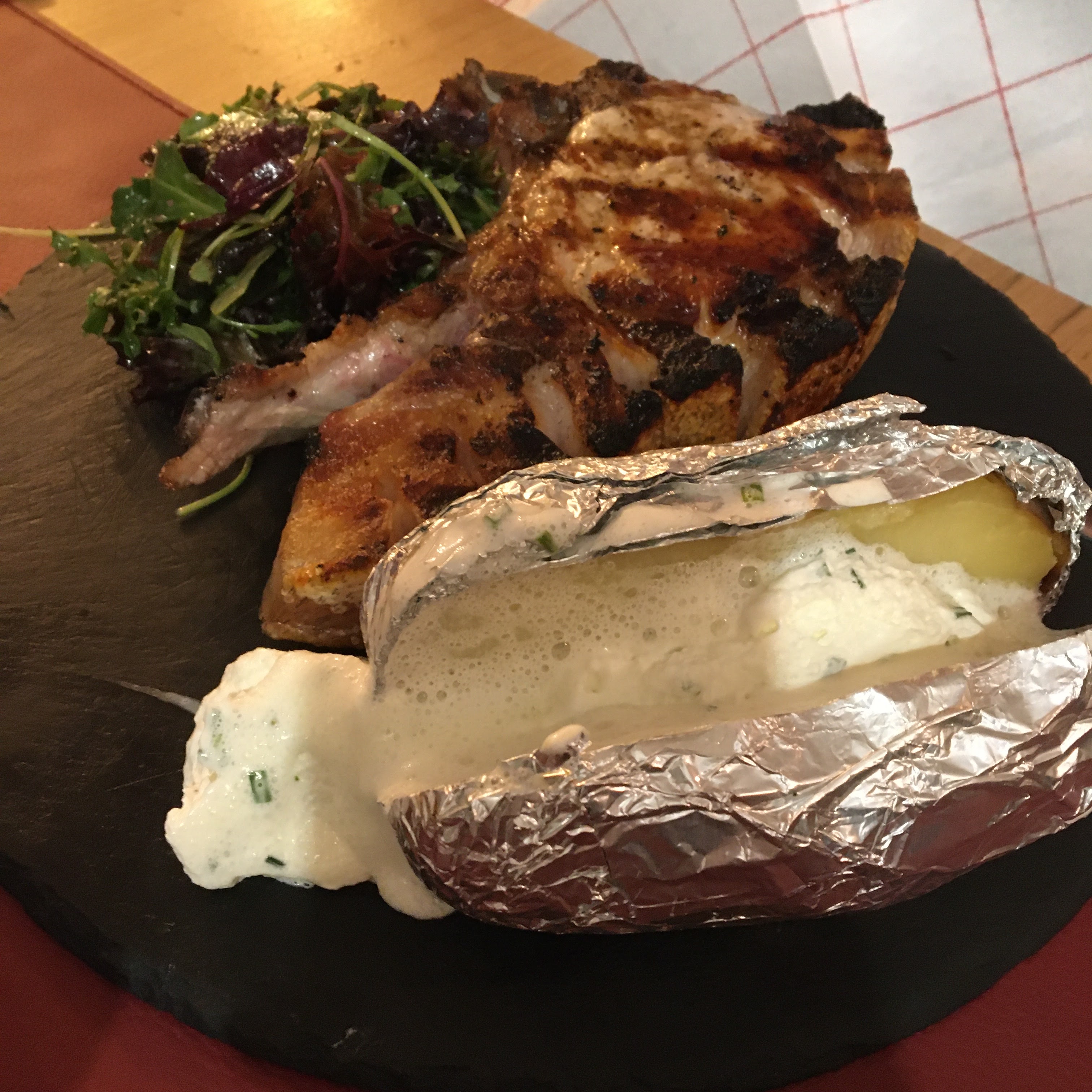 Mon partenaire et moi-même avions des plats différents pour le plat principal. Brochette de lotte et porc. Les deux plats étaient presque immangeables car ils étaient très très salés. (Je sale les plats à la maison mais c'est loin d'être comme ça) nous avons tous les deux eu des entrées qui étaient correctes mais très chères pour ce qu'elles étaient. Le vin rosé de la maison était très bon.