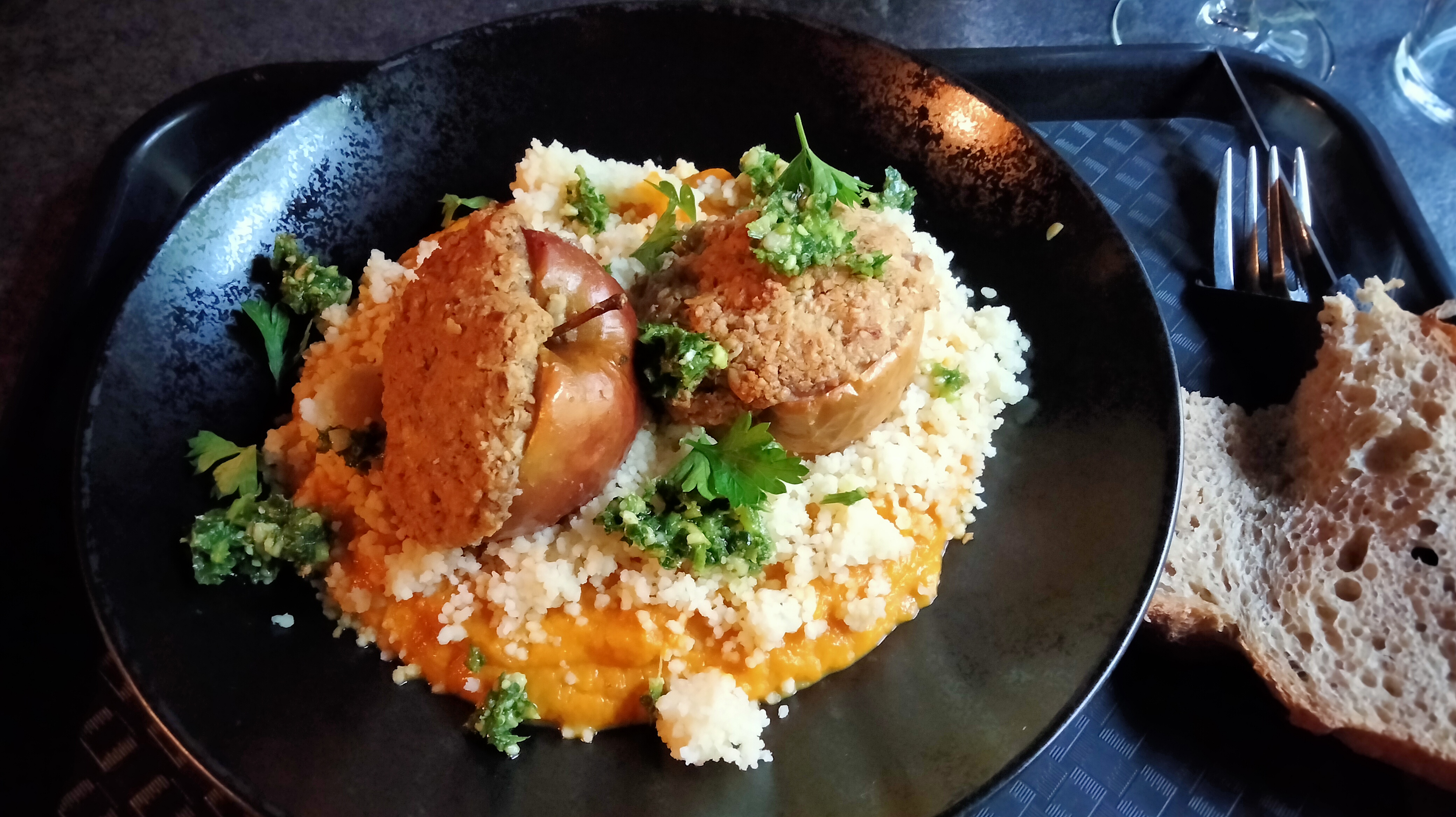 Bel endroit dans la campagne.qui ne fait pas que restaurant...soirée a thème. ..expo...etc.on était venu pour dîner...des moules a Clermont .. curieux,...où est la Mer ?.2 choix pour le plat du jour... soit un plat végétarien insipide.lautre boeuf avec quelques légumes....sans sauce.avec un bœuf filandreux.quant aux dessins tarte aux pommes bof... mousse au chocolat bonne....