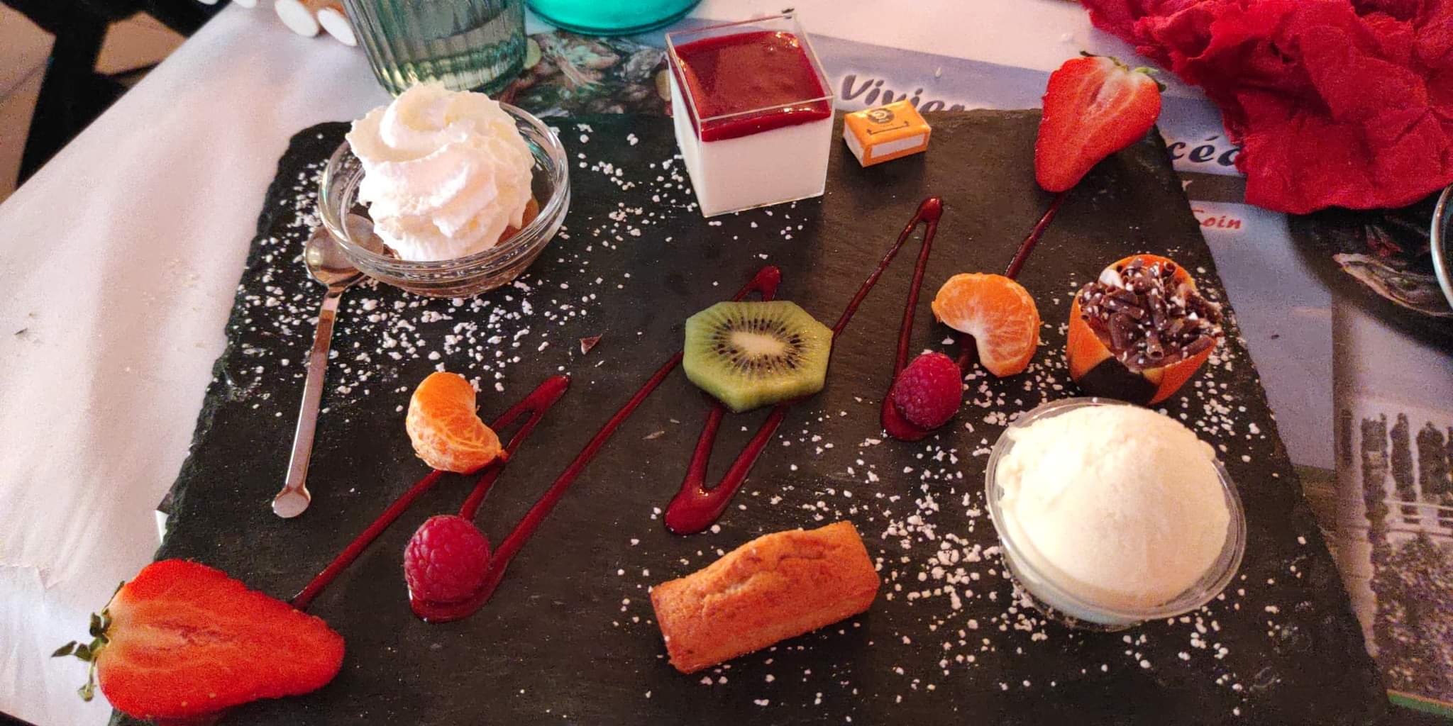Accueil chaleureux par tout le personnels ! Meilleur restaurant de bord de mer auquel nous avons mangé ! La soupe était très bonne, les crevettes sauce ailloli parfaites, les moules crème et roquefort était super bonnes ! Un peu déçu par les frites trop cuites 😉 Panacotta fruits rouges super bon ! Très bon repas ! Merci énormément de l’accueil nous reviendrons les yeux fermés !!
