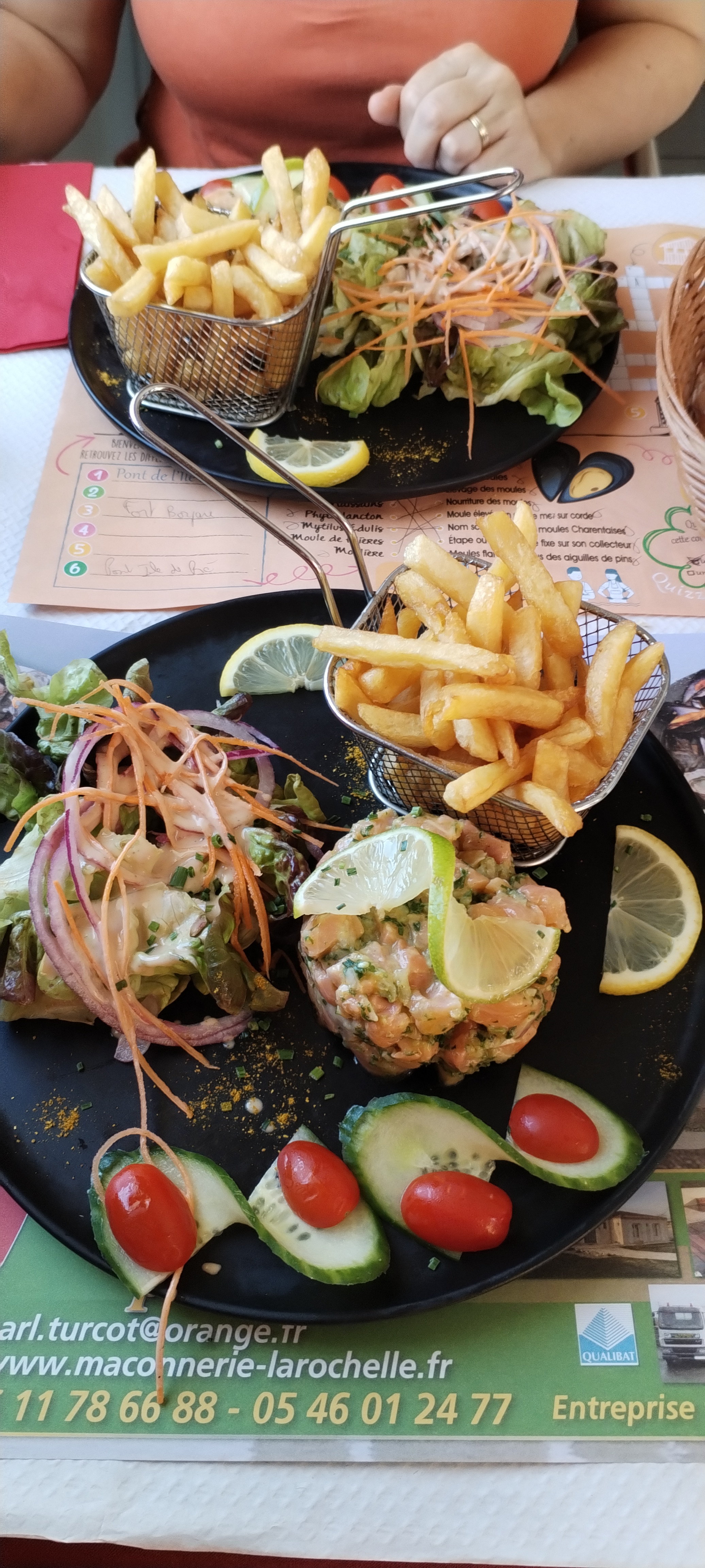 Plats corrects mais évitez les tartares si vous les aimez frais et relevés Trop d'attente entre les 3 plats du menu du jour Cependant bien contents de trouver un restaurant sur la piste cyclable du Pertuis Breton