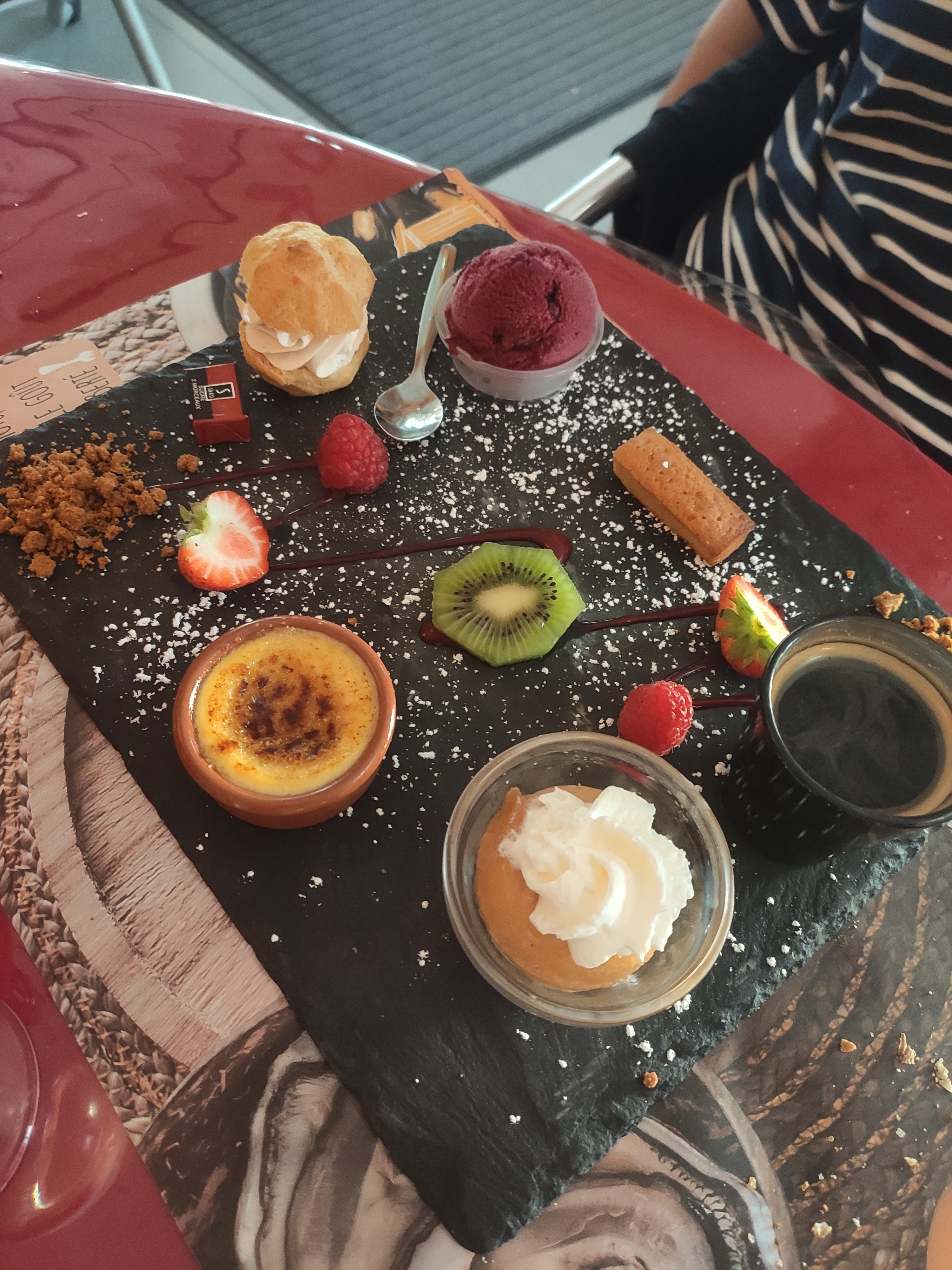 Soupe de poisson excellente, et assiette de fruits de mer très fraîche et très bonne. Café gourmand original et très bon. Je recommande malgré le stress évident du personnel, ce restaurant reste très sympathique.