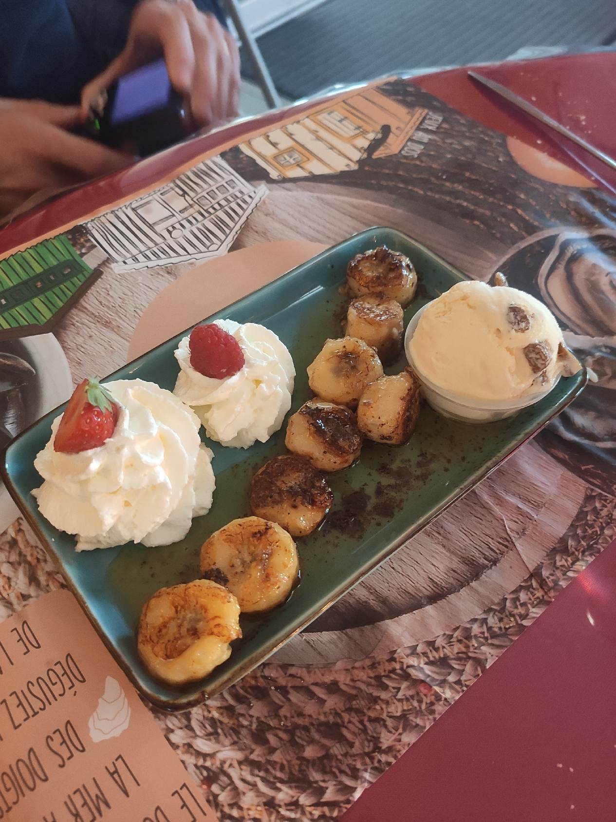 Très bon accueil.Service efficace,rapide. Très bonne assiette de fruits de mer,moules effectivement petites ms bonnes. Bananes flambées et tiramisu en dessert, très bon. Toilettes propres(critère important et qui veut dire bcp) Bon rapport qualité prix