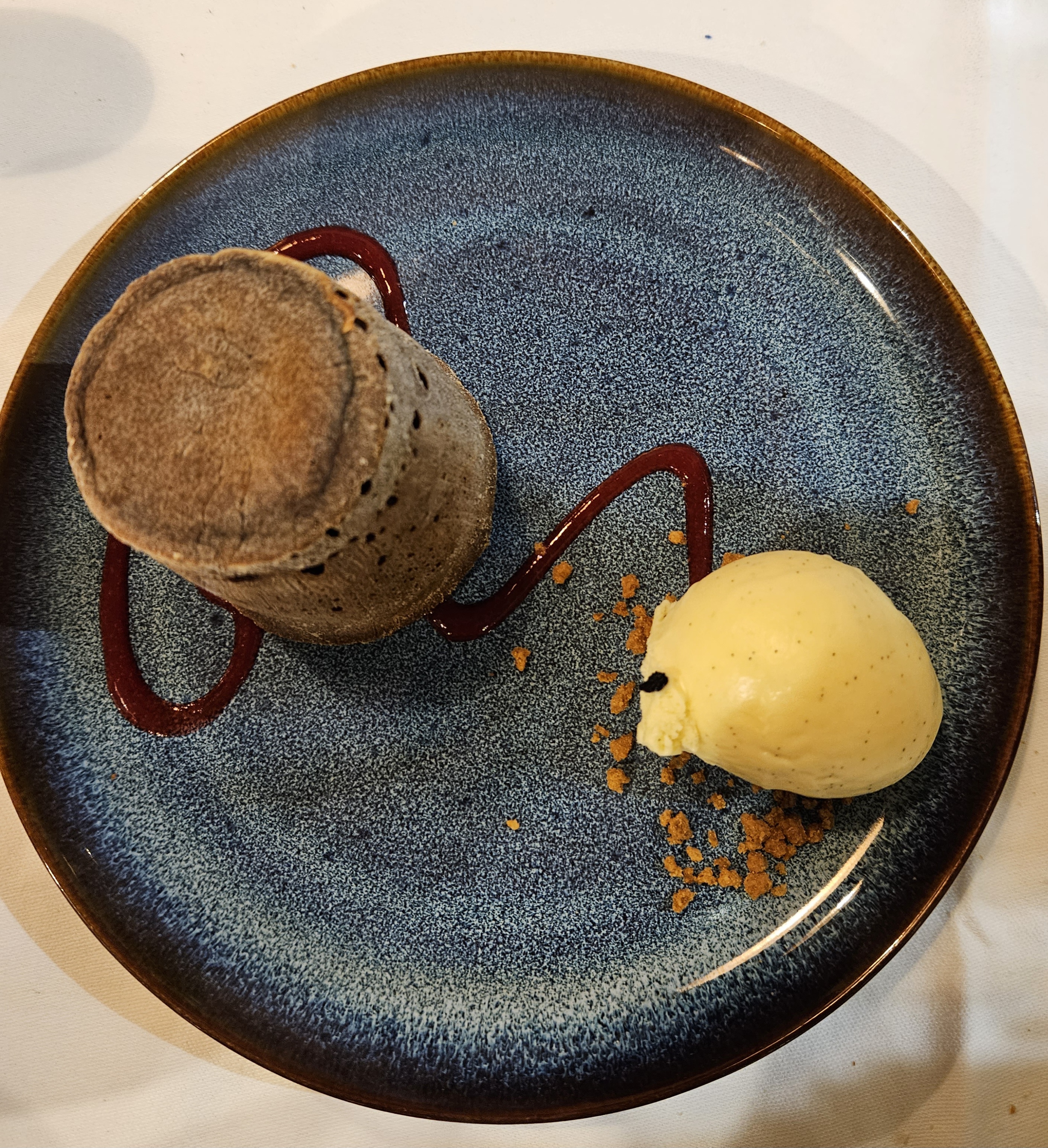 Bon repas même si à peine chaud et dessert un peu léger. Cadre agréable. Dommage les serveurs ne semblent pas apprécier leur travail et n'ont pas réussi à avoir des petits mots gentils ou ni même à nous présenter les plats.