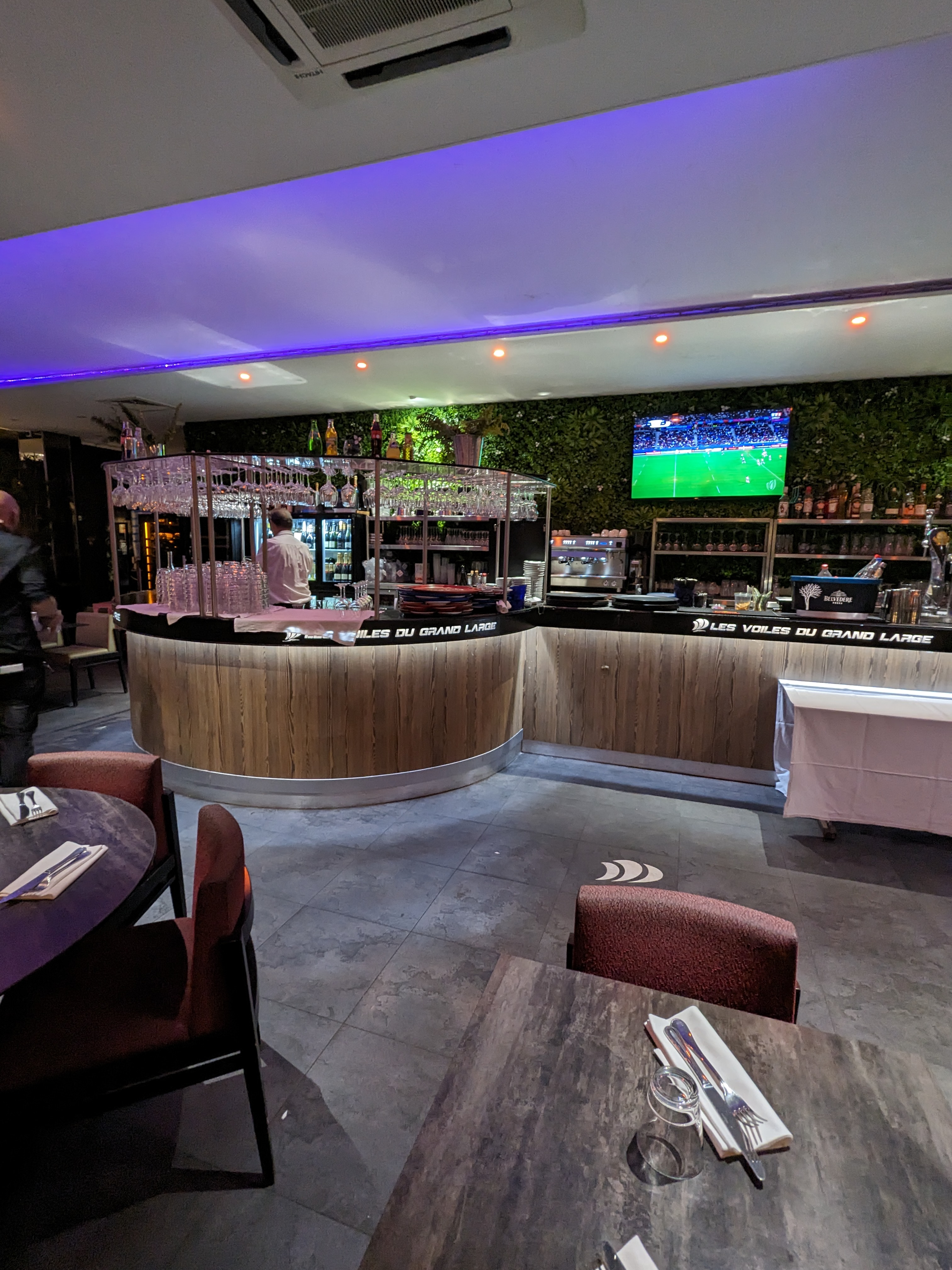 Les voiles le concept est bon le choix en vin est bon mais la cuisine... C'est pas ça suprême de volaille, sauce trop salé de grande chance que tout viennent de métro. C'est pas la grande classe. Les parts sont petites et il y a peu de légumes. Le personnel est cependant très polie. Pas d'eau plate on a du payer cher en eau Evian a 5 euro la bouteille de 75cl. C'est dommage cadre idéal personnel agréable, mais la cuisine est d'un niveau faible.