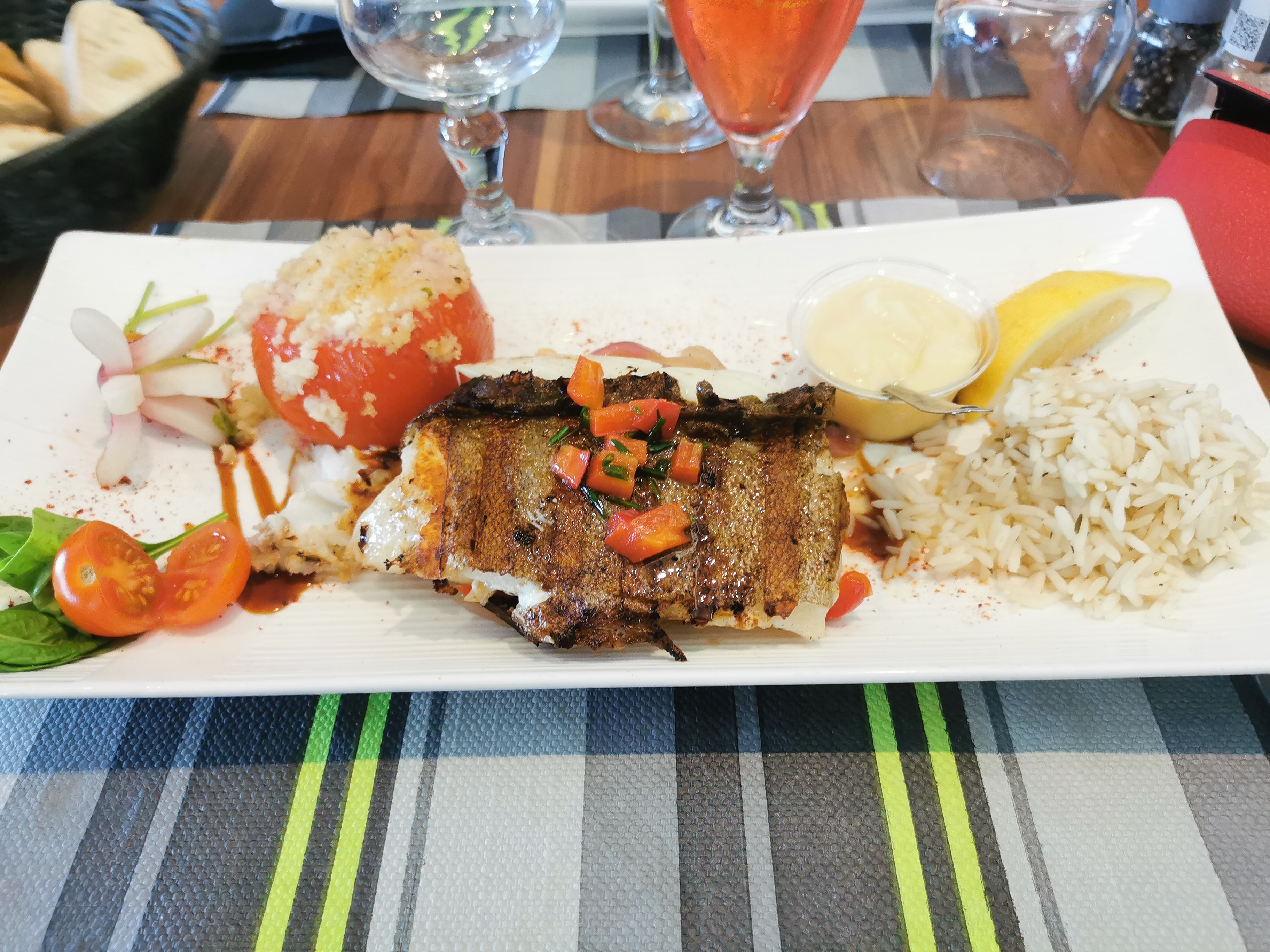 Après avoir amarré le bateau, nous nous sommes installés pour boire un verre. Puis au vu de la carte et de l'accueil reçu, nous avons décidé de rester pour déjeuner et nous ne l'avons pas regretté. Pour moi ce fut le cabillaud à l'aïoli, la cuisson du poisson était juste parfaite !