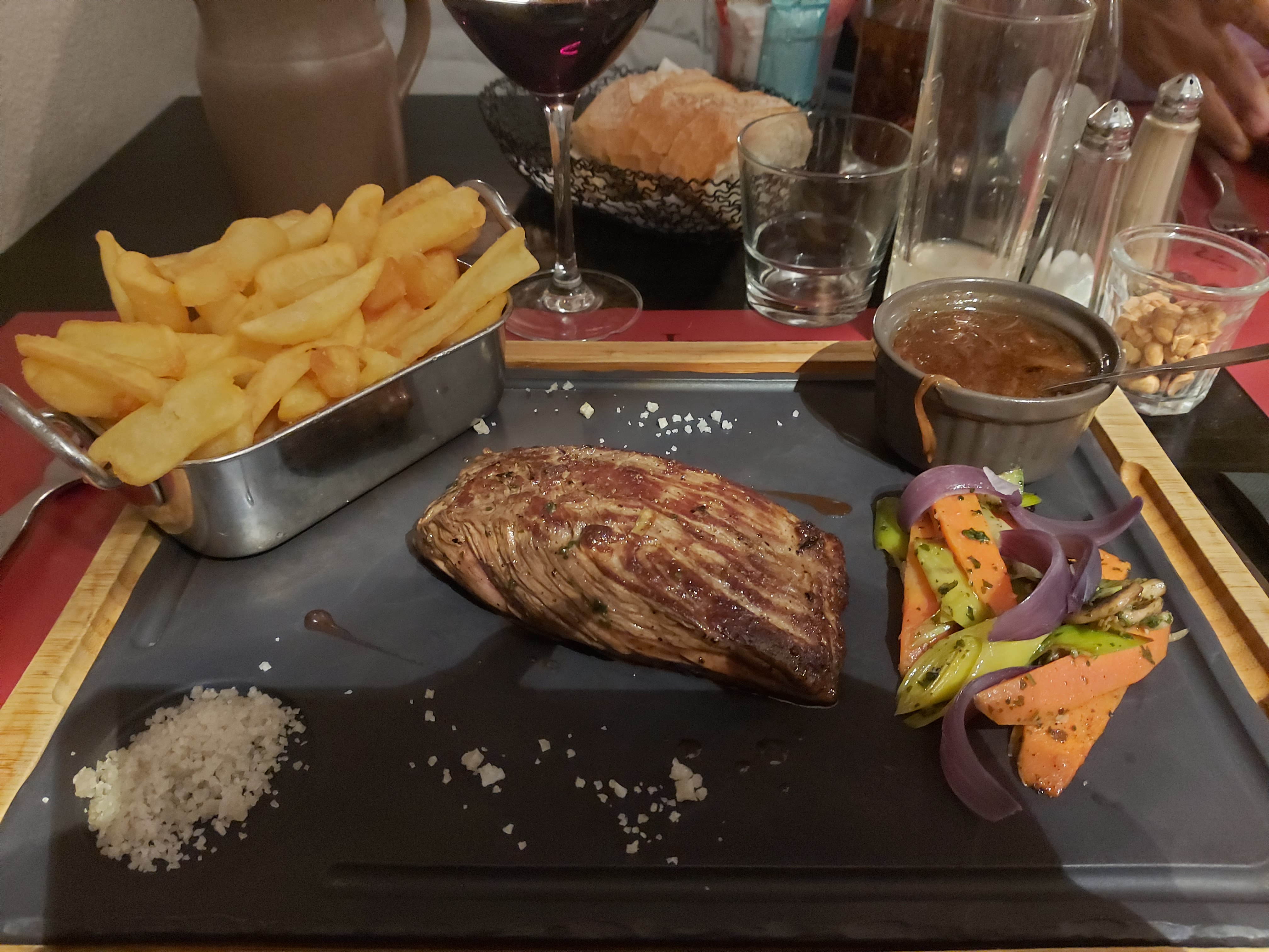Le cadre est certes agréable avec les pierres. Pas de pain à table, une petite carafe d eau pour 4 qui oblige à en demander régulièrement (je plains les serveurs qui doivent faire les allées retours). La viande est fraîche et de qualité, pas de légumes en accompagnement. Laissez nous le temps d arriver pour les commandes...