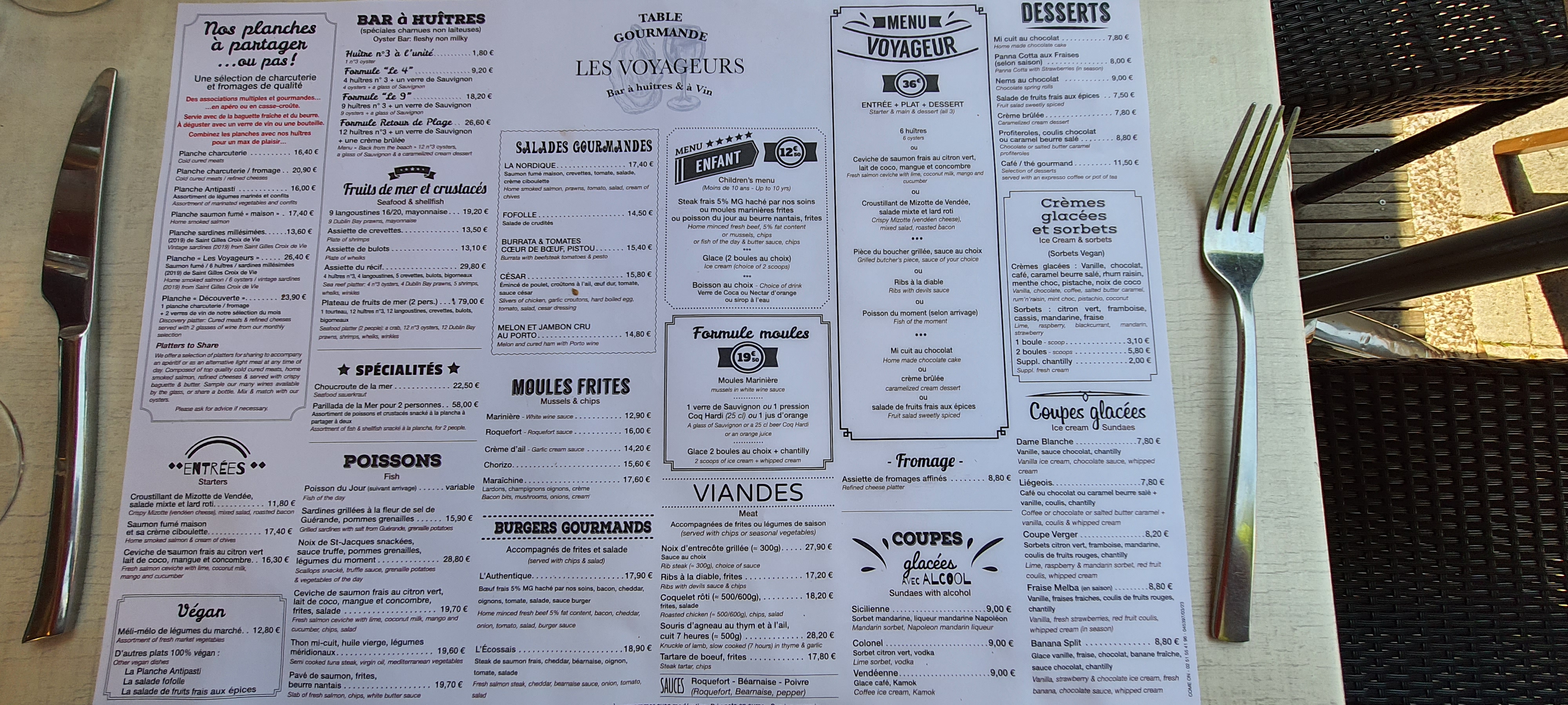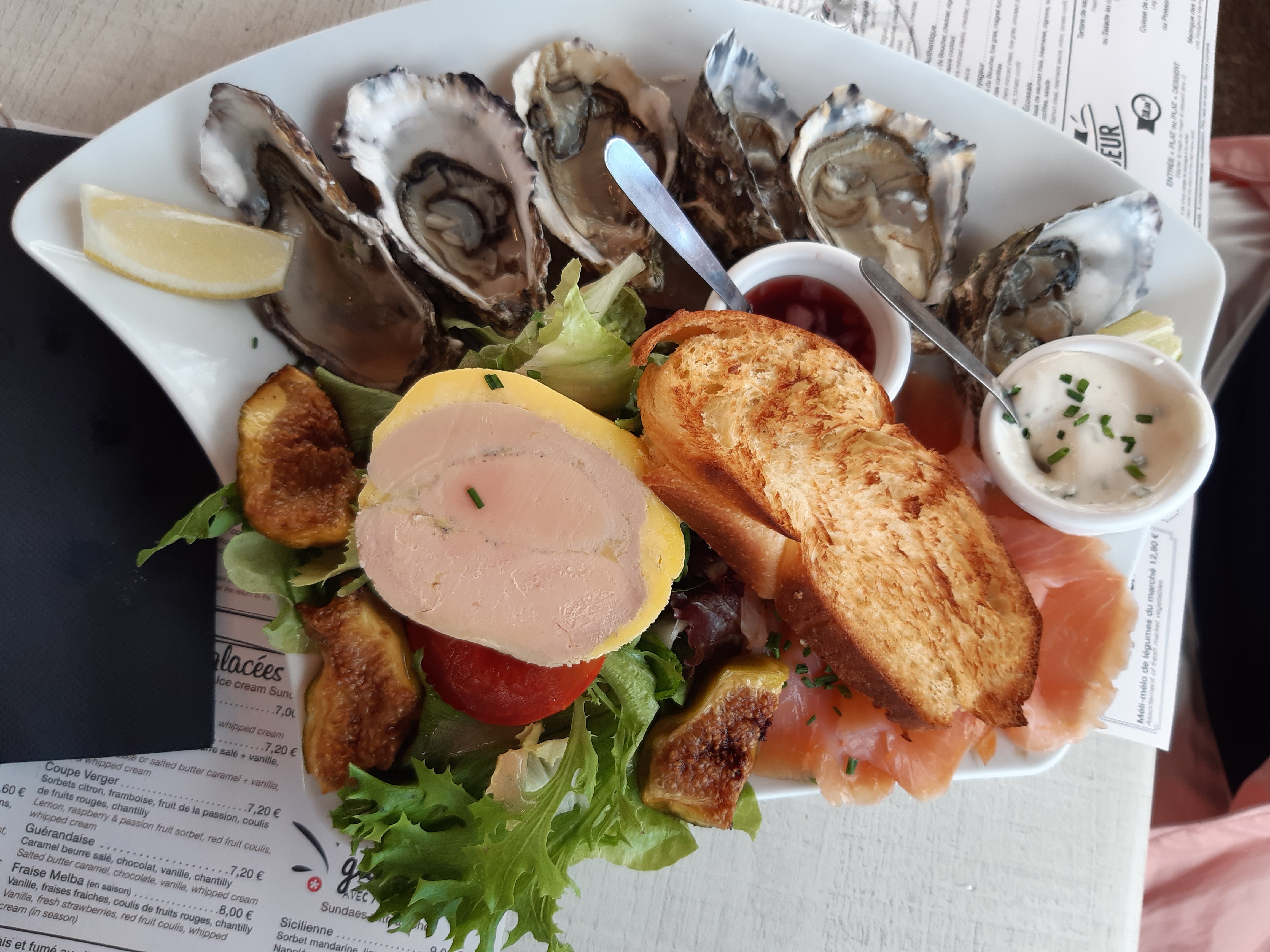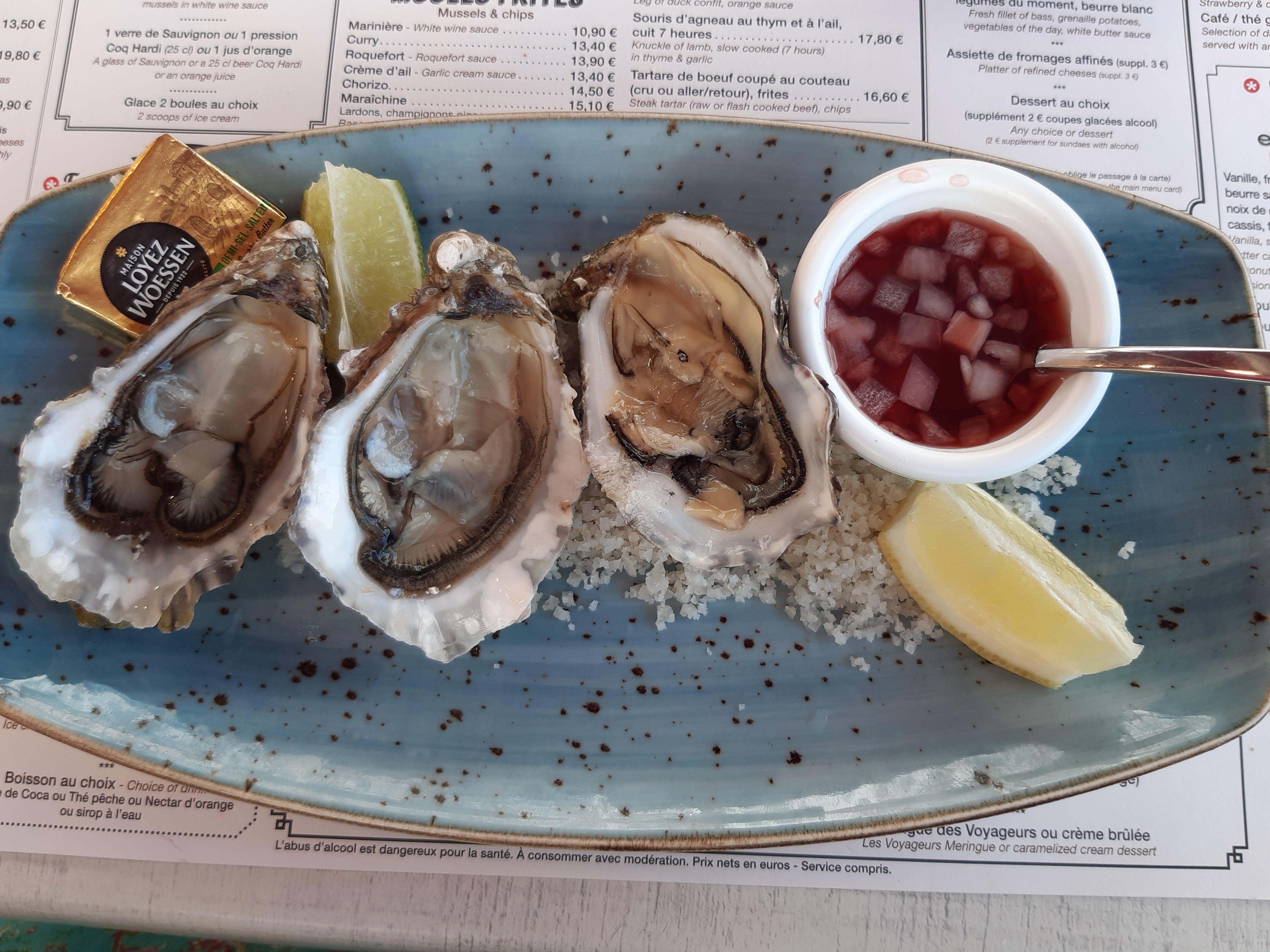 Tres bon acceuil et service efficace . Les huitres et les moules sont très bonnes ainsi que le foie gras et le saumon fumé maison. Le seul point négatif sur la planche des voyageurs c'est le gros sel sous les huitres qui a tendance à se rependre sur la salade, le saumon et le foie gras. Tres bon café.