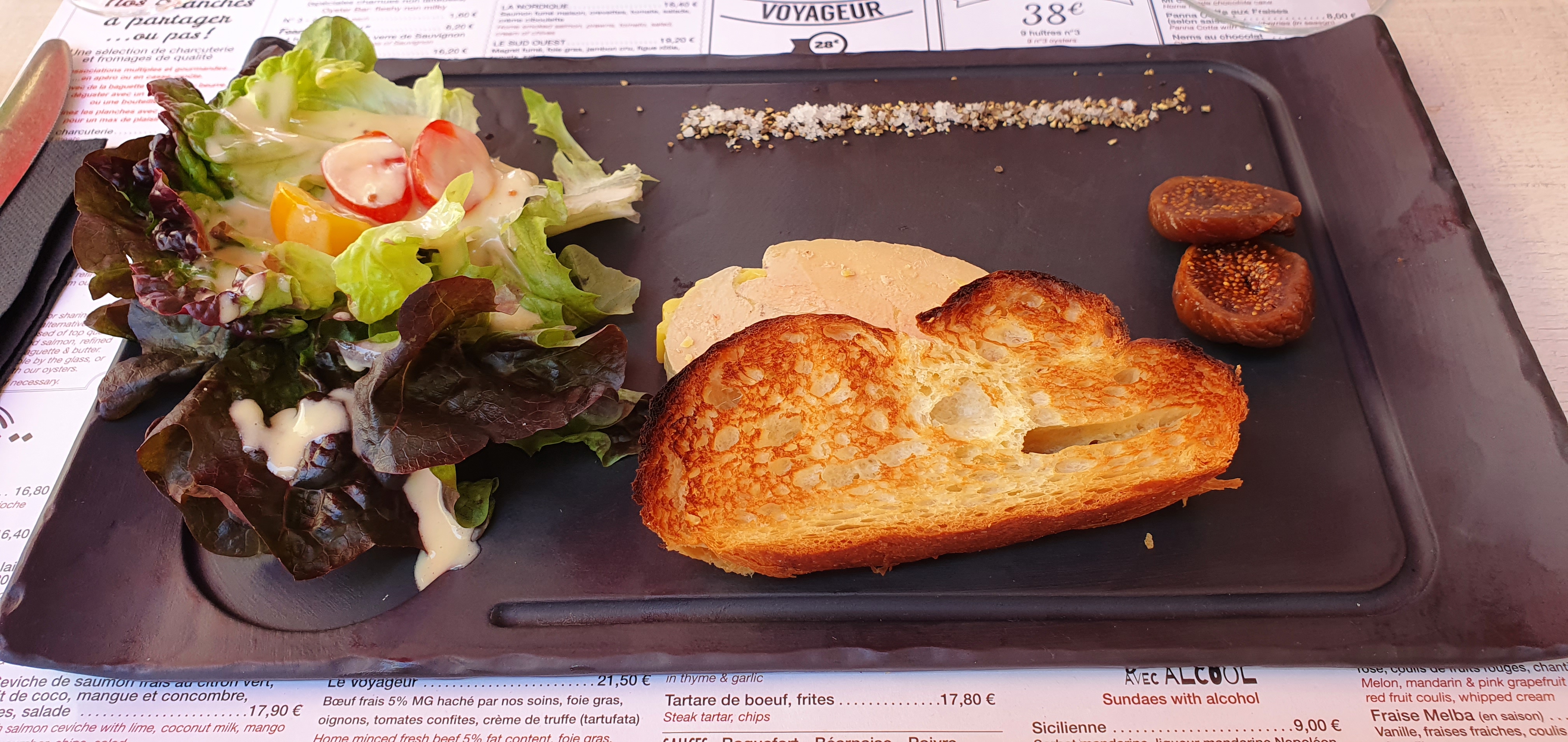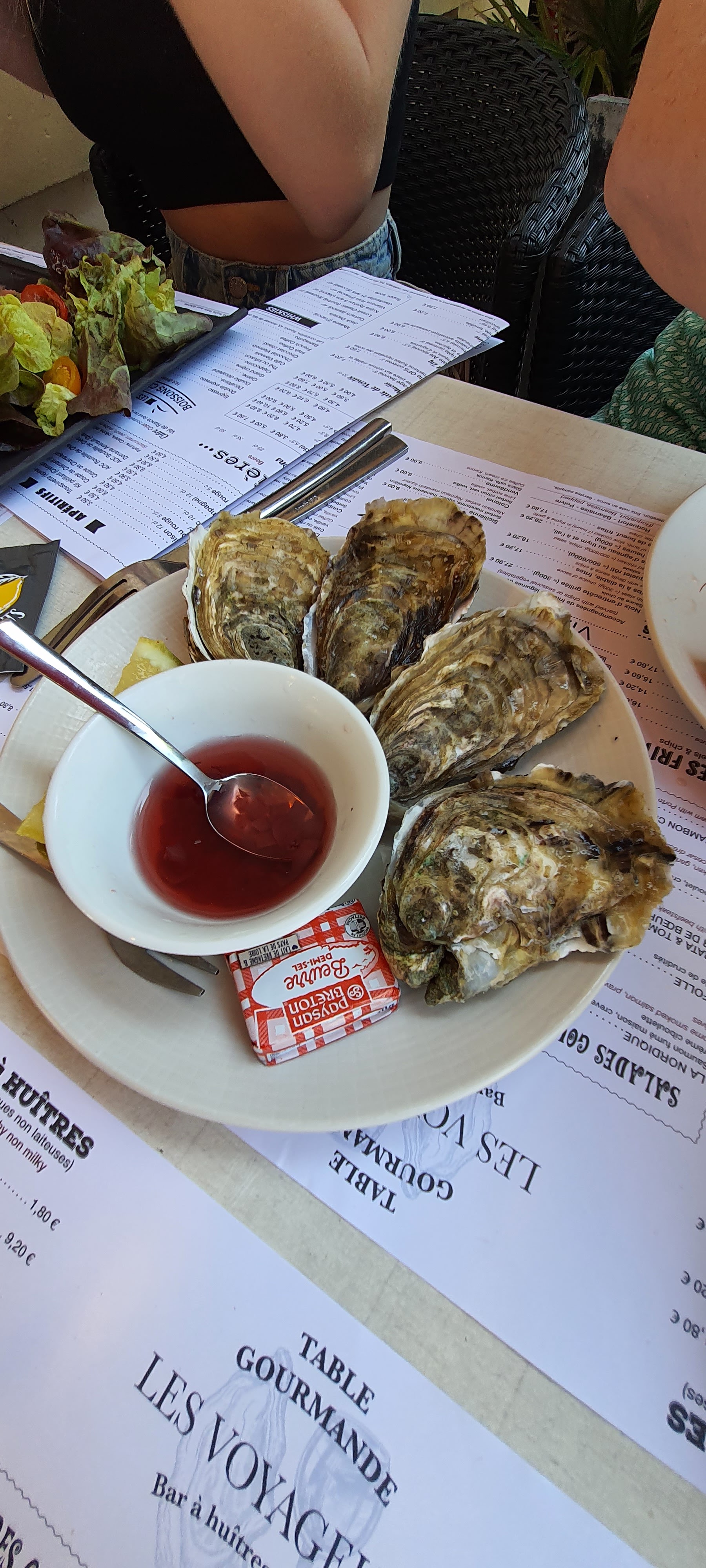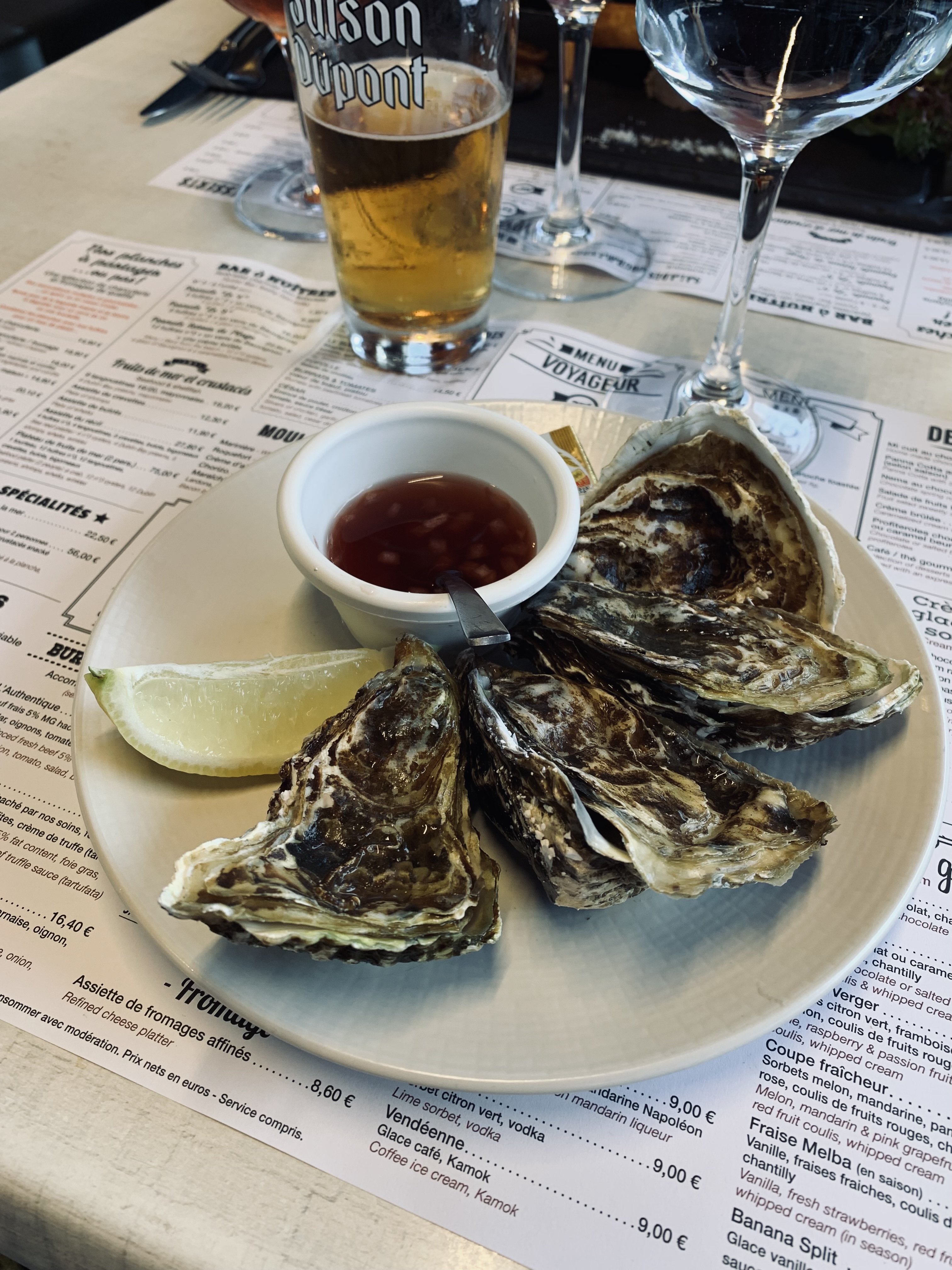 Tres bon acceuil et service efficace . Les huitres et les moules sont très bonnes ainsi que le foie gras et le saumon fumé maison. Le seul point négatif sur la planche des voyageurs c'est le gros sel sous les huitres qui a tendance à se rependre sur la salade, le saumon et le foie gras. Tres bon café.