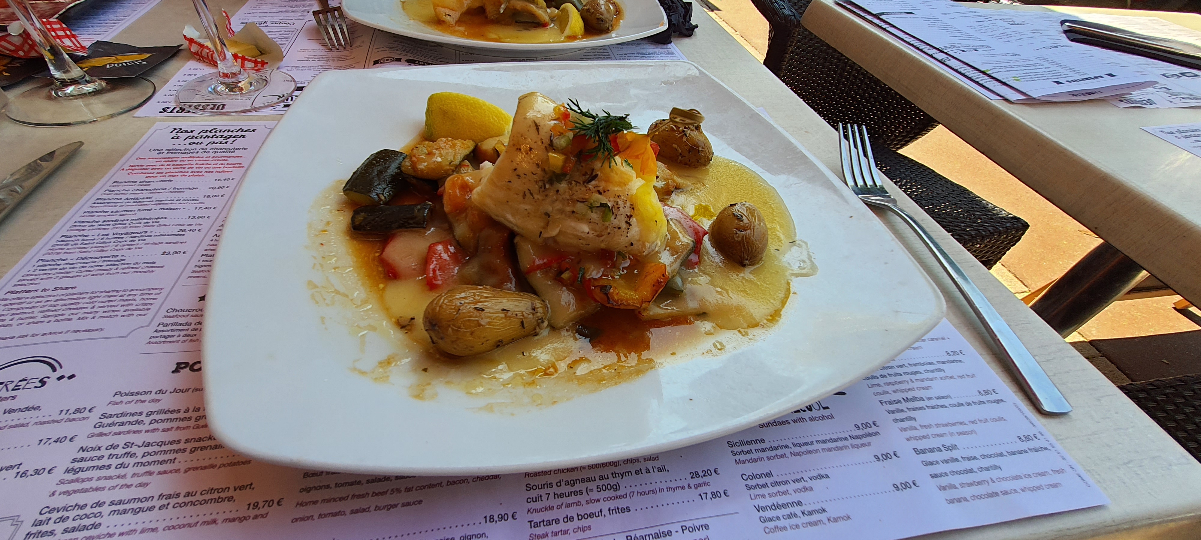 Nous avons très bien mangé : sardines, menu du voyageur et même un menu végé avec un meli melo de Légumes (un Tian). Le tout avec un bon petit vin blanc et le service avec le sourire.