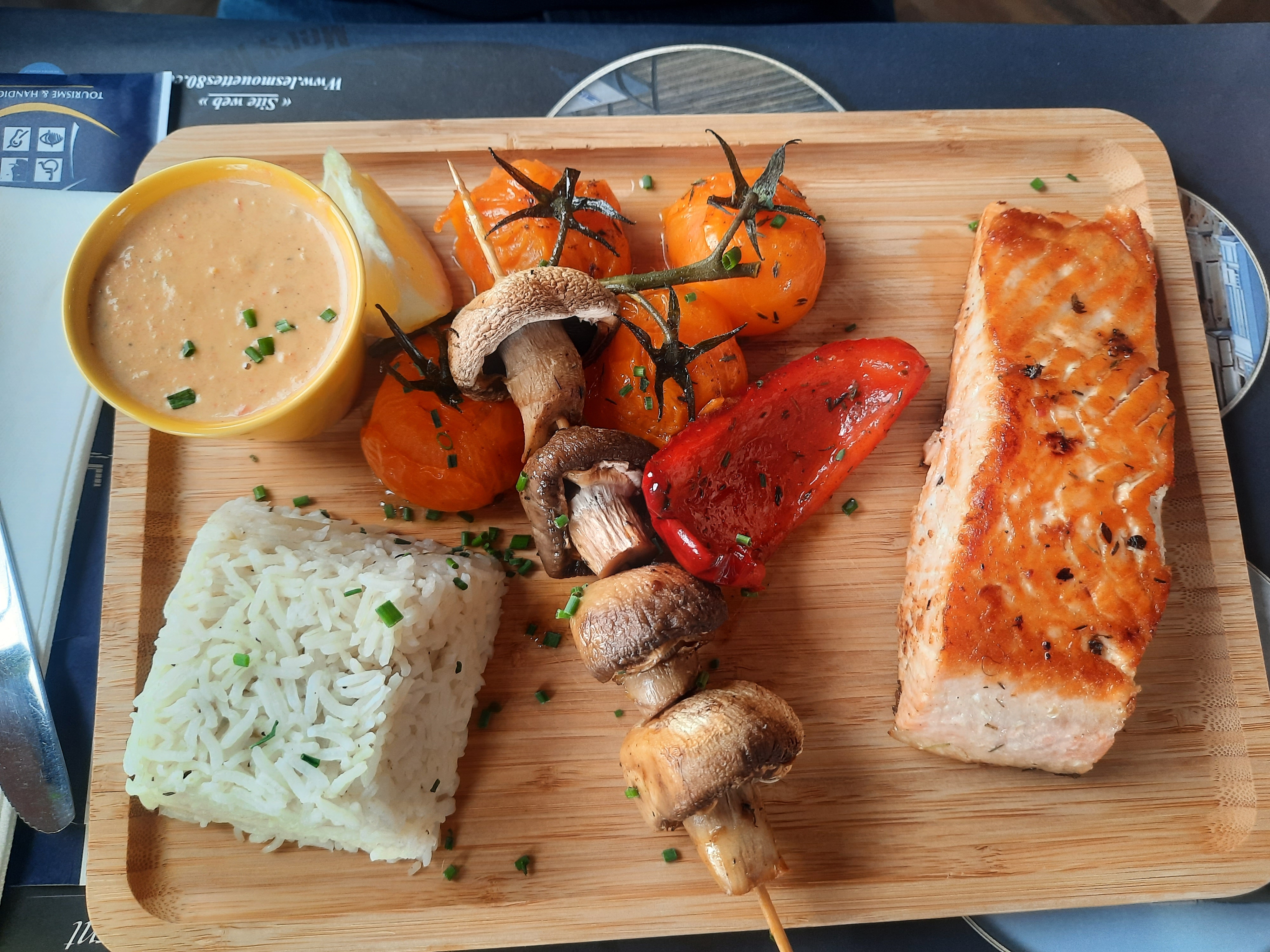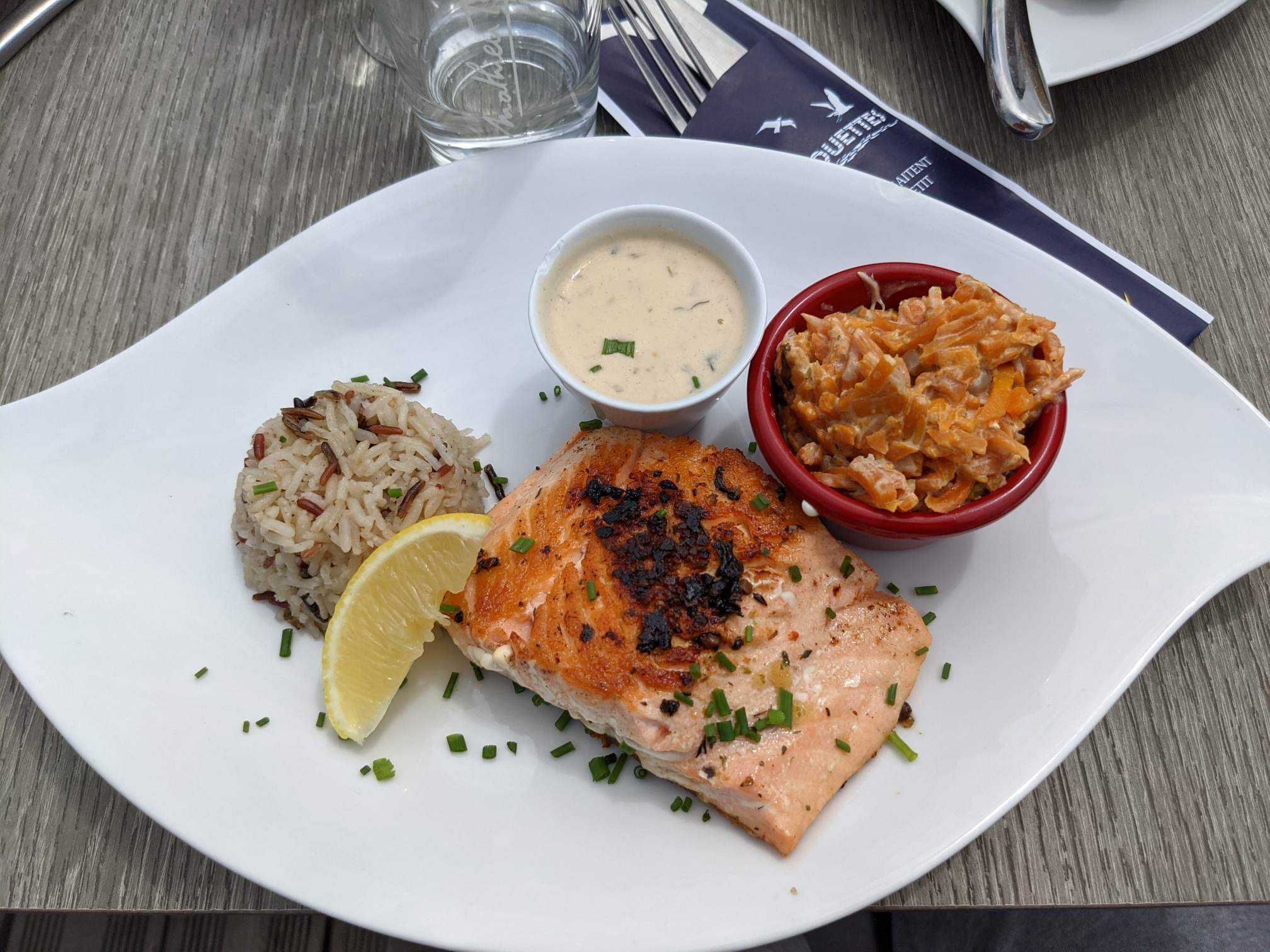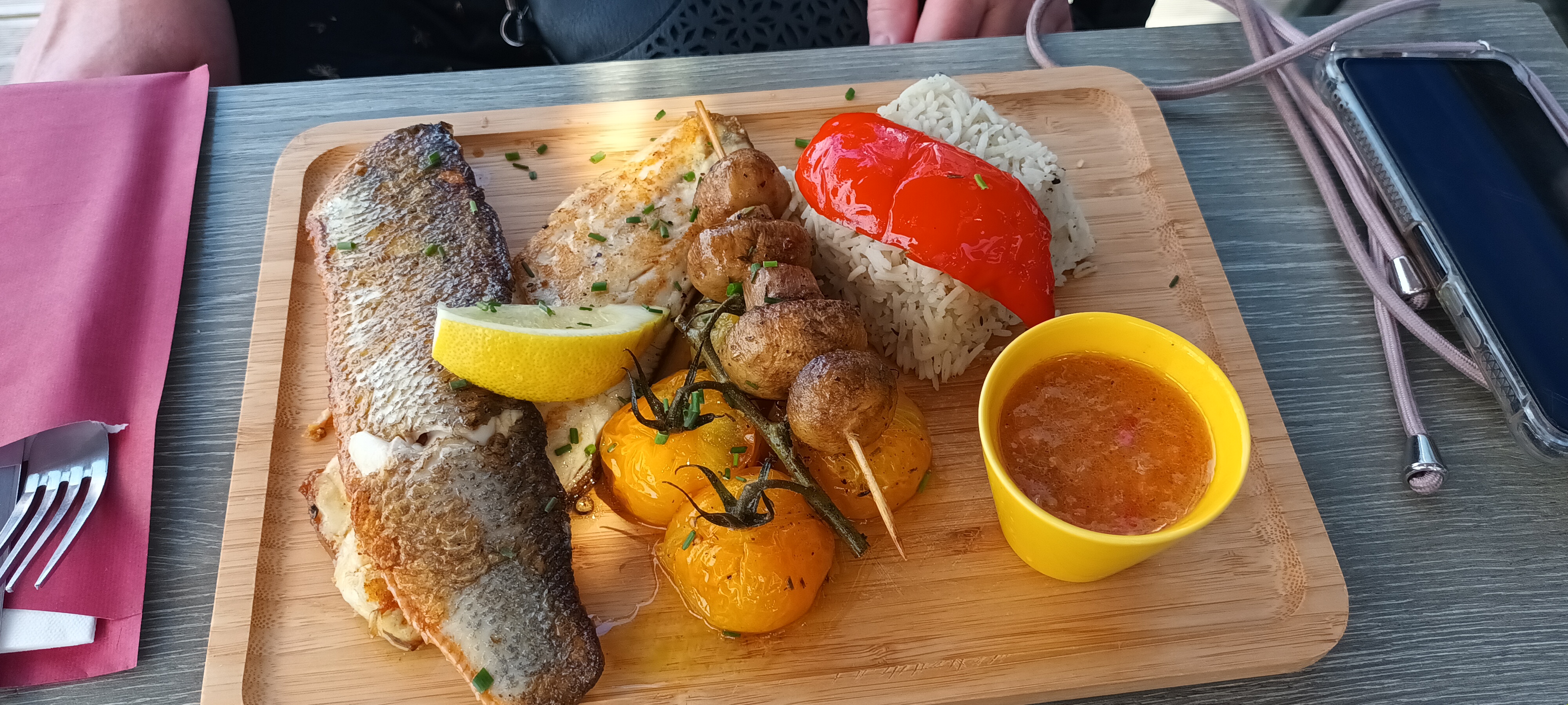 Repas simple, dos de cabillaud avec du riz, tomates cerise et sauce, servi tiède, dessert glace, le serveur m'apporte la facture avec le café alors que nous attendions toujours nos desserts qui était facturé, donc rappel de ma commande. J'ai été surpris de voir sur le panneau d'affichage que pour manger en terrasse c'était facturé 0.40 cts par personne. Déçu vu les commentaires