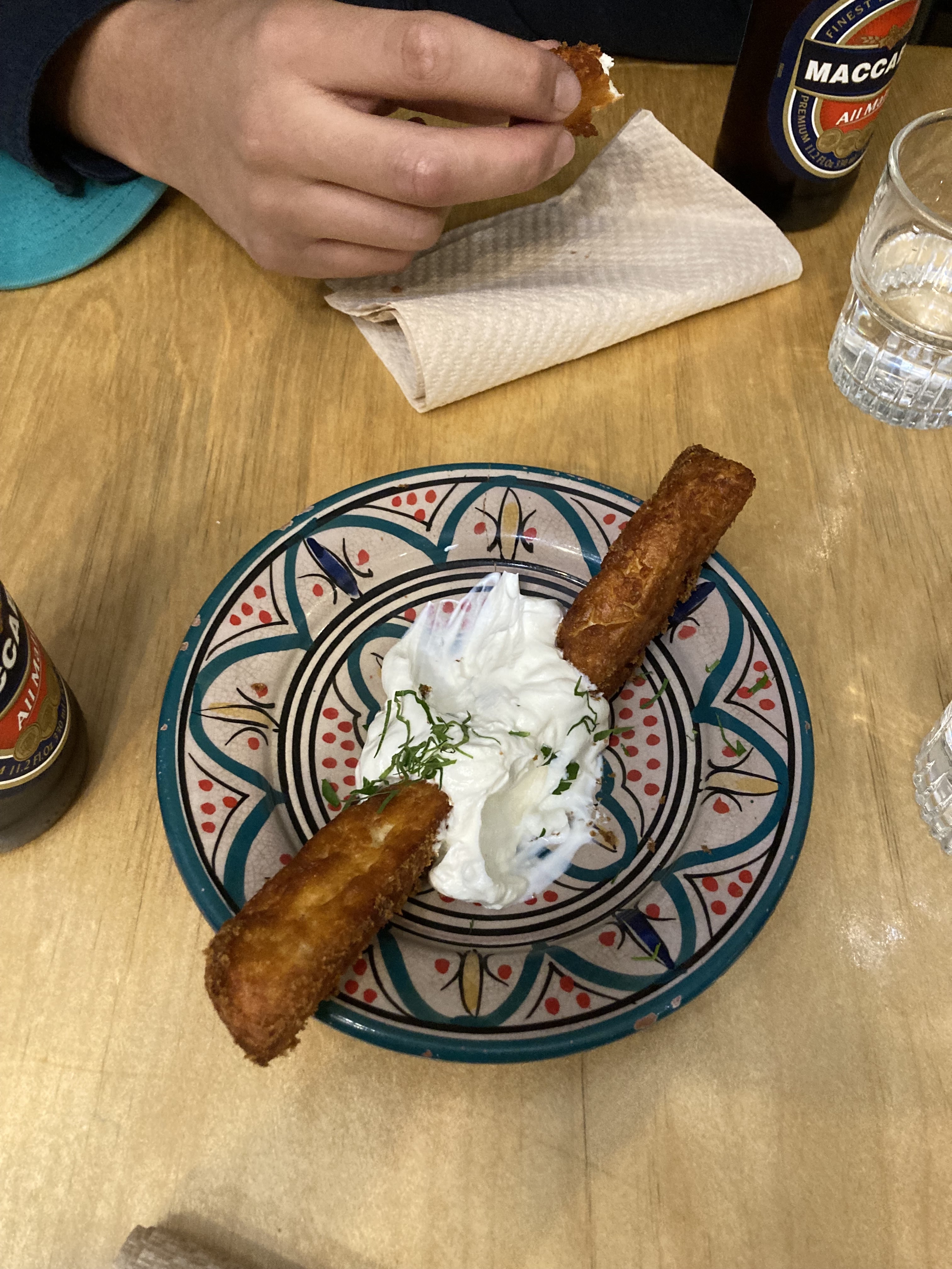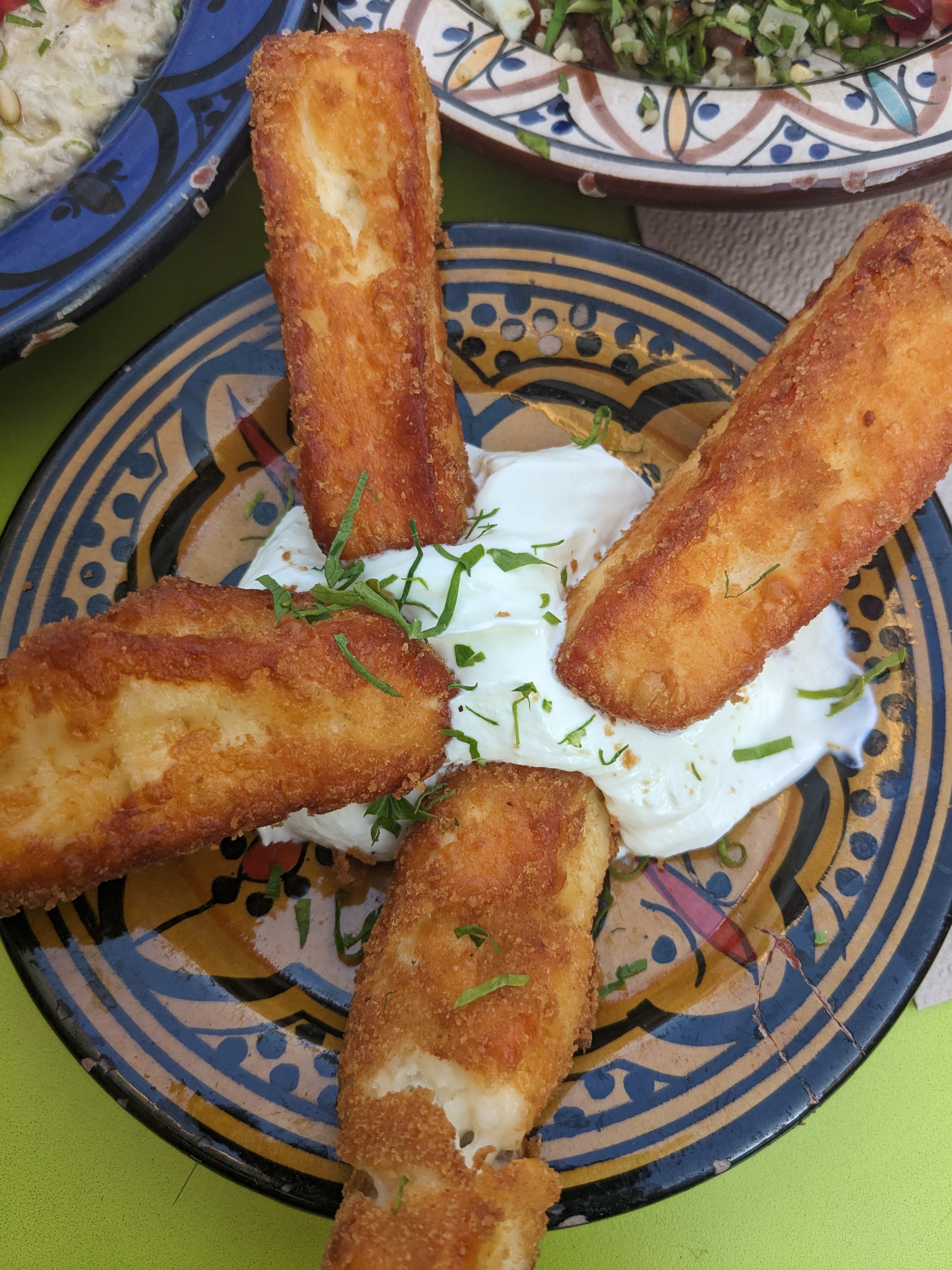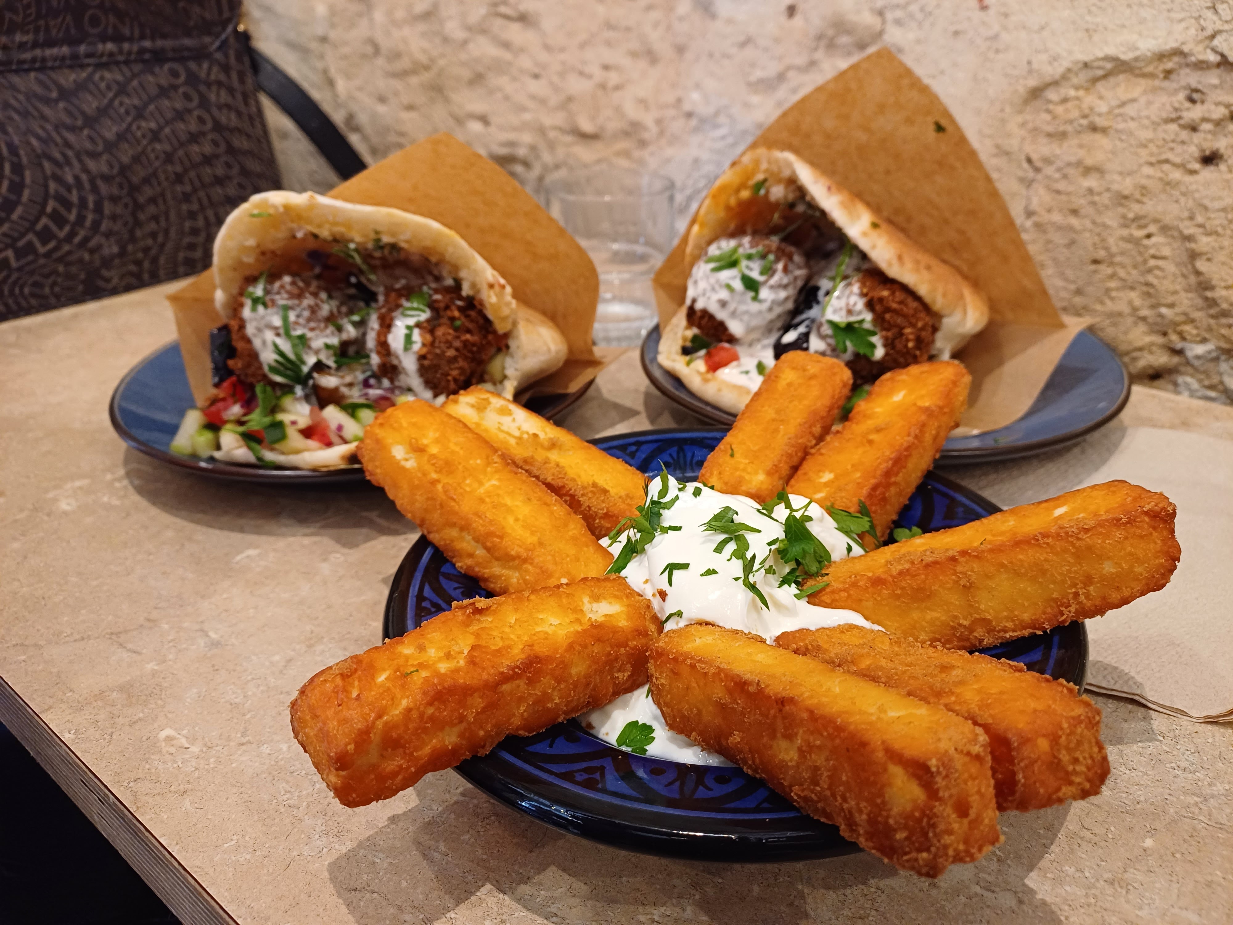 Déco sympa J'ai découvert les frites de halloumi =fromage (ressemble un peu à de la mozzarella pané et frit 6€ la portion de 4 bâtonnés. Pas trop salé pour un fromage mais en revanche un peu trop gras. Sauce blanche/mayo