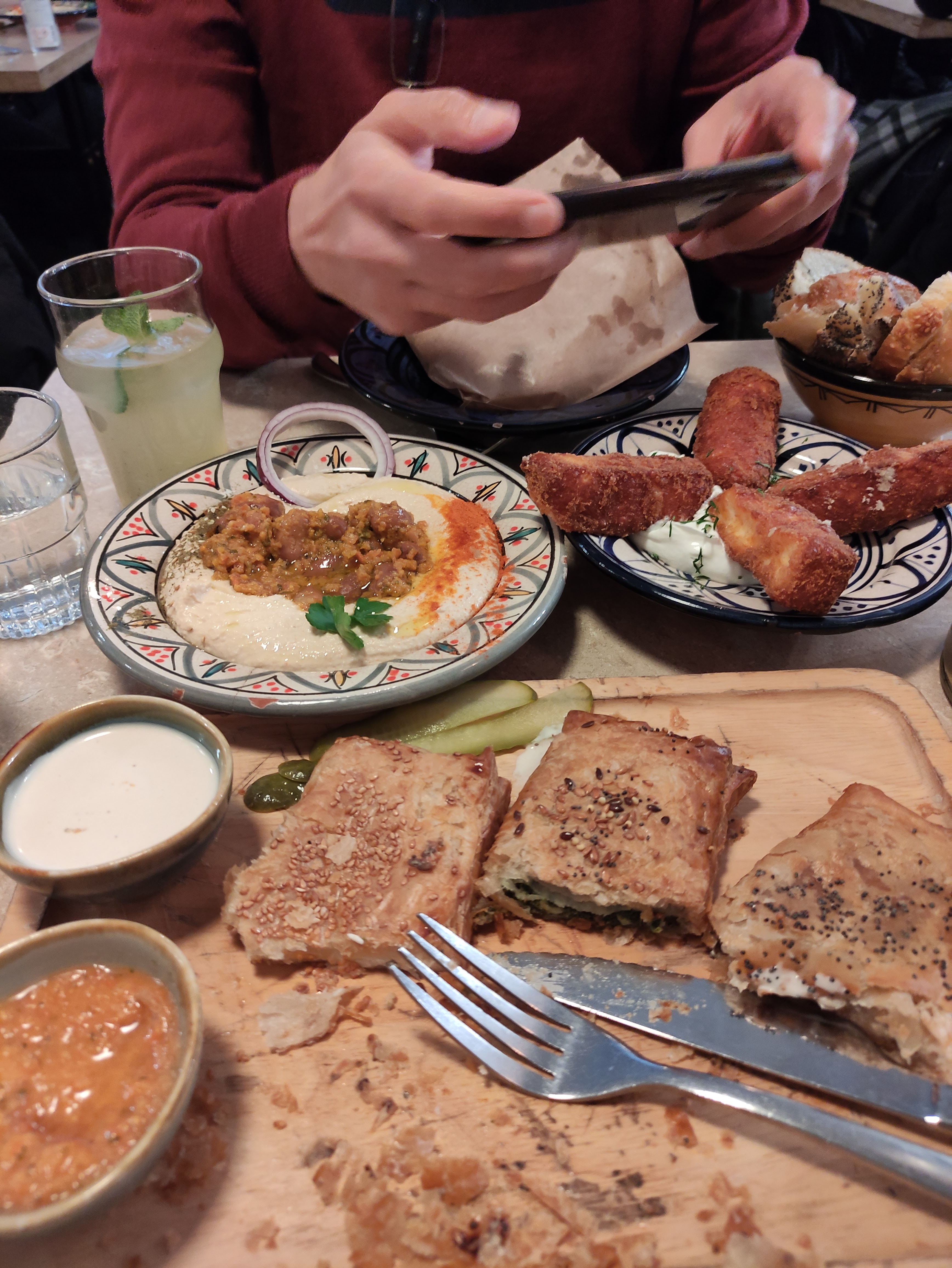 Plusieurs options de petits plats (végé) à partager. Le houmous est très bon, l’aubergine également. Les falafels, un tout petit peu trop cuits en revanche. La Shakshouka est bien copieuse, et l’ajout de fêta apporte un peu de fraîcheur. Les desserts n’ont pas fait long feu dans l’assiette, donc pas le temps de les prendre en photo… Mention spéciale au Babka perdu (fallait y penser) ! Personnel accueillant 🙌🏼