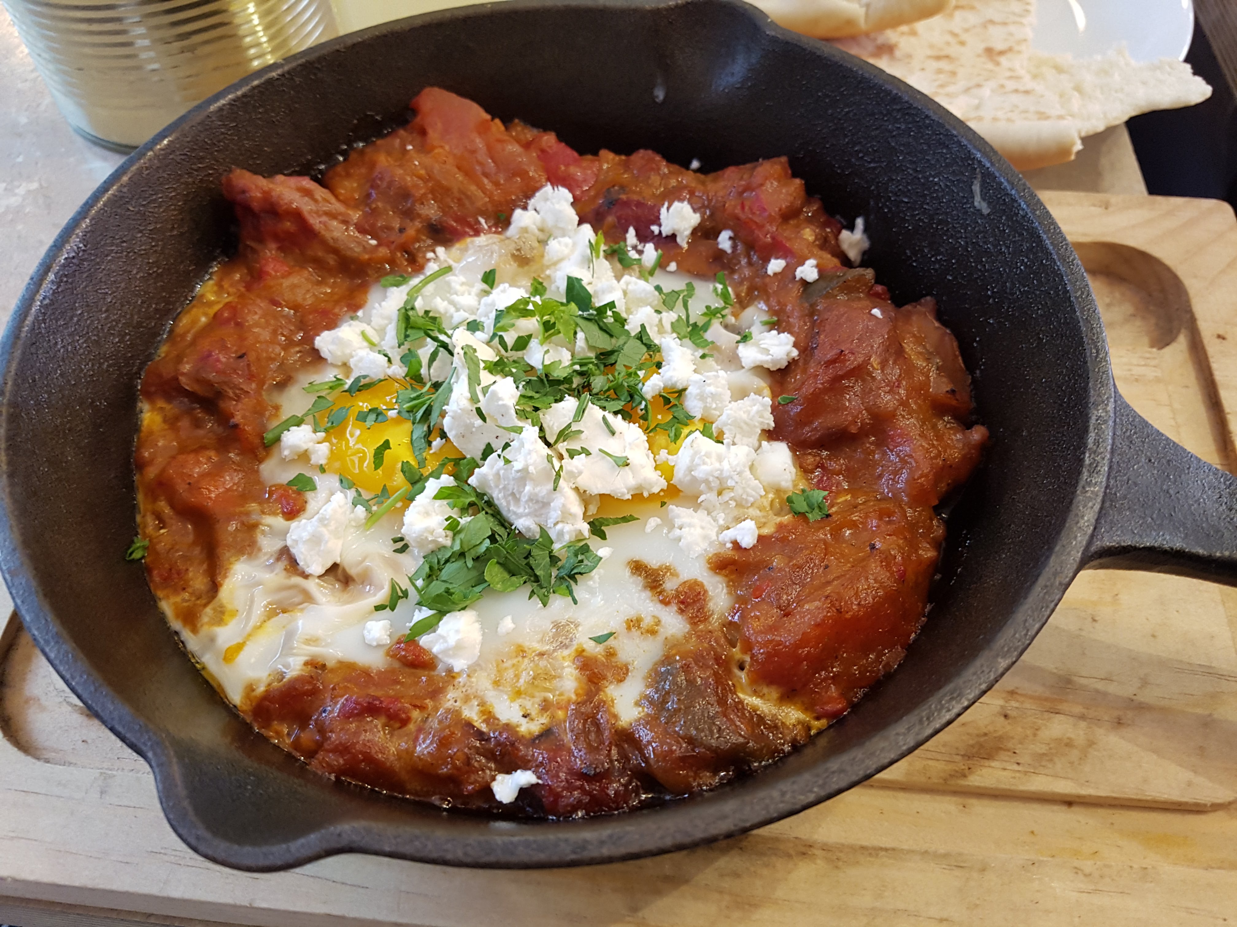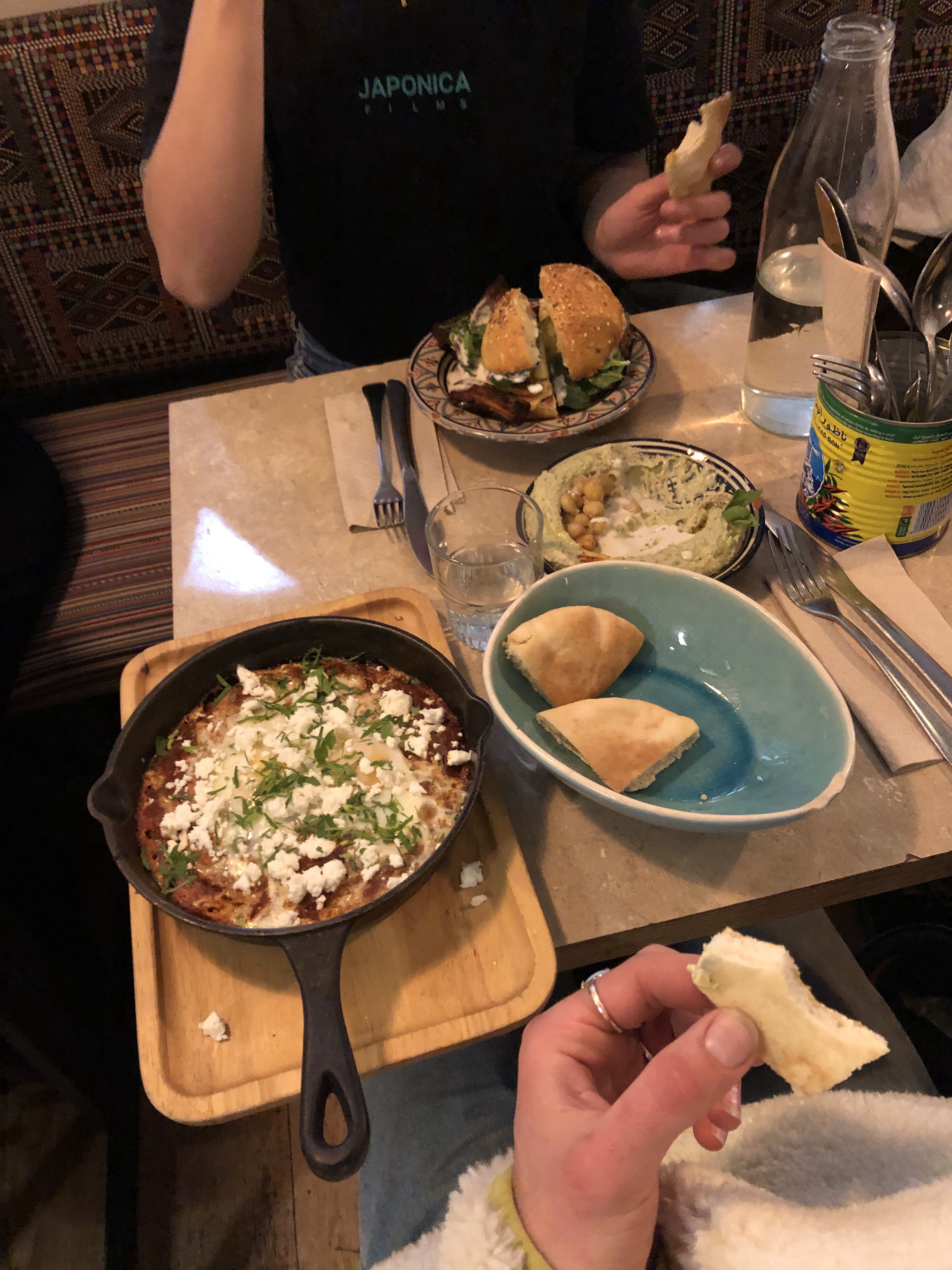 Explosion de saveurs pour un brunch ultra gourmand et copieux comme on aime. Ça change des œufs brouillés et des pancakes haha La chakchouka était vraiment bonne, assez pour deux. Le houmous était vraiment délicieux. Les frites de halloumi (fromage frit) étaient incroyables ! Et pour le dessert des crêpes vraiment bonnes !