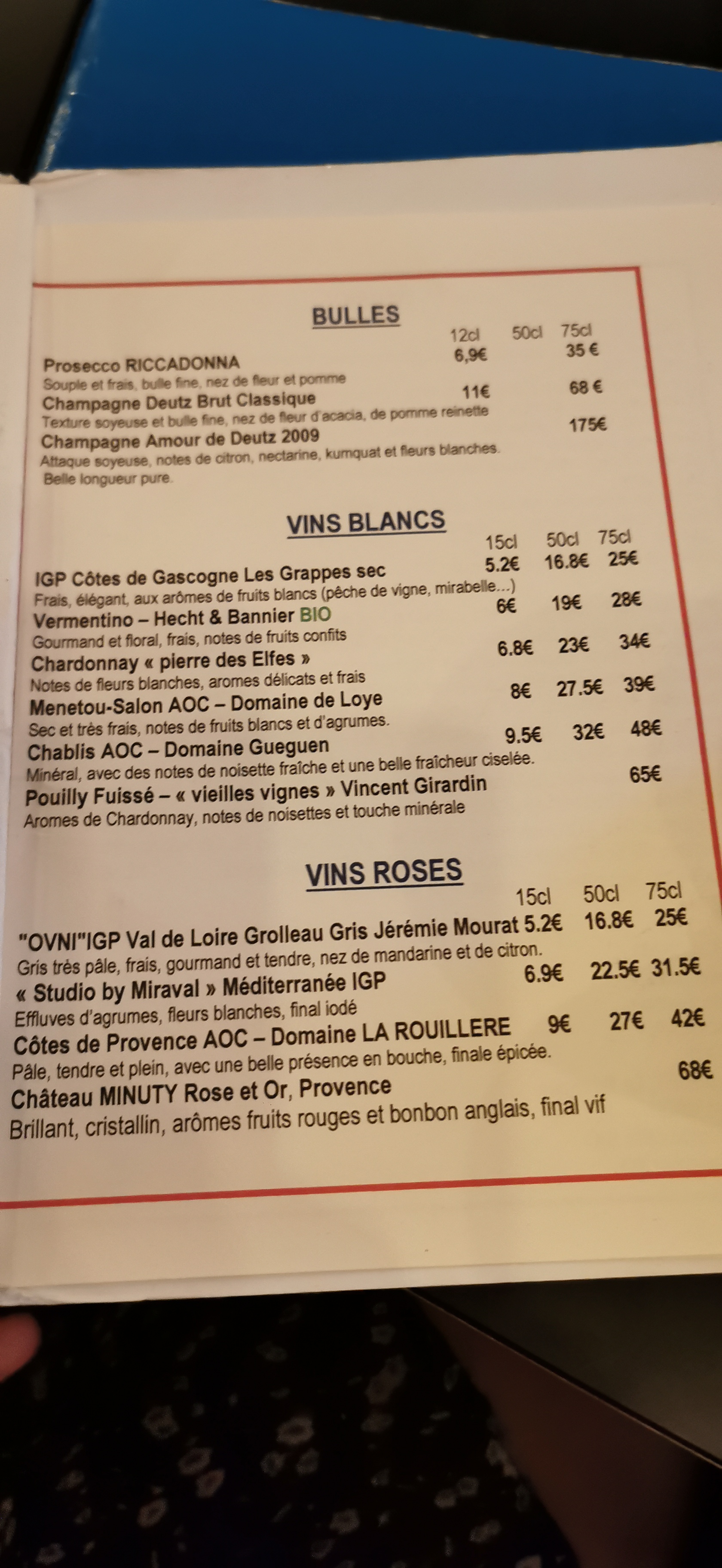 Bonjour Quand je suis venu le 06/12 avec mes collègues on m'a proposé uniquement unchoix très limité par rapport à l'ardoise Cela explique mon avis négatif Je n'ai pas eu accès à la carte