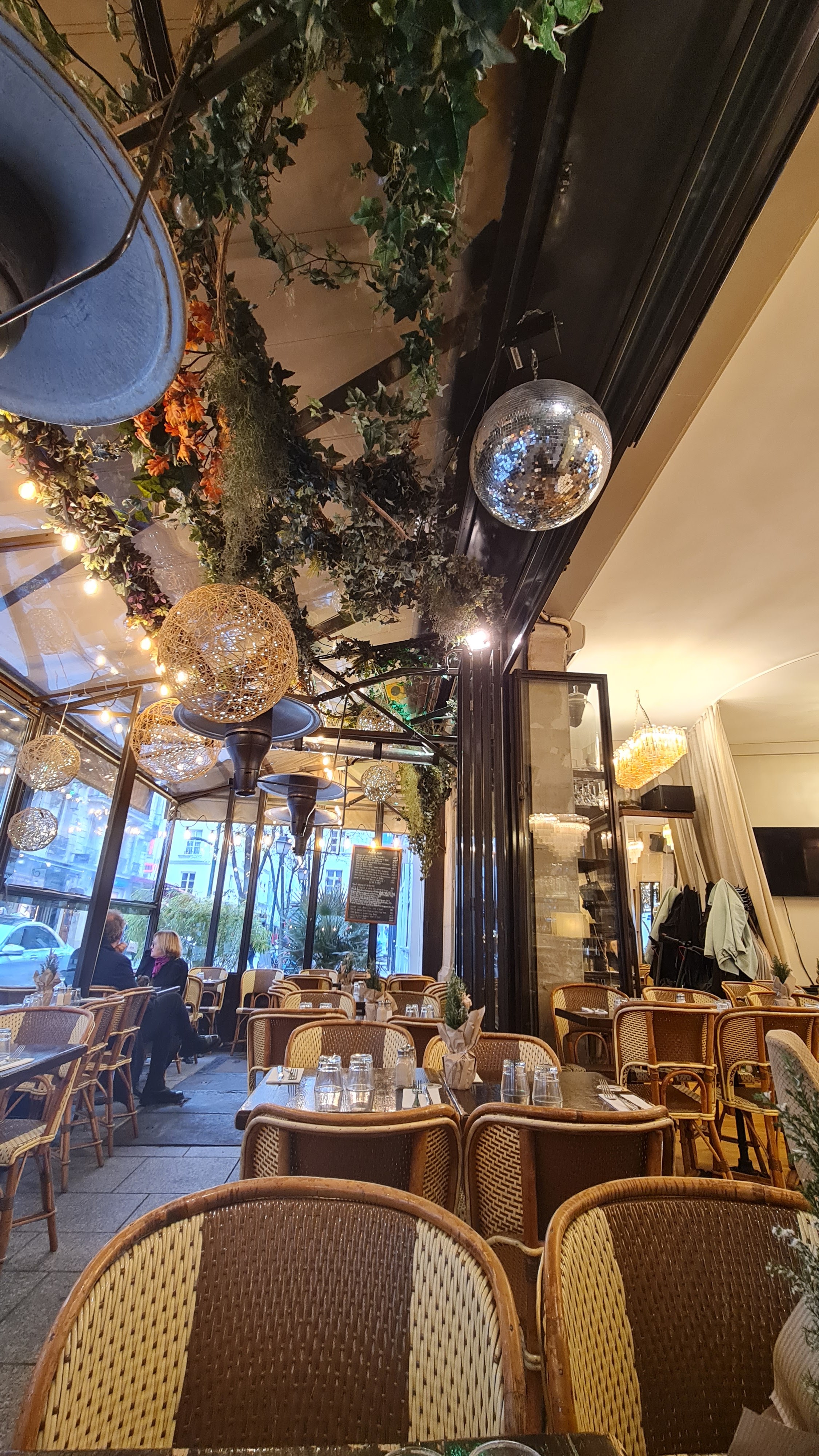 Cadre superbe : plantes au plafond, toute en verrière avec boules de lumière qui se reflètent. Accueil chaleureux , sympathique, service professionnel et efficace ! Et c’est bon ! Cela sera un beau souvenir dans notre espapade parisienne ! Bravo !